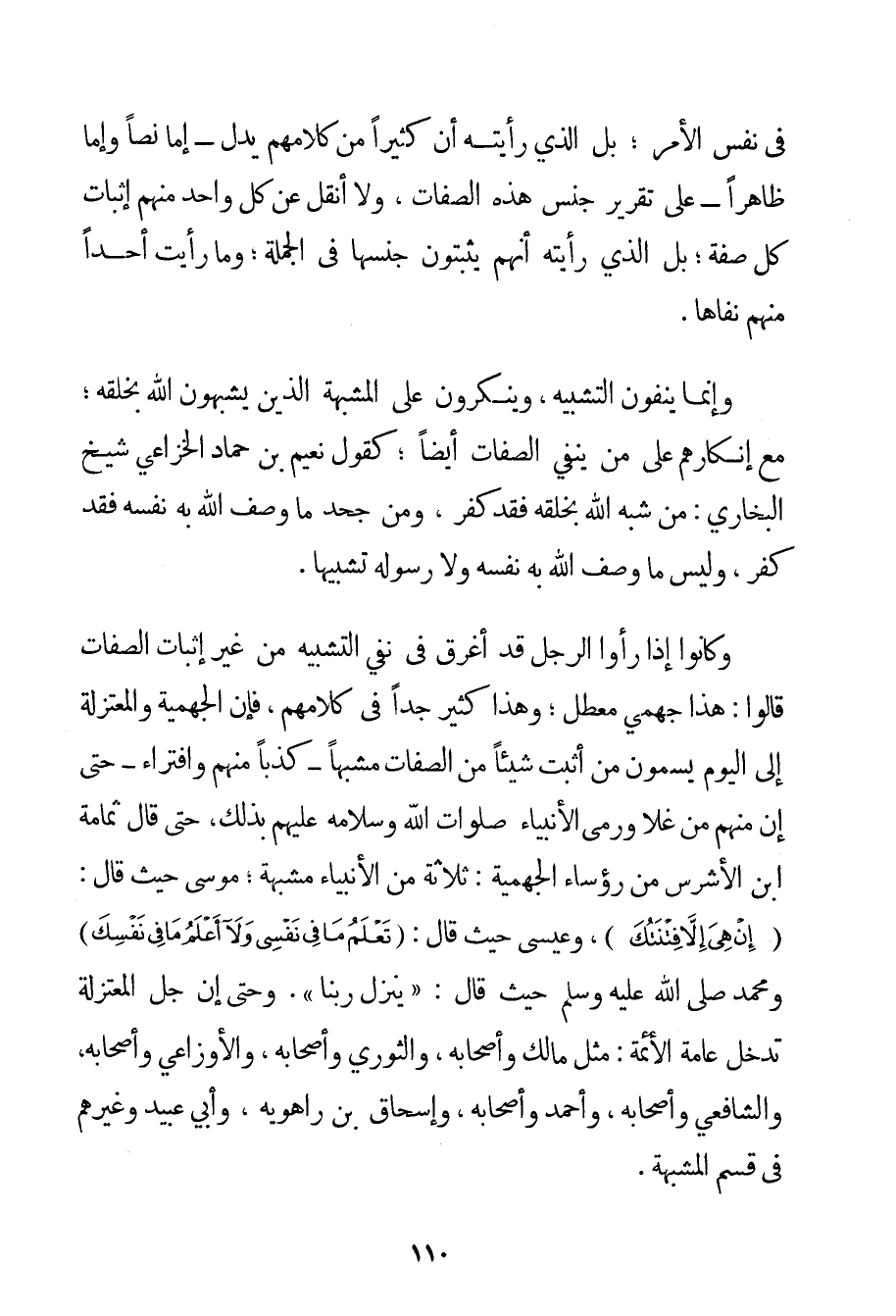 فِي نَفْسِ الْأَمْرِ؛ بَلْ الَّذِي رَأَيْته أَنَّ كَثِيرًا مِنْ كَلَامِهِمْ يَدُلُّ - إمَّا نَصًّا وَإِمَّا ظَاهِرًا - عَلَى تَقْرِيرِ جِنْسِ هَذِهِ الصِّفَاتِ وَلَا أَنْقُلُ عَنْ كُلِّ وَاحِدٍ مِنْهُمْ إثْبَاتَ كُلِّ صِفَةٍ؛ بَلْ الَّذِي رَأَيْته أَنَّهُمْ يُثْبِتُونَ جِنْسَهَا فِي الْجُمْلَةِ؛ وَمَا رَأَيْت أَحَدًا مِنْهُمْ نَفَاهَا. وَإِنَّمَا يَنْفُونَ التَّشْبِيهَ وَيُنْكِرُونَ عَلَى الْمُشَبِّهَةِ الَّذِينَ يُشَبِّهُونَ اللَّهَ بِخَلْقِهِ؛ مَعَ إنْكَارِهِمْ عَلَى مَنْ يَنْفِي الصِّفَاتِ أَيْضًا؛ كَقَوْلِ نُعَيْمِ بْنِ حَمَّادٍ الخزاعي شَيْخِ الْبُخَارِيِّ: مَنْ شَبَّهَ اللَّهَ بِخَلْقِهِ فَقَدْ كَفَرَ وَمَنْ جَحَدَ مَا وَصَفَ اللَّهُ بِهِ نَفْسَهُ فَقَدْ كَفَرَ وَلَيْسَ مَا وَصَفَ اللَّهُ بِهِ نَفْسَهُ وَلَا رَسُولُهُ تَشْبِيهًا. وَكَانُوا إذَا رَأَوْا الرَّجُلَ قَدْ أَغْرَقَ فِي نَفْيِ التَّشْبِيهِ مِنْ غَيْرِ إثْبَاتِ الصِّفَاتِ قَالُوا: هَذَا جهمي مُعَطِّلٌ؛ وَهَذَا كَثِيرٌ جِدًّا فِي كَلَامِهِمْ فَإِنَّ الْجَهْمِيَّة وَالْمُعْتَزِلَةَ إلَى الْيَوْمِ يُسَمُّونَ مَنْ أَثْبَتَ شَيْئًا مِنْ الصِّفَاتِ مُشَبِّهًا - كَذِبًا مِنْهُمْ وَافْتِرَاءً - حَتَّى إنَّ مِنْهُمْ مَنْ غَلَا وَرَمَى الْأَنْبِيَاءَ صَلَوَاتُ اللَّهِ وَسَلَامُهُ عَلَيْهِمْ بِذَلِكَ حَتَّى قَالَ ثُمَامَةُ بْنُ الْأَشْرَسِ مِنْ رُؤَسَاءَ الْجَهْمِيَّة: ثَلَاثَةٌ مِنْ الْأَنْبِيَاءِ مُشَبِّهَةٌ؛ مُوسَى حَيْثُ قَالَ: {إنْ هِيَ إلَّا فِتْنَتُكَ} وَعِيسَى حَيْثُ قَالَ: {تَعْلَمُ مَا فِي نَفْسِي وَلَا أَعْلَمُ مَا فِي نَفْسِكَ} وَمُحَمَّدٌ صَلَّى اللَّهُ عَلَيْهِ وَسَلَّمَ حَيْثُ قَالَ: {يَنْزِلُ رَبُّنَا} . وَحَتَّى إنَّ جُلَّ الْمُعْتَزِلَةِ تُدْخِلُ عَامَّةَ الْأَئِمَّةِ: مِثْلَ مَالِكٍ وَأَصْحَابِهِ وَالثَّوْرِيِّ وَأَصْحَابِهِ وَالْأَوْزَاعِي وَأَصْحَابِهِ وَالشَّافِعِيِّ وَأَصْحَابِهِ وَأَحْمَد وَأَصْحَابِهِ وَإِسْحَاقَ بْنِ رَاهَوَيْه وَأَبِي عُبَيْدٍ وَغَيْرِهِمْ فِي قِسْمِ الْمُشَبِّهَةِ.