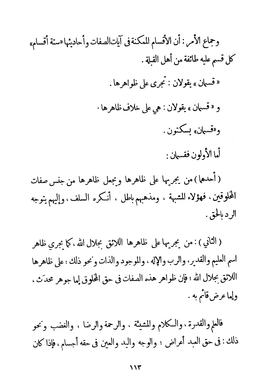 وَجِمَاعُ الْأَمْرِ: أَنَّ الْأَقْسَامَ الْمُمْكِنَةَ فِي آيَاتِ الصِّفَاتِ وَأَحَادِيثِهَا " سِتَّةُ أَقْسَامٍ " كُلُّ قِسْمٍ عَلَيْهِ طَائِفَةٌ مِنْ أَهْلِ الْقِبْلَةِ. " قِسْمَانِ " يَقُولَانِ: تَجْرِي عَلَى ظَوَاهِرِهَا. و " قِسْمَانِ " يَقُولَانِ: هِيَ عَلَى خِلَافِ ظَاهِرِهَا. و " قِسْمَانِ " يَسْكُتُونَ. أَمَّا الْأَوَّلُونَ فَقِسْمَانِ: (أَحَدُهُمَا مَنْ يُجْرِيهَا عَلَى ظَاهِرِهَا وَيَجْعَلُ ظَاهِرَهَا مِنْ جِنْسِ صِفَاتِ الْمَخْلُوقِينَ فَهَؤُلَاءِ الْمُشْبِهَةُ وَمَذْهَبُهُمْ بَاطِلٌ أَنْكَرَهُ السَّلَفُ وَإِلَيْهِمْ يَتَوَجَّهُ الرَّدُّ بِالْحَقِّ. (الثَّانِي: مَنْ يُجْرِيهَا عَلَى ظَاهِرِهَا اللَّائِقِ بِجَلَالِ اللَّهِ كَمَا يُجْرِي ظَاهِرَ اسْمِ الْعَلِيمِ وَالْقَدِيرِ وَالرَّبِّ وَالْإِلَهِ وَالْمَوْجُودِ وَالذَّاتِ وَنَحْوَ ذَلِكَ؛ عَلَى ظَاهِرِهَا اللَّائِقِ بِجَلَالِ اللَّهِ؛ فَإِنَّ ظَوَاهِرَ هَذِهِ الصِّفَاتِ فِي حَقِّ الْمَخْلُوقِ إمَّا جَوْهَرٌ مُحْدَثٌ وَإِمَّا عَرَضٌ قَائِمٌ بِهِ. فَالْعِلْمُ وَالْقُدْرَةُ وَالْكَلَامُ وَالْمَشِيئَةُ وَالرَّحْمَةُ وَالرِّضَا وَالْغَضَبُ وَنَحْوُ ذَلِكَ: فِي حَقِّ الْعَبْدِ أَعْرَاضٌ؛ وَالْوَجْهُ وَالْيَدُ وَالْعَيْنُ فِي حَقِّهِ أَجْسَامٌ فَإِذَا كَانَ
