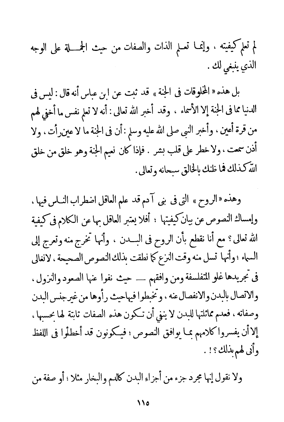 لَمْ تَعْلَمْ كَيْفِيَّتَهُ وَإِنَّمَا تَعْلَمُ الذَّاتَ وَالصِّفَاتِ مِنْ حَيْثُ الْجُمْلَةُ عَلَى الْوَجْهِ الَّذِي يَنْبَغِي لَك. بَلْ هَذِهِ " الْمَخْلُوقَاتُ فِي الْجَنَّةِ " قَدْ ثَبَتَ عَنْ ابْنِ عَبَّاسٍ أَنَّهُ قَالَ: لَيْسَ فِي الدُّنْيَا مِمَّا فِي الْجَنَّةِ إلَّا الْأَسْمَاءُ وَقَدْ أَخْبَرَ اللَّهُ تَعَالَى: أَنَّهُ لَا تَعْلَمُ نَفْسٌ مَا أُخْفِيَ لَهُمْ مِنْ قُرَّةِ أَعْيُنٍ وَأَخْبَرَ النَّبِيُّ صَلَّى اللَّهُ عَلَيْهِ وَسَلَّمَ أَنَّ فِي الْجَنَّةِ مَا لَا عَيْنٌ رَأَتْ وَلَا أُذُنٌ سَمِعَتْ وَلَا خَطَرَ عَلَى قَلْبِ بَشَرٍ. فَإِذَا كَانَ نَعِيمُ الْجَنَّةِ وَهُوَ خَلْقٌ مِنْ خَلْقِ اللَّهِ كَذَلِكَ فَمَا ظَنُّك بِالْخَالِقِ سُبْحَانَهُ وَتَعَالَى. وَهَذِهِ " الرُّوحُ " الَّتِي فِي بَنِي آدَمَ قَدْ عَلِمَ الْعَاقِلُ اضْطِرَابَ النَّاسِ فِيهَا وَإِمْسَاكَ النُّصُوصِ عَنْ بَيَانِ كَيْفِيَّتِهَا؛ أَفَلَا يَعْتَبِرُ الْعَاقِلُ بِهَا عَنْ الْكَلَامِ فِي كَيْفِيَّةِ اللَّهِ تَعَالَى؟ مَعَ أَنَّا نَقْطَعُ بِأَنَّ الرُّوحَ فِي الْبَدَنِ وَأَنَّهَا تَخْرُجُ مِنْهُ وَتَعْرُجُ إلَى السَّمَاءِ؛ وَأَنَّهَا تُسَلُّ مِنْهُ وَقْتَ النَّزْعِ كَمَا نَطَقَتْ بِذَلِكَ النُّصُوصُ الصَّحِيحَةُ لَا نُغَالِي فِي تَجْرِيدِهَا غُلُوَّ الْمُتَفَلْسِفَةِ وَمَنْ وَافَقَهُمْ - حَيْثُ نَفَوْا عَنْهَا الصُّعُودَ وَالنُّزُولَ وَالِاتِّصَالَ بِالْبَدَنِ وَالِانْفِصَالَ عَنْهُ وَتَخَبَّطُوا فِيهَا حَيْثُ رَأَوْهَا مِنْ غَيْرِ جِنْسِ الْبَدَنِ وَصِفَاتِهِ فَعَدَمُ مُمَاثَلَتِهَا لِلْبَدَنِ لَا يَنْفِي أَنْ تَكُونَ هَذِهِ الصِّفَاتُ ثَابِتَةً لَهَا بِحَسْبِهَا إلَّا أَنْ يُفَسِّرُوا كَلَامَهُمْ بِمَا يُوَافِقُ النُّصُوصَ؛ فَيَكُونُونَ قَدْ أَخْطَئُوا فِي اللَّفْظِ وَأَنَّى لَهُمْ بِذَلِكَ. وَلَا نَقُولُ إنَّهَا مُجَرَّدُ جُزْءٍ مِنْ أَجْزَاءِ الْبَدَنِ كَالدَّمِ وَالْبُخَارِ مَثَلًا؛ أَوْ صِفَةٌ مِنْ