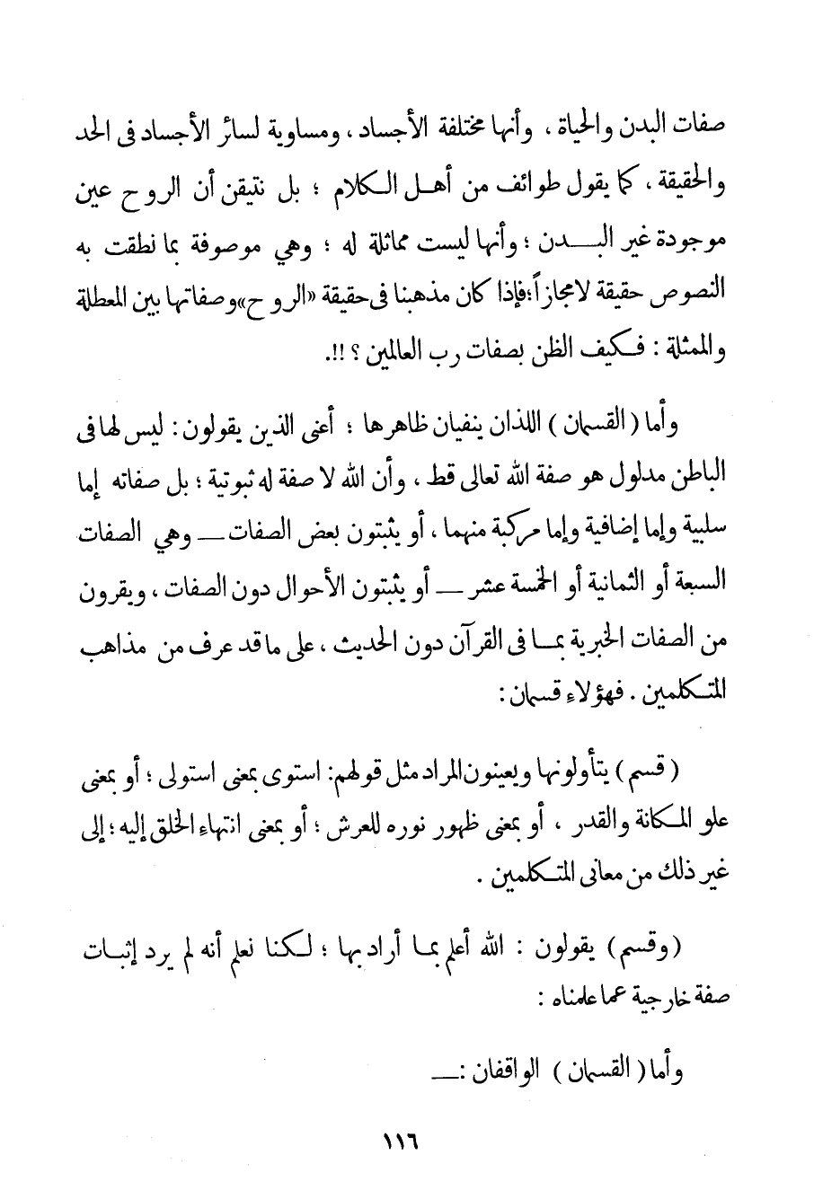 صِفَاتِ الْبَدَنِ وَالْحَيَاةِ وَأَنَّهَا مُخْتَلِفَةُ الْأَجْسَادِ وَمُسَاوِيَةٌ لِسَائِرِ الْأَجْسَادِ فِي الْحَدِّ وَالْحَقِيقَةُ كَمَا يَقُولُ طَوَائِفُ مِنْ أَهْلِ الْكَلَامِ بَلْ نَتَيَقَّنُ أَنَّ الرُّوحَ عَيْنٌ مَوْجُودَةٌ غَيْرَ الْبَدَنِ؛ وَأَنَّهَا لَيْسَتْ مُمَاثِلَةً لَهُ؛ وَهِيَ مَوْصُوفَةٌ بِمَا نَطَقَتْ بِهِ النُّصُوصُ حَقِيقَةً لَا مَجَازًا؛ فَإِذَا كَانَ مَذْهَبُنَا فِي حَقِيقَةِ " الرُّوحِ " وَصِفَاتِهَا بَيْنَ الْمُعَطِّلَةِ وَالْمُمَثِّلَةِ: فَكَيْفَ الظَّنُّ بِصِفَاتِ رَبِّ الْعَالَمِينَ؟ . وَأَمَّا الْقِسْمَانِ اللَّذَانِ يَنْفِيَانِ ظَاهِرَهَا؛ أَعْنِي الَّذِينَ يَقُولُونَ: لَيْسَ لَهَا فِي الْبَاطِنِ مَدْلُولٌ هُوَ صِفَةُ اللَّهِ تَعَالَى قَطُّ وَأَنَّ اللَّهَ لَا صِفَةَ لَهُ ثُبُوتِيَّةً؛ بَلْ صِفَاتُهُ إمَّا سَلْبِيَّةٌ وَإِمَّا إضَافِيَّةٌ وَإِمَّا مُرَكَّبَةٌ مِنْهُمَا أَوْ يُثْبِتُونَ بَعْضَ الصِّفَاتِ - وَهِيَ الصِّفَاتُ السَّبْعَةُ أَوْ الثَّمَانِيَةُ أَوْ الْخَمْسَةَ عَشَرَ - أَوْ يُثْبِتُونَ الْأَحْوَالَ دُونَ الصِّفَاتِ وَيُقِرُّونَ مِنْ الصِّفَاتِ الْخَبَرِيَّةِ بِمَا فِي الْقُرْآنِ دُونَ الْحَدِيثِ عَلَى مَا قَدْ عُرِفَ مِنْ مَذَاهِبِ الْمُتَكَلِّمِينَ. فَهَؤُلَاءِ قِسْمَانِ: قِسْمٌ يَتَأَوَّلُونَهَا وَيُعَيِّنُونَ الْمُرَادَ مِثْلُ قَوْلِهِمْ: اسْتَوَى بِمَعْنَى اسْتَوْلَى؛ أَوْ بِمَعْنَى عُلُوِّ الْمَكَانَةِ وَالْقَدْرِ أَوْ بِمَعْنَى ظُهُورِ نُورِهِ لِلْعَرْشِ؛ أَوْ بِمَعْنَى انْتِهَاءِ الْخَلْقِ إلَيْهِ؛ إلَى غَيْرِ ذَلِكَ مِنْ مَعَانِي الْمُتَكَلِّمِينَ. وَقِسْمٌ يَقُولُونَ: اللَّهُ أَعْلَمُ بِمَا أَرَادَ بِهَا؛ لَكِنَّا نَعْلَمُ أَنَّهُ لَمْ يُرِدْ إثْبَاتَ صِفَةٍ خَارِجِيَّةٍ عَمَّا عَلِمْنَاهُ: