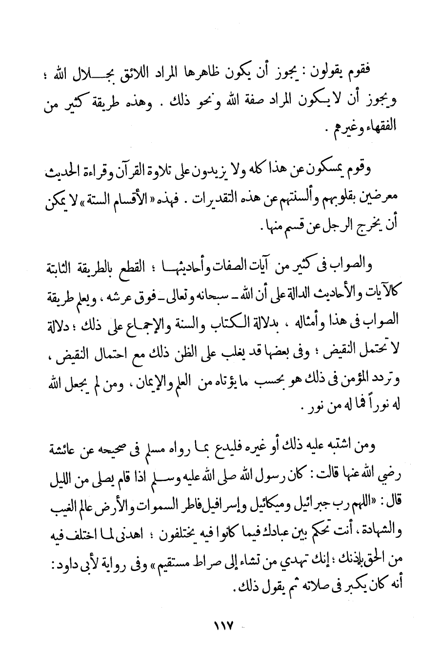 وَهَذِهِ طَرِيقَةُ كَثِيرٍ مِنْ الْفُقَهَاءِ وَغَيْرِهِمْ. وَقَوْمٌ يُمْسِكُونَ عَنْ هَذَا كُلِّهِ وَلَا يَزِيدُونَ عَلَى تِلَاوَةِ الْقُرْآنِ وَقِرَاءَةِ الْحَدِيثِ مُعْرِضِينَ بِقُلُوبِهِمْ وَأَلْسِنَتِهِمْ عَنْ هَذِهِ التَّقْدِيرَاتِ. فَهَذِهِ " الْأَقْسَامُ السِّتَّةُ " لَا يُمْكِنُ أَنْ يَخْرُجَ الرَّجُلُ عَنْ قِسْمٍ مِنْهَا. وَالصَّوَابُ فِي كَثِيرٍ مِنْ آيَاتِ الصِّفَاتِ وَأَحَادِيثِهَا؛ الْقَطْعُ بِالطَّرِيقَةِ الثَّابِتَةِ كَالْآيَاتِ وَالْأَحَادِيثِ الدَّالَّةِ عَلَى أَنَّ اللَّهَ - سُبْحَانَهُ وَتَعَالَى - فَوْقَ عَرْشِهِ وَيَعْلَمُ طَرِيقَةَ الصَّوَابِ فِي هَذَا وَأَمْثَالِهِ بِدَلَالَةِ الْكِتَابِ وَالسُّنَّةِ وَالْإِجْمَاعِ عَلَى ذَلِكَ؛ دَلَالَةٌ لَا تَحْتَمِلُ النَّقِيضَ؛ وَفِي بَعْضِهَا قَدْ يَغْلِبُ عَلَى الظَّنِّ ذَلِكَ مَعَ احْتِمَالِ النَّقِيضِ وَتَرَدُّدُ الْمُؤْمِنِ فِي ذَلِكَ هُوَ بِحَسَبِ مَا يُؤْتَاهُ مِنْ الْعِلْمِ وَالْإِيمَانِ وَمَنْ لَمْ يَجْعَلْ اللَّهُ لَهُ نُورًا فَمَا لَهُ مِنْ نُورٍ. وَمَنْ اشْتَبَهَ عَلَيْهِ ذَلِكَ أَوْ غَيْرُهُ فَلْيَدْعُ بِمَا رَوَاهُ مُسْلِمٌ فِي صَحِيحِهِ عَنْ {عَائِشَةَ رَضِيَ اللَّهُ عَنْهَا قَالَتْ: كَانَ رَسُولُ اللَّهِ صَلَّى اللَّهُ عَلَيْهِ وَسَلَّمَ إذَا قَامَ يُصَلِّي مِنْ اللَّيْلِ قَالَ: اللَّهُمَّ رَبَّ جبرائيل وميكائيل وَإِسْرَافِيلَ فَاطِرَ السَّمَوَاتِ وَالْأَرْضِ عَالِمَ الْغَيْبِ وَالشَّهَادَةِ أَنْتَ تَحْكُمُ بَيْنَ عِبَادِك فِيمَا كَانُوا فِيهِ يَخْتَلِفُونَ؛ اهْدِنِي لِمَا اُخْتُلِفَ فِيهِ مِنْ الْحَقِّ بِإِذْنِك؛ إنَّك تَهْدِي مَنْ تَشَاءُ إلَى صِرَاطٍ مُسْتَقِيمٍ} وَفِي رِوَايَةٍ لِأَبِي دَاوُد: {أَنَّهُ كَانَ يُكَبِّرُ فِي صِلَاتِهِ ثُمَّ يَقُولُ ذَلِكَ} .
