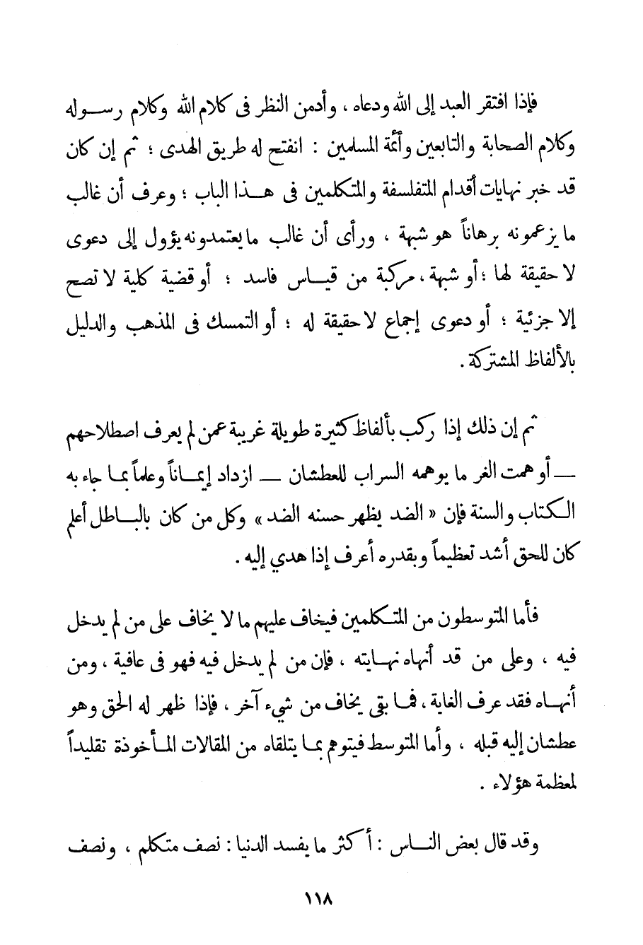 فَإِذَا افْتَقَرَ الْعَبْدُ إلَى اللَّهِ وَدَعَاهُ وَأَدْمَنَ النَّظَرَ فِي كَلَامِ اللَّهِ وَكَلَامِ رَسُولِهِ وَكَلَامِ الصَّحَابَةِ وَالتَّابِعِينَ وَأَئِمَّةِ الْمُسْلِمِينَ: انْفَتَحَ لَهُ طَرِيقُ الْهُدَى؛ ثُمَّ إنْ كَانَ قَدْ خُبِّرَ نِهَايَاتِ أَقْدَامِ الْمُتَفَلْسِفَةِ وَالْمُتَكَلِّمِين فِي هَذَا الْبَابِ؛ وَعَرَفَ أَنَّ غَالِبَ مَا يَزْعُمُونَهُ بُرْهَانًا هُوَ شُبْهَةٌ وَرَأَى أَنَّ غَالِبَ مَا يَعْتَمِدُونَهُ يُؤَوَّلُ إلَى دَعْوَى لَا حَقِيقَةَ لَهَا؛ أَوْ شُبْهَةٍ مُرَكَّبَةٍ مِنْ قِيَاسٍ فَاسِدٍ؛ أَوْ قَضِيَّةٍ كُلِّيَّةٍ لَا تَصِحُّ إلَّا جُزْئِيَّةً؛ أَوْ دَعْوَى إجْمَاعٍ لَا حَقِيقَةَ لَهُ؛ أَوْ التَّمَسُّكِ فِي الْمَذْهَبِ وَالدَّلِيلِ بِالْأَلْفَاظِ الْمُشْتَرَكَةِ. ثُمَّ إنَّ ذَلِكَ إذَا رُكِّبَ بِأَلْفَاظِ كَثِيرَةٍ طَوِيلَةٍ غَرِيبَةٍ عَمَّنْ لَمْ يَعْرِفُ اصْطِلَاحَهُمْ - أَوْهَمَتْ الْغِرَّ مَا يُوهِمُهُ السَّرَابُ لِلْعَطْشَانِ - ازْدَادَ إيمَانًا وَعِلْمًا بِمَا جَاءَ بِهِ الْكِتَابُ وَالسُّنَّةُ فَإِنَّ " الضِّدَّ يُظْهِرُ حُسْنَهُ الضِّدُّ " وَكُلُّ مَنْ كَانَ بِالْبَاطِلِ أَعْلَمُ كَانَ لِلْحَقِّ أَشَدَّ تَعْظِيمًا وَبِقَدْرِهِ أَعْرَفَ إذَا هُدِيَ إلَيْهِ. فَأَمَّا الْمُتَوَسِّطُونَ مِنْ الْمُتَكَلِّمِينَ فَيُخَافُ عَلَيْهِمْ مَا لَا يُخَافُ عَلَى مَنْ لَمْ يَدْخُلْ فِيهِ وَعَلَى مَنْ قَدْ أَنْهَاهُ نِهَايَتُهُ فَإِنَّ مَنْ لَمْ يَدْخُلْ فِيهِ فَهُوَ فِي عَافِيَةٍ وَمَنْ أَنْهَاهُ فَقَدْ عَرَفَ الْغَايَةَ فَمَا بَقِيَ يَخَافُ مِنْ شَيْءٍ آخَرَ فَإِذَا ظَهَرَ لَهُ الْحَقُّ وَهُوَ عَطْشَانُ إلَيْهِ قَبْلَهُ وَأَمَّا الْمُتَوَسِّطُ فَيَتَوَهَّمُ بِمَا يَتَلَقَّاهُ مِنْ الْمَقَالَاتِ الْمَأْخُوذَةِ تَقْلِيدًا لِمُعَظِّمَةِ هَؤُلَاءِ. وَقَدْ قَالَ بَعْضُ النَّاسِ: أَكْثَرُ مَا يُفْسِدُ الدُّنْيَا: نِصْفٌ مُتَكَلِّمٌ وَنِصْفٌ