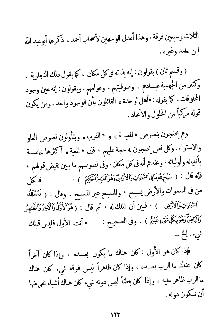الثَّلَاثِ وَسَبْعِينَ فِرْقَةً وَهَذَا أَعْدَلُ الْوَجْهَيْنِ لِأَصْحَابِ أَحْمَد ذَكَرَهُمَا أَبُو عَبْدِ اللَّهِ ابْنُ حَامِدٍ وَغَيْرُهُ. (وَقِسْمٌ ثَانٍ يَقُولُونَ: إنَّهُ بِذَاتِهِ فِي كُلِّ مَكَانٍ كَمَا يَقُولُ ذَلِكَ النجارية وَكَثِيرٌ مِنْ الْجَهْمِيَّة عُبَّادِهِمْ وَصُوفِيَّتِهِمْ وَعَوَامِّهِمْ. وَيَقُولُونَ: إنَّهُ عَيْنُ وُجُودِ الْمَخْلُوقَاتِ. كَمَا يَقُولُهُ: " أَهْلُ الْوَحْدَةِ " الْقَائِلُونَ بِأَنَّ الْوُجُودَ وَاحِدٌ وَمَنْ يَكُونُ قَوْلُهُ مُرَكَّبًا مِنْ الْحُلُولِ وَالِاتِّحَادِ. وَهُمْ يَحْتَجُّونَ بِنُصُوصِ " الْمَعِيَّةِ " وَ " الْقُرْبِ " وَيَتَأَوَّلُونَ نُصُوصَ الْعُلُوِّ وَالِاسْتِوَاءِ وَكُلُّ نَصٍّ يَحْتَجُّونَ بِهِ حُجَّةٌ عَلَيْهِمْ؛ فَإِنَّ " الْمَعِيَّةَ " أَكْثَرُهَا خَاصَّةً بِأَنْبِيَائِهِ وَأَوْلِيَائِهِ وَعِنْدَهُمْ أَنَّهُ فِي كُلِّ مَكَانٍ وَفِي نُصُوصِهِمْ مَا يُبَيِّنُ نَقِيضَ قَوْلِهِمْ؛ فَإِنَّهُ قَالَ: {سَبَّحَ لِلَّهِ مَا فِي السَّمَاوَاتِ وَالْأَرْضِ وَهُوَ الْعَزِيزُ الْحَكِيمُ} فَكُلُّ مَنْ فِي السَّمَوَاتِ وَالْأَرْضِ يُسَبِّحُ وَالْمُسَبِّحُ غَيْرُ الْمُسَبَّحِ. وَقَالَ: {لَهُ مُلْكُ السَّمَاوَاتِ وَالْأَرْضِ} فَبَيَّنَ أَنَّ الْمُلْكَ لَهُ؛ ثُمَّ قَالَ: {هُوَ الْأَوَّلُ وَالْآخِرُ وَالظَّاهِرُ وَالْبَاطِنُ وَهُوَ بِكُلِّ شَيْءٍ عَلِيمٌ} . وَفِي الصَّحِيحِ: {أَنْتَ الْأَوَّلُ فَلَيْسَ قَبْلَك شَيْءٌ} . . . إلَخْ. فَإِذَا كَانَ هُوَ الْأَوَّلُ: كَانَ هُنَاكَ مَا يَكُونُ بَعْدَهُ وَإِذَا كَانَ آخِرًا كَانَ هُنَاكَ مَا الرَّبُّ بَعْدَهُ وَإِذَا كَانَ ظَاهِرًا لَيْسَ فَوْقَهُ شَيْءٌ كَانَ هُنَاكَ مَا الرَّبُّ ظَاهِرٌ عَلَيْهِ وَإِذَا كَانَ بَاطِنًا لَيْسَ دُونَهُ شَيْءٌ كَانَ هُنَاكَ أَشْيَاءُ نَفَى عَنْهَا أَنْ تَكُونَ دُونَهُ.