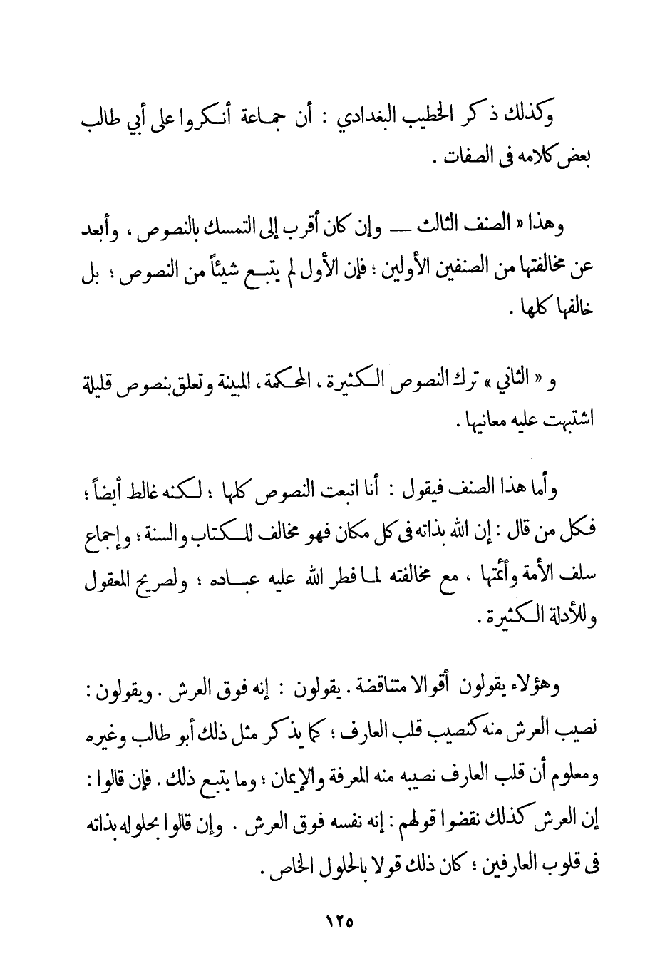 وَكَذَلِكَ ذَكَرَ الْخَطِيبُ الْبَغْدَادِيُّ: أَنَّ جَمَاعَةً أَنْكَرُوا عَلَى أَبِي طَالِبٍ بَعْضَ كَلَامِهِ فِي الصِّفَاتِ. وَهَذَا " الصِّنْفُ الثَّالِثُ " وَإِنْ كَانَ أَقْرَبَ إلَى التَّمَسُّكِ بِالنُّصُوصِ وَأَبْعَدَ عَنْ مُخَالَفَتِهَا مِنْ الصِّنْفَيْنِ الْأَوَّلَيْنِ؛ فَإِنَّ الْأَوَّلَ لَمْ يَتَّبِعْ شَيْئًا مِنْ النُّصُوصِ؛ بَلْ خَالَفَهَا كُلَّهَا. و " الثَّانِي " تَرَكَ النُّصُوصَ الْكَثِيرَةَ الْمَحْكَمَةَ الْمُبَيِّنَة وَتَعَلَّقَ بِنُصُوصِ قَلِيلَةٍ اشْتَبَهَتْ عَلَيْهِ مَعَانِيهَا. وَأَمَّا هَذَا الصِّنْفُ فَيَقُولُ: أَنَا اتَّبَعْت النُّصُوصَ كُلَّهَا؛ لَكِنَّهُ غَالَطَ أَيْضًا؛ فَكُلُّ مَنْ قَالَ: إنَّ اللَّهَ بِذَاتِهِ فِي كُلِّ مَكَانٍ فَهُوَ مُخَالِفٌ لِلْكِتَابِ وَالسُّنَّةِ؛ وَإِجْمَاعِ سَلَفِ الْأُمَّةِ وَأَئِمَّتِهَا مَعَ مُخَالَفَتِهِ لِمَا فَطَرَ اللَّهُ عَلَيْهِ عِبَادَهُ؛ وَلِصَرِيحِ الْمَعْقُولِ وَلِلْأَدِلَّةِ الْكَثِيرَةِ. وَهَؤُلَاءِ يَقُولُونَ أَقْوَالًا مُتَنَاقِضَةً. يَقُولُونَ: إنَّهُ فَوْقَ الْعَرْشِ. وَيَقُولُونَ: نَصِيبُ الْعَرْشِ مِنْهُ كَنَصِيبِ قَلْبِ الْعَارِفِ؛ كَمَا يَذْكُرُ مِثْلَ ذَلِكَ أَبُو طَالِبٍ وَغَيْرُهُ وَمَعْلُومٌ أَنَّ قَلْبَ الْعَارِفِ نُصِيبُهُ مِنْهُ الْمَعْرِفَةُ وَالْإِيمَانُ؛ وَمَا يَتْبَعُ ذَلِكَ. فَإِنْ قَالُوا: إنَّ الْعَرْشَ كَذَلِكَ نَقَضُوا قَوْلَهُمْ: إنَّهُ نَفْسُهُ فَوْقَ الْعَرْشِ. وَإِنْ قَالُوا بِحُلُولِهِ بِذَاتِهِ فِي قُلُوبِ الْعَارِفِينَ؛ كَانَ ذَلِكَ قَوْلًا بِالْحُلُولِ الْخَاصِّ.