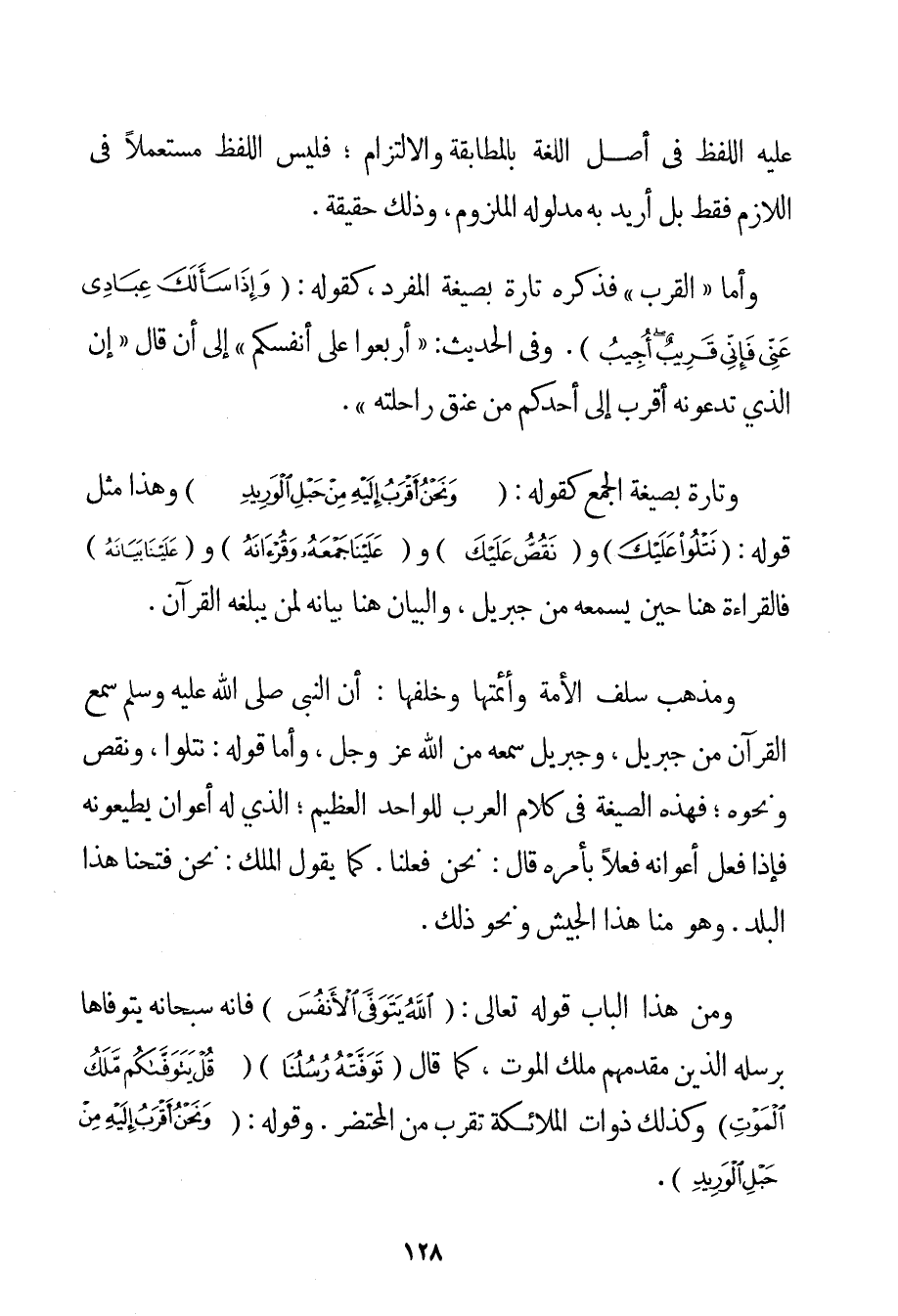 عَلَيْهِ اللَّفْظُ فِي أَصْلِ اللُّغَةِ بِالْمُطَابَقَةِ وَالِالْتِزَامِ؛ فَلَيْسَ اللَّفْظُ مُسْتَعْمَلًا فِي اللَّازِمِ فَقَطْ بَلْ أُرِيدَ بِهِ مَدْلُولُهُ الْمَلْزُومُ وَذَلِكَ حَقِيقَةً. وَأَمَّا " الْقُرْبُ " فَذَكَرَهُ تَارَةً بِصِيغَةِ الْمُفْرَدِ كَقَوْلِهِ: {وَإِذَا سَأَلَكَ عِبَادِي عَنِّي فَإِنِّي قَرِيبٌ أُجِيبُ} وَفِي الْحَدِيثِ: {أَرْبِعُوا عَلَى أَنْفُسِكُمْ} إلَى أَنْ قَالَ {إنَّ الَّذِي تَدْعُونَهُ أَقْرَبُ إلَى أَحَدِكُمْ مِنْ عُنُقِ رَاحِلَتِهِ} . وَتَارَةً بِصِيغَةِ الْجَمْعِ كَقَوْلِهِ: {وَنَحْنُ أَقْرَبُ إلَيْهِ مِنْ حَبْلِ الْوَرِيدِ} وَهَذَا مِثْلُ قَوْلِهِ: {نَتْلُوا عَلَيْكَ} و {نَقُصُّ عَلَيْكَ} و {عَلَيْنَا جَمْعَهُ وَقُرْآنَهُ} وَ {عَلَيْنَا بَيَانَهُ} فَالْقِرَاءَةُ هُنَا حِينَ يَسْمَعُهُ مِنْ جِبْرِيلَ وَالْبَيَانُ هُنَا بَيَانُهُ لِمَنْ يَبْلُغُهُ الْقُرْآنُ. وَمَذْهَبُ سَلَفِ الْأُمَّةِ وَأَئِمَّتِهَا وَخَلَفِهَا: أَنَّ النَّبِيَّ صَلَّى اللَّهُ عَلَيْهِ وَسَلَّمَ سَمِعَ الْقُرْآنَ مِنْ جِبْرِيلَ وَجِبْرِيلُ سَمِعَهُ مِنْ اللَّهِ عَزَّ وَجَلَّ وَأَمَّا قَوْلُهُ: نَتَلُوا وَنَقُصُّ وَنَحْوُهُ؛ فَهَذِهِ الصِّيغَةُ فِي كَلَامِ الْعَرَبِ لِلْوَاحِدِ الْعَظِيمِ؛ الَّذِي لَهُ أَعْوَانٌ يُطِيعُونَهُ فَإِذَا فَعَلَ أَعْوَانُهُ فِعْلًا بِأَمْرِهِ قَالَ: نَحْنُ فَعَلْنَا. كَمَا يَقُولُ الْمَلِكُ: نَحْنُ فَتَحْنَا هَذَا الْبَلَدَ. وَهُوَ مِنَّا هَذَا الْجَيْشُ وَنَحْوُ ذَلِكَ. وَمِنْ هَذَا الْبَابِ قَوْلُهُ تَعَالَى: {اللَّهُ يَتَوَفَّى الْأَنْفُسَ} فَإِنَّهُ سُبْحَانَهُ يَتَوَفَّاهَا بِرُسُلِهِ الَّذِينَ مُقَدِّمُهُمْ مَلَكُ الْمَوْتِ كَمَا قَالَ {تَوَفَّتْهُ رُسُلُنَا} {قُلْ يَتَوَفَّاكُمْ مَلَكُ الْمَوْتِ} وَكَذَلِكَ ذَوَاتُ الْمَلَائِكَةِ تَقْرُبُ مِنْ الْمُحْتَضَرِ. وَقَوْلُهُ: {وَنَحْنُ أَقْرَبُ إلَيْهِ مِنْ حَبْلِ الْوَرِيدِ} .