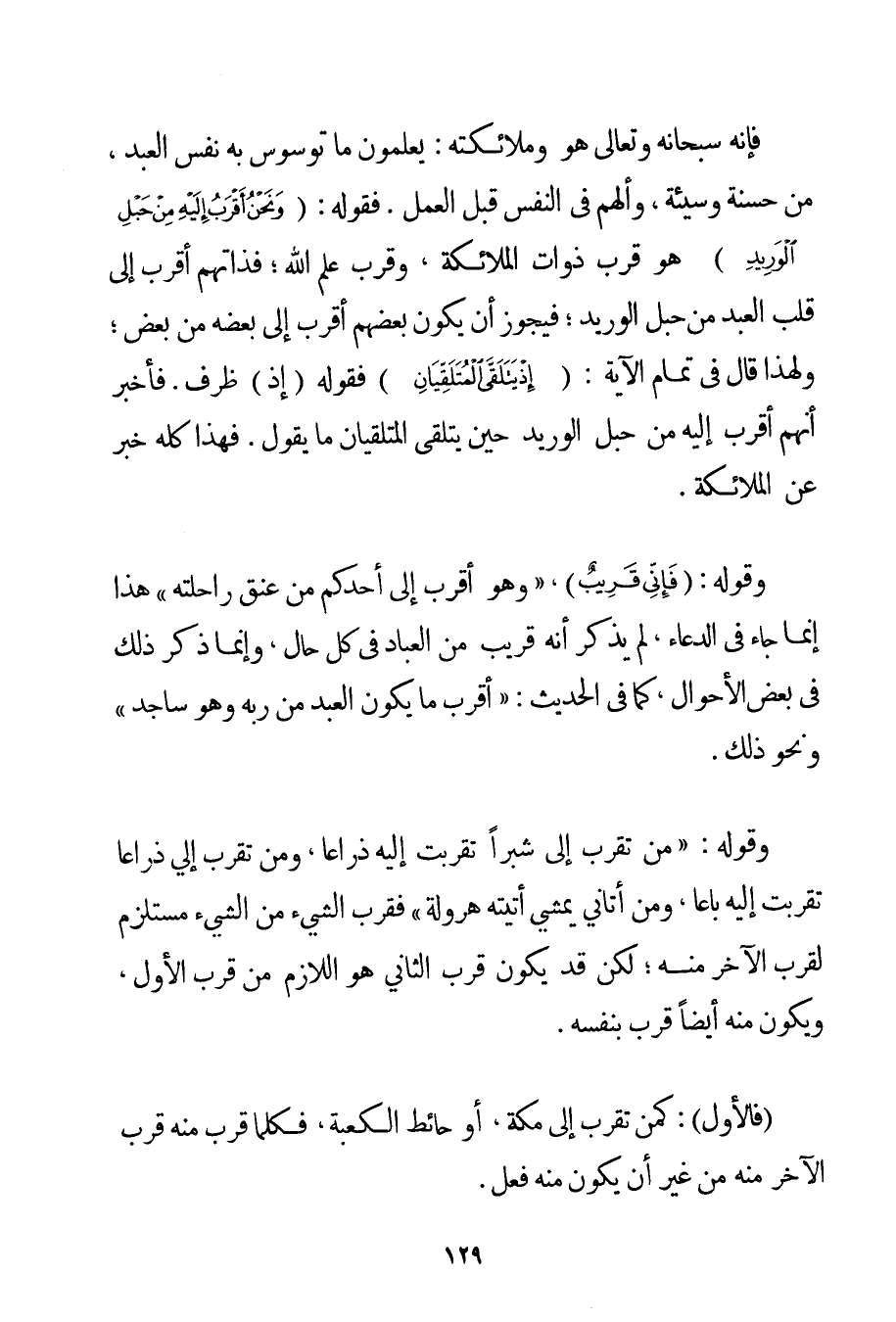 فَإِنَّهُ سُبْحَانَهُ وَتَعَالَى هُوَ وَمَلَائِكَتُهُ: يَعْلَمُونَ مَا تُوَسْوِسُ بِهِ نَفْسُ الْعَبْدِ مِنْ حَسَنَةٍ وَسَيِّئَةٍ وَالْهَمَّ فِي النَّفْسِ قَبْلَ الْعَمَلِ. فَقَوْلُهُ: {وَنَحْنُ أَقْرَبُ إلَيْهِ مِنْ حَبْلِ الْوَرِيدِ} هُوَ قُرْبُ ذَوَاتِ الْمَلَائِكَةِ وَقُرْبُ عِلْمِ اللَّهِ؛ فَذَاتُهُمْ أَقْرَبُ إلَى قَلْبِ الْعَبْدِ مِنْ حَبْلِ الْوَرِيدِ؛ فَيَجُوزُ أَنْ يَكُونَ بَعْضُهُمْ أَقْرَبَ إلَى بَعْضِهِ مِنْ بَعْضٍ؛ وَلِهَذَا قَالَ فِي تَمَامِ الْآيَةِ: {إذْ يَتَلَقَّى الْمُتَلَقِّيَانِ} فَقَوْلُهُ (إذْ) ظَرْفٌ. فَأَخْبَرَ أَنَّهُمْ أَقْرَبُ إلَيْهِ مِنْ حَبْلِ الْوَرِيدِ حِينَ يَتَلَقَّى الْمُتَلَقِّيَانِ مَا يَقُولُ. فَهَذَا كُلُّهُ خَبَرٌ عَنْ الْمَلَائِكَةِ. وَقَوْلُهُ: {فَإِنِّي قَرِيبٌ} " وَهُوَ أَقْرَبُ إلَى أَحَدِكُمْ مِنْ عُنُقِ رَاحِلَتِهِ " هَذَا إنَّمَا جَاءَ فِي الدُّعَاءِ لَمْ يَذْكُرْ أَنَّهُ قَرِيبٌ مِنْ الْعِبَادِ فِي كُلِّ حَالٍ وَإِنَّمَا ذَكَرَ ذَلِكَ فِي بَعْضِ الْأَحْوَالِ كَمَا فِي الْحَدِيثِ: {أَقْرَبُ مَا يَكُونُ الْعَبْدُ مِنْ رَبِّهِ وَهُوَ سَاجِدٌ} وَنَحْوُ ذَلِكَ. وَقَوْلُهُ: {مَنْ تَقَرَّبَ إلَيَّ شِبْرًا تَقَرَّبْت إلَيْهِ ذِرَاعًا وَمَنْ تَقَرَّبَ إلَيَّ ذِرَاعًا تَقَرَّبْت إلَيْهِ بَاعًا وَمَنْ أَتَانِي يَمْشِي أَتَيْته هَرْوَلَةً} فَقُرْبُ الشَّيْءِ مِنْ الشَّيْءِ مُسْتَلْزِمٌ لِقُرْبِ الْآخَرِ مِنْهُ؛ لَكِنْ قَدْ يَكُونُ قُرْبُ الثَّانِي هُوَ اللَّازِمُ مِنْ قُرْبِ الْأَوَّلِ وَيَكُونُ مِنْهُ أَيْضًا قُرْبٌ بِنَفْسِهِ. (فَالْأَوَّلُ: كَمَنْ تَقَرَّبَ إلَى مَكَّةَ أَوْ حَائِطِ الْكَعْبَةِ فَكُلَّمَا قَرُبَ مِنْهُ قَرُبَ الْآخَرُ مِنْهُ مِنْ غَيْرِ أَنْ يَكُونَ مِنْهُ فِعْلٌ.