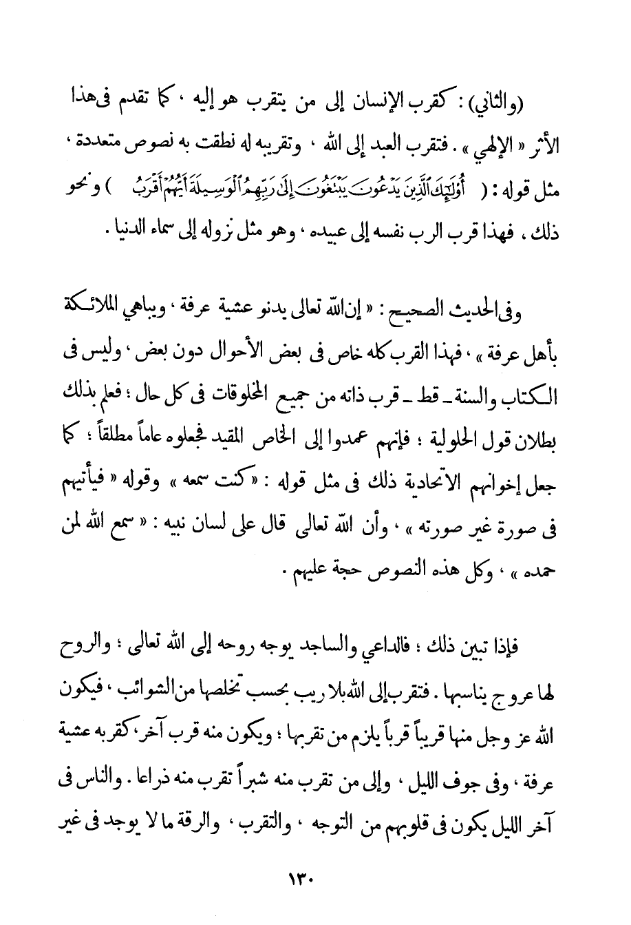 وَالثَّانِي: كَقُرْبِ الْإِنْسَانِ إلَى مَنْ يَتَقَرَّبُ هُوَ إلَيْهِ كَمَا تَقَدَّمَ فِي هَذَا الْأَثَرِ " الْإِلَهِيِّ ". فَتَقَرُّبُ الْعَبْدِ إلَى اللَّهِ وَتَقْرِيبُهُ لَهُ نَطَقَتْ بِهِ نُصُوصٌ مُتَعَدِّدَةٌ مِثْلُ قَوْلِهِ: {أُولَئِكَ الَّذِينَ يَدْعُونَ يَبْتَغُونَ إلَى رَبِّهِمُ الْوَسِيلَةَ أَيُّهُمْ أَقْرَبُ} وَنَحْوُ ذَلِكَ فَهَذَا قُرْبُ الرَّبِّ نَفْسِهِ إلَى عَبِيدِهِ وَهُوَ مِثْلُ نُزُولِهِ إلَى سَمَاءِ الدُّنْيَا. وَفِي الْحَدِيثِ الصَّحِيحِ: {إنَّ اللَّهَ تَعَالَى يَدْنُو عَشِيَّةَ عَرَفَةَ وَيُبَاهِي الْمَلَائِكَةَ بِأَهْلِ عَرَفَةَ} فَهَذَا الْقُرْبُ كُلُّهُ خَاصٌّ فِي بَعْضِ الْأَحْوَالِ دُونَ بَعْضٍ وَلَيْسَ فِي الْكِتَابِ وَالسُّنَّةِ - قَطُّ - قُرْبُ ذَاتِهِ مِنْ جَمِيعِ الْمَخْلُوقَاتِ فِي كُلِّ حَالٍ؛ فَعُلِمَ بِذَلِكَ بُطْلَانُ قَوْلِ الْحُلُولِيَّةِ؛ فَإِنَّهُمْ عَمَدُوا إلَى الْخَاصِّ الْمُقَيَّدِ فَجَعَلُوهُ عَامًّا مُطْلَقًا؛ كَمَا جَعَلَ إخْوَانُهُمْ الِاتِّحَادِيَّةُ ذَلِكَ فِي مِثْلِ قَوْلِهِ: {كُنْت سَمْعَهُ} وَقَوْلِهِ {فَيَأْتِيهِمْ فِي صُورَةٍ غَيْرِ صُورَتِهِ} وَأَنَّ اللَّهَ تَعَالَى قَالَ عَلَى لِسَانِ نَبِيِّهِ: {سَمِعَ اللَّهُ لِمَنْ حَمِدَهُ} وَكُلُّ هَذِهِ النُّصُوصِ حُجَّةٌ عَلَيْهِمْ. فَإِذَا تَبَيَّنَ ذَلِكَ؛ فَالدَّاعِي وَالسَّاجِدُ يُوَجِّهُ رُوحَهُ إلَى اللَّهِ تَعَالَى؛ وَالرُّوحُ لَهَا عُرُوجٌ يُنَاسِبُهَا. فتقرب إلَى اللَّهِ بِلَا رَيْبٍ بِحَسَبِ تَخَلُّصِهَا مِنْ الشَّوَائِبِ فَيَكُونُ اللَّهُ عَزَّ وَجَلَّ مِنْهَا قَرِيبًا قُرْبًا يَلْزَمُ مِنْ تَقَرُّبِهَا؛ وَيَكُونُ مِنْهُ قُرْبٌ آخَرُ؛ كَقُرْبِهِ عَشِيَّةَ عَرَفَةَ وَفِي جَوْفِ اللَّيْلِ وَإِلَى مَنْ تَقَرَّبَ مِنْهُ شِبْرًا تَقَرَّبَ مِنْهُ ذِرَاعًا. وَالنَّاسُ فِي آخِرِ اللَّيْلِ يَكُونُ فِي قُلُوبِهِمْ مِنْ التَّوَجُّهِ وَالتَّقَرُّبِ وَالرِّقَّةِ مَا لَا يُوجَدُ فِي غَيْرِ