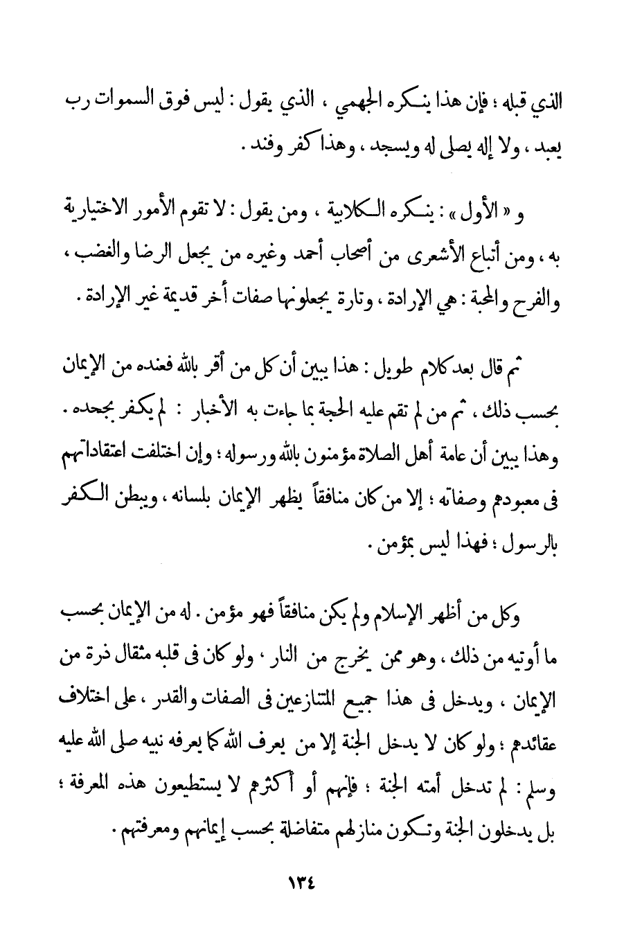 الَّذِي قَبْلَهُ؛ فَإِنَّ هَذَا يُنْكِرُهُ الجهمي الَّذِي يَقُولُ: لَيْسَ فَوْقَ السَّمَوَاتِ رَبٌّ يُعْبَدُ وَلَا إلَهٌ يُصَلَّى لَهُ وَيُسْجَدُ وَهَذَا كُفْرٌ وَفَنَدٌ. وَ " الْأَوَّلُ ": يُنْكِرُهُ الْكُلَّابِيَة وَمَنْ يَقُولُ: لَا تَقُومُ الْأُمُورُ الِاخْتِيَارِيَّةُ بِهِ وَمِنْ أَتْبَاعِ الْأَشْعَرِيِّ مِنْ أَصْحَابِ أَحْمَد وَغَيْرِهِ مَنْ يَجْعَلُ الرِّضَا وَالْغَضَبَ وَالْفَرَحَ وَالْمَحَبَّةَ: هِيَ الْإِرَادَةُ وَتَارَةً يَجْعَلُونَهَا صِفَاتٍ أُخَرَ قَدِيمَةً غَيْرَ الْإِرَادَةِ. ثُمَّ قَالَ بَعْدَ كَلَامٍ طَوِيلٍ: هَذَا يُبَيِّنُ أَنَّ كُلَّ مَنْ أَقَرَّ بِاَللَّهِ فَعِنْدَهُ مِنْ الْإِيمَانِ بِحَسَبِ ذَلِكَ ثُمَّ مَنْ لَمْ تَقُمْ عَلَيْهِ الْحُجَّةُ بِمَا جَاءَتْ بِهِ الْأَخْبَارُ: لَمْ يَكْفُرْ بِجَحْدِهِ. وَهَذَا يُبَيِّنُ أَنَّ عَامَّةَ أَهْلِ الصَّلَاةِ مُؤْمِنُونَ بِاَللَّهِ وَرَسُولِهِ؛ وَإِنْ اخْتَلَفَتْ اعْتِقَادَاتُهُمْ فِي مَعْبُودِهِمْ وَصِفَاتِهِ؛ إلَّا مَنْ كَانَ مُنَافِقًا يُظْهِرُ الْإِيمَانَ بِلِسَانِهِ وَيُبْطِنُ الْكُفْرَ بِالرَّسُولِ؛ فَهَذَا لَيْسَ بِمُؤْمِنِ. وَكُلُّ مَنْ أَظْهَرَ الْإِسْلَامَ وَلَمْ يَكُنْ مُنَافِقًا فَهُوَ مُؤْمِنٌ. لَهُ مِنْ الْإِيمَانِ بِحَسَبِ مَا أُوتِيَهُ مِنْ ذَلِكَ وَهُوَ مِمَّنْ يَخْرُجُ مِنْ النَّارِ وَلَوْ كَانَ فِي قَلْبِهِ مِثْقَالُ ذَرَّةٍ مِنْ الْإِيمَانِ وَيَدْخُلُ فِي هَذَا جَمِيعُ الْمُتَنَازِعِينَ فِي الصِّفَاتِ وَالْقَدَرِ عَلَى اخْتِلَافِ عَقَائِدِهِمْ؛ وَلَوْ كَانَ لَا يَدْخُلُ الْجَنَّةَ إلَّا مَنْ يَعْرِفُ اللَّهَ كَمَا يَعْرِفُهُ نَبِيُّهُ صَلَّى اللَّهُ عَلَيْهِ وَسَلَّمَ لَمْ تَدْخُلْ أُمَّتُهُ الْجَنَّةَ؛ فَإِنَّهُمْ أَوْ أَكْثَرُهُمْ لَا يَسْتَطِيعُونَ هَذِهِ الْمَعْرِفَةَ؛ بَلْ يَدْخُلُونَ الْجَنَّةَ وَتَكُونُ مَنَازِلُهُمْ مُتَفَاضِلَةً بِحَسَبِ إيمَانِهِمْ وَمَعْرِفَتِهِمْ.