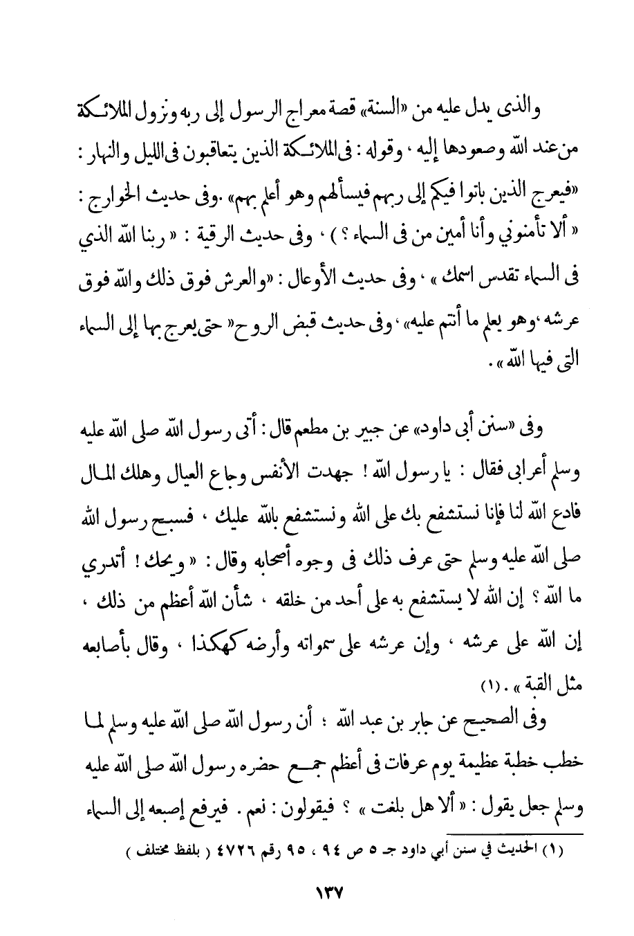 وَاَلَّذِي يَدُلُّ عَلَيْهِ مِنْ " السُّنَّةِ " قِصَّةُ مِعْرَاجِ الرَّسُولِ إلَى رَبِّهِ وَنُزُولِ الْمَلَائِكَةِ مِنْ عِنْدِ اللَّهِ وَصُعُودِهَا إلَيْهِ وَقَوْلُهُ: فِي الْمَلَائِكَةِ الَّذِينَ يَتَعَاقَبُونَ فِي اللَّيْلِ وَالنَّهَارِ: {فَيَعْرُجُ الَّذِينَ بَاتُوا فِيكُمْ إلَى رَبِّهِمْ فَيَسْأَلُهُمْ وَهُوَ أَعْلَمُ بِهِمْ} . وَفِي حَدِيثِ الْخَوَارِجِ: {أَلَا تَأْمَنُونِي وَأَنَا أَمِينُ مَنْ فِي السَّمَاءِ} وَفِي حَدِيثِ الرُّقْيَةِ: {رَبُّنَا اللَّهُ الَّذِي فِي السَّمَاءِ تَقَدَّسَ اسْمُك} وَفِي حَدِيثِ الْأَوْعَالِ: {وَالْعَرْشُ فَوْقَ ذَلِكَ وَاَللَّهُ فَوْقَ عَرْشِهِ وَهُوَ يَعْلَمُ مَا أَنْتُمْ عَلَيْهِ} وَفِي حَدِيثِ قَبْضِ الرُّوحِ {حَتَّى يَعْرُجَ بِهَا إلَى السَّمَاءِ الَّتِي فِيهَا اللَّهُ} . وَفِي " سُنَنِ أَبِي دَاوُد " عَنْ جُبَيْرِ بْنِ مُطْعِمٍ قَالَ: {أَتَى رَسُولُ اللَّهِ صَلَّى اللَّهُ عَلَيْهِ وَسَلَّمَ أَعْرَابِيٌّ فَقَالَ: يَا رَسُولَ اللَّهِ جَهَدَتْ الْأَنْفُسُ وَجَاعَ الْعِيَالُ وَهَلَكَ الْمَالُ فَادْعُ اللَّهَ لَنَا فَإِنَّا نَسْتَشْفِعُ بِك عَلَى اللَّهِ وَنَسْتَشْفِعُ بِاَللَّهِ عَلَيْك؛ فَسَبَّحَ رَسُولُ اللَّهِ صَلَّى اللَّهُ عَلَيْهِ وَسَلَّمَ حَتَّى عُرِفَ ذَلِكَ فِي وُجُوهِ أَصْحَابِهِ وَقَالَ: وَيْحَك أَتَدْرِي مَا اللَّهُ؟ إنَّ اللَّهَ لَا يُسْتَشْفَعُ بِهِ عَلَى أَحَدٍ مِنْ خَلْقِهِ شَأْنُ اللَّهِ أَعْظَمُ مِنْ ذَلِكَ إنَّ اللَّهَ عَلَى عَرْشِهِ وَإِنَّ عَرْشَهُ عَلَى سَمَوَاتِهِ وَأَرْضِهِ كَهَكَذَا وَقَالَ بِأَصَابِعِهِ مِثْلَ الْقُبَّةِ} . وَفِي الصَّحِيحِ عَنْ جَابِرِ بْنِ عَبْدِ اللَّهِ؛ {أَنَّ رَسُولَ اللَّهِ صَلَّى اللَّهُ عَلَيْهِ وَسَلَّمَ لَمَّا خَطَبَ خُطْبَةً عَظِيمَةً يَوْمَ عَرَفَاتٍ فِي أَعْظَمِ جَمْعٍ حَضَرَهُ رَسُولُ اللَّهِ صَلَّى اللَّهُ عَلَيْهِ وَسَلَّمَ جَعَلَ يَقُولُ: أَلَا هَلْ بَلَّغْت؟ فَيَقُولُونَ: نَعَمْ. فَيَرْفَعُ إصْبَعَهُ إلَى السَّمَاءِ