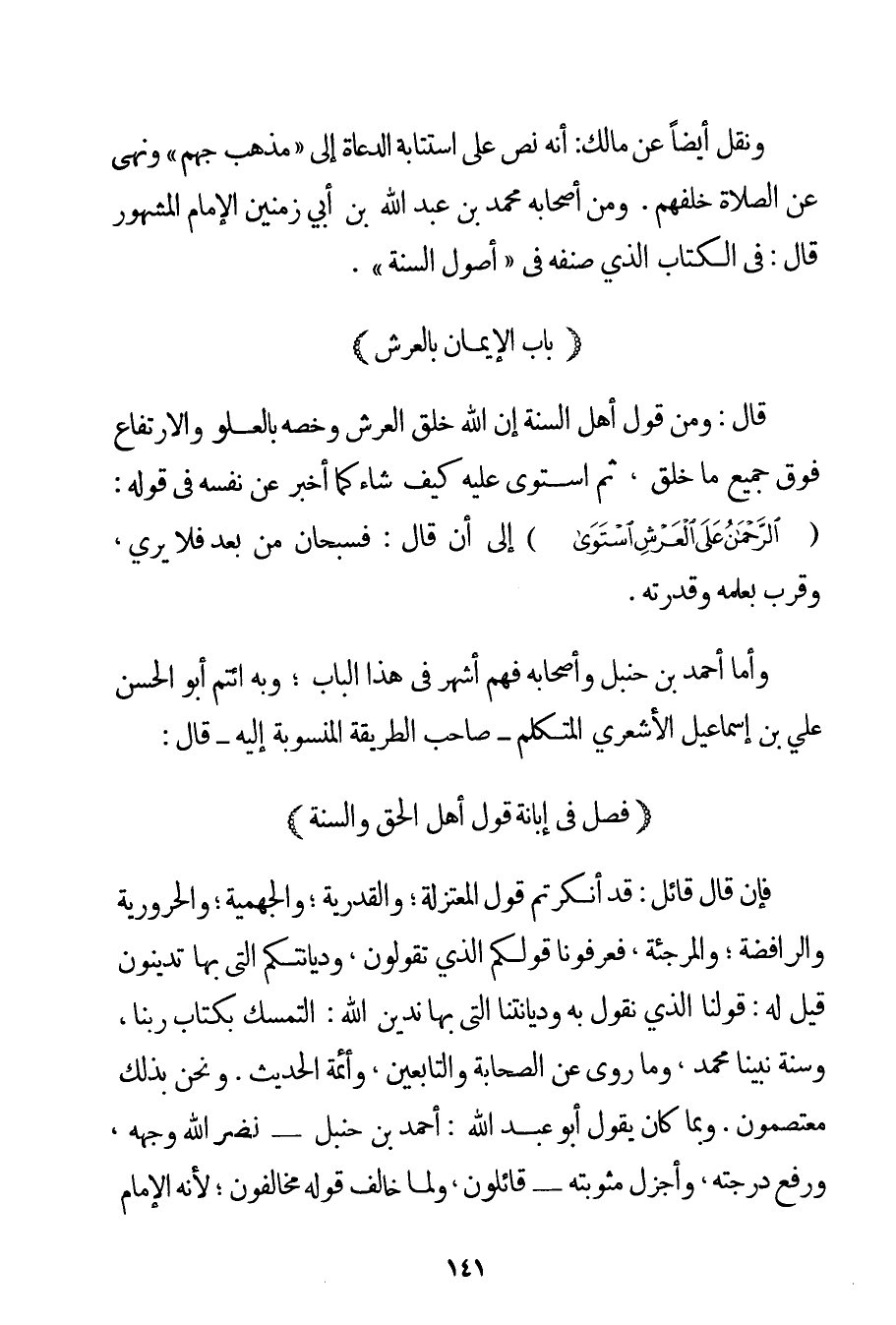 قَالَ: وَمِنْ قَوْلِ أَهْلِ السُّنَّةِ إنَّ اللَّهَ خَلَقَ الْعَرْشَ وَخَصَّهُ بِالْعُلُوِّ وَالِارْتِفَاعِ فَوْقَ جَمِيعِ مَا خَلَقَ ثُمَّ اسْتَوَى عَلَيْهِ كَيْفَ شَاءَ كَمَا أَخْبَرَ عَنْ نَفْسِهِ فِي قَوْلِهِ: {الرَّحْمَنُ عَلَى الْعَرْشِ اسْتَوَى} إلَى أَنْ قَالَ: فَسُبْحَانَ مَنْ بَعُدَ فَلَا يُرِي وَقَرُبَ بِعِلْمِهِ وَقُدْرَتِهِ. وَأَمَّا أَحْمَد بْنُ حَنْبَلٍ وَأَصْحَابُهُ فَهُمْ أَشْهَرُ فِي هَذَا الْبَابِ؛ وَبِهِ ائْتَمَّ أَبُو الْحَسَنِ عَلِيُّ بْنُ إسْمَاعِيلَ الْأَشْعَرِيُّ الْمُتَكَلِّمُ - صَاحِبُ الطَّرِيقَةِ الْمَنْسُوبَةِ إلَيْهِ - قَالَ: