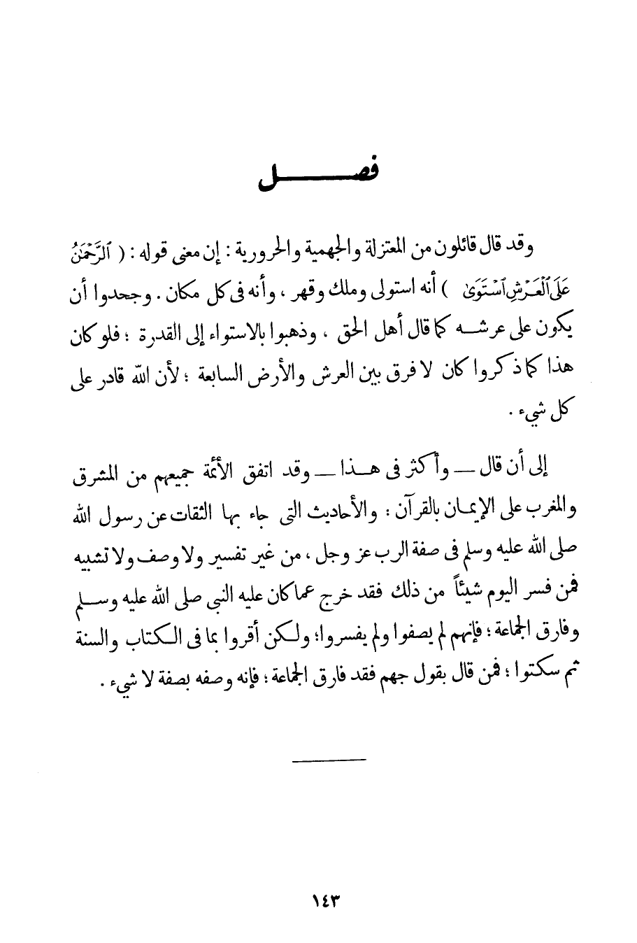 وَقَدْ قَالَ قَائِلُونَ مِنْ الْمُعْتَزِلَةِ وَالْجَهْمِيَّة والحرورية: إنَّ مَعْنَى قَوْلِهِ: {الرَّحْمَنُ عَلَى الْعَرْشِ اسْتَوَى} أَنَّهُ اسْتَوْلَى وَمَلَكَ وَقَهَرَ وَأَنَّهُ فِي كُلِّ مَكَانٍ. وَجَحَدُوا أَنْ يَكُونَ عَلَى عَرْشِهِ كَمَا قَالَ أَهْلُ الْحَقِّ وَذَهَبُوا بِالِاسْتِوَاءِ إلَى الْقُدْرَةِ؛ فَلَوْ كَانَ هَذَا كَمَا ذَكَرُوا كَانَ لَا فَرْقَ بَيْنَ الْعَرْشِ وَالْأَرْضِ السَّابِعَةِ؛ لِأَنَّ اللَّهَ قَادِرٌ عَلَى كُلِّ شَيْءٍ. إلَى أَنْ قَالَ - وَأَكْثَرُوا فِي هَذَا - وَقَدْ اتَّفَقَ الْأَئِمَّةُ جَمِيعُهُمْ مِنْ الْمَشْرِقِ وَالْمَغْرِبِ عَلَى الْإِيمَانِ بِالْقُرْآنِ: وَالْأَحَادِيثِ الَّتِي جَاءَ بِهَا الثِّقَاتُ عَنْ رَسُولِ اللَّهِ صَلَّى اللَّهُ عَلَيْهِ وَسَلَّمَ فِي صِفَةِ الرَّبِّ عَزَّ وَجَلَّ مِنْ غَيْرِ تَفْسِيرٍ وَلَا وَصْفٍ وَلَا تَشْبِيهٍ فَمَنْ فَسَّرَ الْيَوْمَ شَيْئًا مِنْ ذَلِكَ فَقَدْ خَرَجَ عَمَّا كَانَ عَلَيْهِ النَّبِيُّ صَلَّى اللَّهُ عَلَيْهِ وَسَلَّمَ وَفَارَقَ الْجَمَاعَةَ؛ فَإِنَّهُمْ لَمْ يَصِفُوا وَلَمْ يُفَسِّرُوا؛ وَلَكِنْ أَقَرُّوا بِمَا فِي الْكِتَابِ وَالسُّنَّةِ ثُمَّ سَكَتُوا؛ فَمَنْ قَالَ بِقَوْلِ جَهْمٍ فَقَدْ فَارَقَ الْجَمَاعَةَ؛ فَإِنَّهُ وَصَفَهُ بِصِفَةِ لَا شَيْءٍ.