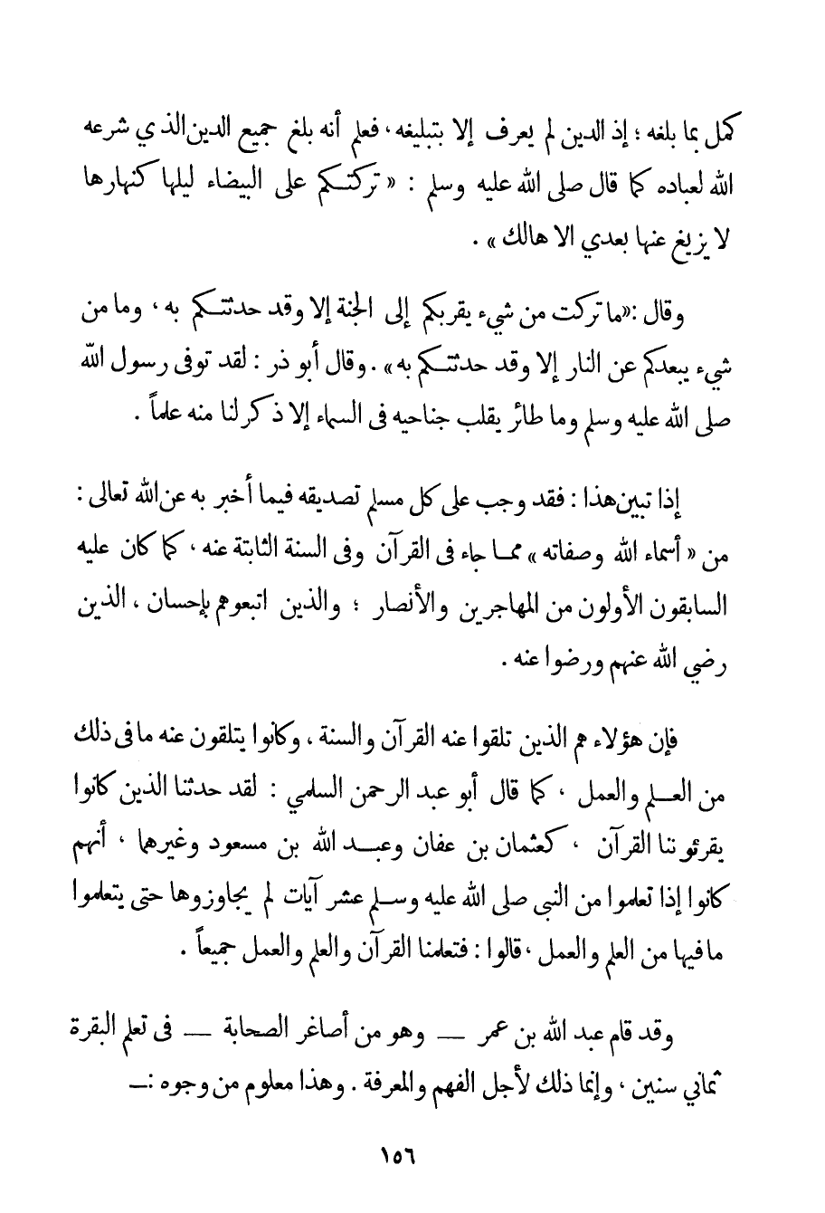 كَمُلَ بِمَا بَلَّغَهُ؛ إذْ الدِّينُ لَمْ يُعْرَفْ إلَّا بِتَبْلِيغِهِ فَعُلِمَ أَنَّهُ بَلَّغَ جَمِيعَ الدِّينِ الَّذِي شَرَعَهُ اللَّهُ لِعِبَادِهِ كَمَا قَالَ صَلَّى اللَّهُ عَلَيْهِ وَسَلَّمَ {تَرَكْتُكُمْ عَلَى الْبَيْضَاءِ لَيْلُهَا كَنَهَارِهَا لَا يَزِيغُ عَنْهَا بَعْدِي إلَّا هَالِكٌ} . وَقَالَ: {مَا تَرَكْتُ مِنْ شَيْءٍ يُقَرِّبُكُمْ إلَى الْجَنَّةِ إلَّا وَقَدْ حَدَّثْتُكُمْ بِهِ وَمَا تَرَكْتُ مِنْ شَيْءٍ يُبْعِدُكُمْ عَنْ النَّارِ إلَّا وَقَدْ حَدَّثْتُكُمْ بِهِ} . وَقَالَ أَبُو ذَرٍّ: لَقَدْ تُوُفِّيَ رَسُولُ اللَّهِ صَلَّى اللَّهُ عَلَيْهِ وَسَلَّمَ وَمَا طَائِرٌ يُقَلِّبُ جَنَاحَيْهِ فِي السَّمَاءِ إلَّا ذَكَرَ لَنَا مِنْهُ عِلْمًا. إذَا تَبَيَّنَ هَذَا: فَقَدْ وَجَبَ عَلَى كُلِّ مُسْلِمٍ تَصْدِيقُهُ فِيمَا أَخْبَرَ بِهِ عَنْ اللَّهِ تَعَالَى: مِنْ " أَسْمَاءِ اللَّهِ وَصِفَاتِهِ " مِمَّا جَاءَ فِي الْقُرْآنِ وَفِي السُّنَّةِ الثَّابِتَةِ عَنْهُ كَمَا كَانَ عَلَيْهِ السَّابِقُونَ الْأَوَّلُونَ مِنْ الْمُهَاجِرِينَ وَالْأَنْصَارِ؛ وَاَلَّذِينَ اتَّبَعُوهُمْ بِإِحْسَانٍ الَّذِينَ رَضِيَ اللَّهُ عَنْهُمْ وَرَضُوا عَنْهُ. فَإِنَّ هَؤُلَاءِ هُمْ الَّذِينَ تَلَقَّوْا عَنْهُ الْقُرْآنَ وَالسُّنَّةَ وَكَانُوا يَتَلَقَّوْنَ عَنْهُ مَا فِي ذَلِكَ مِنْ الْعِلْمِ وَالْعَمَلِ كَمَا قَالَ أَبُو عَبْدِ الرَّحْمَنِ السُّلَمِي: لَقَدْ {حَدَّثَنَا الَّذِينَ كَانُوا يُقْرِئُونَنَا الْقُرْآنَ كَعُثْمَانِ بْنِ عفان وَعَبْدِ اللَّهِ بْنِ مَسْعُودٍ وَغَيْرِهِمَا أَنَّهُمْ كَانُوا إذَا تَعَلَّمُوا مِنْ النَّبِيِّ صَلَّى اللَّهُ عَلَيْهِ وَسَلَّمَ عَشْرَ آيَاتٍ لَمْ يُجَاوِزُوهَا حَتَّى يَتَعَلَّمُوا مَا فِيهَا مِنْ الْعِلْمِ وَالْعَمَلِ قَالُوا: فَتَعَلَّمْنَا الْقُرْآنَ وَالْعِلْمَ وَالْعَمَلَ جَمِيعًا} . وَقَدْ قَامَ عَبْدُ اللَّهِ بْنُ عُمَرَ - وَهُوَ مِنْ أَصَاغِرِ الصَّحَابَةِ - فِي تَعَلُّمِ الْبَقَرَةِ ثَمَانِيَ سِنِينَ وَإِنَّمَا ذَلِكَ لِأَجْلِ الْفَهْمِ وَالْمَعْرِفَةِ. وَهَذَا مَعْلُومٌ مِنْ وُجُوهٍ:
