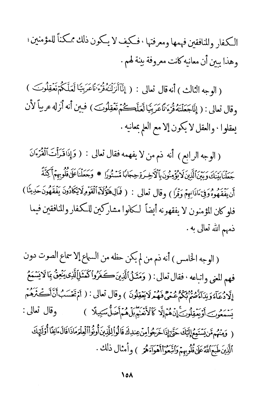 الْوَجْهُ الثَّالِثُ أَنَّهُ قَالَ تَعَالَى: {إنَّا أَنْزَلْنَاهُ قُرْآنًا عَرَبِيًّا لَعَلَّكُمْ تَعْقِلُونَ} وَقَالَ تَعَالَى: {إنَّا جَعَلْنَاهُ قُرْآنًا عَرَبِيًّا لَعَلَّكُمْ تَعْقِلُونَ} فَبَيَّنَ أَنَّهُ أَنْزَلَهُ عَرَبِيًّا لِأَنْ يَعْقِلُوا وَالْعَقْلُ لَا يَكُونُ إلَّا مَعَ الْعِلْمِ بِمَعَانِيهِ. (الْوَجْهُ الرَّابِعُ أَنَّهُ ذَمَّ مَنْ لَا يَفْهَمُهُ فَقَالَ تَعَالَى: {وَإِذَا قَرَأْتَ الْقُرْآنَ جَعَلْنَا بَيْنَكَ وَبَيْنَ الَّذِينَ لَا يُؤْمِنُونَ بِالْآخِرَةِ حِجَابًا مَسْتُورًا} {وَجَعَلْنَا عَلَى قُلُوبِهِمْ أَكِنَّةً أَنْ يَفْقَهُوهُ وَفِي آذَانِهِمْ وَقْرًا} وَقَالَ تَعَالَى: {فَمَالِ هَؤُلَاءِ الْقَوْمِ لَا يَكَادُونَ يَفْقَهُونَ حَدِيثًا} فَلَوْ كَانَ الْمُؤْمِنُونَ لَا يَفْقَهُونَهُ أَيْضًا لَكَانُوا مُشَارِكِينَ لِلْكُفَّارِ وَالْمُنَافِقِينَ فِيمَا ذَمَّهُمْ اللَّهُ تَعَالَى بِهِ. (الْوَجْهُ الْخَامِسُ أَنَّهُ ذَمَّ مَنْ لَمْ يَكُنْ حَظُّهُ مِنْ السَّمَاعِ إلَّا سَمَاعَ الصَّوْتِ دُونَ فَهْمِ الْمَعْنَى وَاتِّبَاعِهِ فَقَالَ تَعَالَى: {وَمَثَلُ الَّذِينَ كَفَرُوا كَمَثَلِ الَّذِي يَنْعِقُ بِمَا لَا يَسْمَعُ إلَّا دُعَاءً وَنِدَاءً صُمٌّ بُكْمٌ عُمْيٌ فَهُمْ لَا يَعْقِلُونَ} وَقَالَ تَعَالَى: {أَمْ تَحْسَبُ أَنَّ أَكْثَرَهُمْ يَسْمَعُونَ أَوْ يَعْقِلُونَ إنْ هُمْ إلَّا كَالْأَنْعَامِ بَلْ هُمْ أَضَلُّ سَبِيلًا} وَقَالَ تَعَالَى: {وَمِنْهُمْ مَنْ يَسْتَمِعُ إلَيْكَ حَتَّى إذَا خَرَجُوا مِنْ عِنْدِكَ قَالُوا لِلَّذِينَ أُوتُوا الْعِلْمَ مَاذَا قَالَ آنِفًا أُولَئِكَ الَّذِينَ طَبَعَ اللَّهُ عَلَى قُلُوبِهِمْ وَاتَّبَعُوا أَهْوَاءَهُمْ} وَأَمْثَالُ ذَلِكَ.