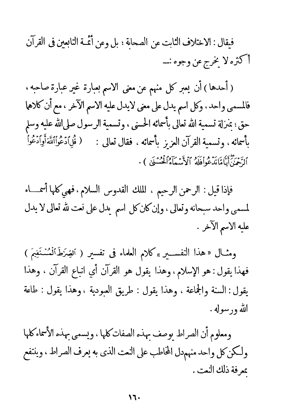 فَيُقَالُ: الِاخْتِلَافُ الثَّابِتُ عَنْ الصَّحَابَةِ؛ بَلْ وَعَنْ أَئِمَّةِ التَّابِعِينَ فِي الْقُرْآنِ أَكْثَرُهُ لَا يَخْرُجُ عَنْ وُجُوهٍ: - (أَحَدُهَا أَنْ يُعَبِّرَ كُلٌّ مِنْهُمْ عَنْ مَعْنَى الِاسْمِ بِعِبَارَةِ غَيْرِ عِبَارَةِ صَاحِبِهِ فَالْمُسَمَّى وَاحِدٌ وَكُلُّ اسْمٍ يَدُلُّ عَلَى مَعْنًى لَا يَدُلُّ عَلَيْهِ الِاسْمُ الْآخَرُ مَعَ أَنَّ كِلَاهُمَا حَقٌّ؛ بِمَنْزِلَةِ تَسْمِيَةِ اللَّهِ تَعَالَى بِأَسْمَائِهِ الْحُسْنَى وَتَسْمِيَةِ الرَّسُولِ صَلَّى اللَّهُ عَلَيْهِ وَسَلَّمَ بِأَسْمَائِهِ وَتَسْمِيَةِ الْقُرْآنِ الْعَزِيزِ بِأَسْمَائِهِ فَقَالَ تَعَالَى: {قُلِ ادْعُوا اللَّهَ أَوِ ادْعُوا الرَّحْمَنَ أَيًّا مَا تَدْعُوا فَلَهُ الْأَسْمَاءُ الْحُسْنَى} . فَإِذَا قِيلَ: الرَّحْمَنُ الرَّحِيمُ الْمَلِكُ الْقُدُّوسُ السَّلَامُ فَهِيَ كُلُّهَا أَسْمَاءٌ لِمُسَمَّى وَاحِدٍ سُبْحَانَهُ وَتَعَالَى وَإِنْ كَانَ كُلُّ اسْمٍ يَدُلُّ عَلَى نَعْتٍ لِلَّهِ تَعَالَى لَا يَدُلُّ عَلَيْهِ الِاسْمُ الْآخَرُ. وَمِثَالُ " هَذَا التَّفْسِيرِ " كَلَامُ الْعُلَمَاءِ فِي تَفْسِيرِ {الصِّرَاطَ الْمُسْتَقِيمَ} فَهَذَا يَقُولُ: هُوَ الْإِسْلَامُ وَهَذَا يَقُولُ هُوَ الْقُرْآنُ أَيْ اتِّبَاعُ الْقُرْآنِ وَهَذَا يَقُولُ: السُّنَّةُ وَالْجَمَاعَةُ وَهَذَا يَقُولُ: طَرِيقُ الْعُبُودِيَّةِ وَهَذَا يَقُولُ: طَاعَةُ اللَّهِ وَرَسُولِهِ. وَمَعْلُومٌ أَنَّ الصِّرَاطَ يُوصَفُ بِهَذِهِ الصِّفَاتِ كُلِّهَا وَيُسَمَّى بِهَذِهِ الْأَسْمَاءِ كُلِّهَا وَلَكِنَّ كُلَّ وَاحِدٍ مِنْهُمْ دَلَّ الْمُخَاطَبَ عَلَى النَّعْتِ الَّذِي بِهِ يُعْرَفُ الصِّرَاطُ وَيَنْتَفِعُ بِمَعْرِفَةِ ذَلِكَ النَّعْتِ.