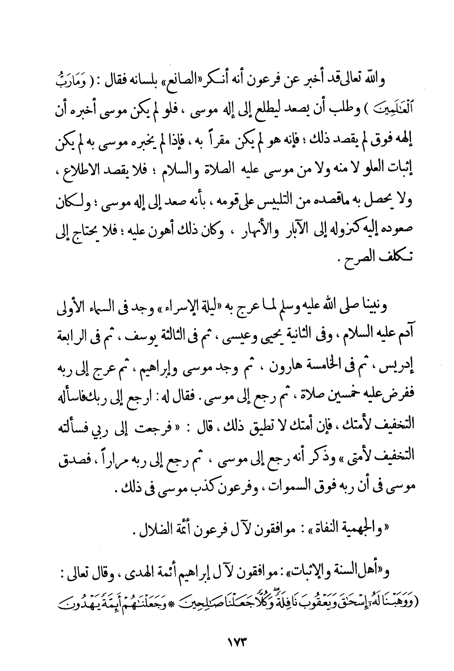 وَاَللَّهُ تَعَالَى قَدْ أَخْبَرَ عَنْ فِرْعَوْنَ أَنَّهُ أَنْكَرَ " الصَّانِعَ " بِلِسَانِهِ فَقَالَ: {وَمَا رَبُّ الْعَالَمِينَ} وَطَلَبَ أَنْ يَصْعَدَ لِيَطَّلِعَ إلَى إلَهِ مُوسَى فَلَوْ لَمْ يَكُنْ مُوسَى أَخْبَرَهُ أَنَّ إلَهَهُ فَوْقُ لَمْ يَقْصِدْ ذَلِكَ؛ فَإِنَّهُ هُوَ لَمْ يَكُنْ مُقِرًّا بِهِ فَإِذَا لَمْ يُخْبِرُهُ مُوسَى بِهِ لَمْ يَكُنْ إثْبَاتُ الْعُلُوِّ لَا مِنْهُ وَلَا مِنْ مُوسَى؛ فَلَا يَقْصِدُ الِاطِّلَاعَ وَلَا يَحْصُلُ بِهِ مَا قَصَدَهُ مِنْ التَّلْبِيسِ عَلَى قَوْمِهِ بِأَنَّهُ صَعِدَ إلَى إلَهِ مُوسَى؛ وَلَكَانَ صُعُودُهُ إلَيْهِ كَنُزُولِهِ إلَى الْآبَارِ وَالْأَنْهَارِ وَكَانَ ذَلِكَ أَهْوَنَ عَلَيْهِ؛ فَلَا يَحْتَاجُ إلَى تَكَلُّفِ الصَّرْحِ. {وَنَبِيُّنَا صَلَّى اللَّهُ عَلَيْهِ وَسَلَّمَ لَمَّا عُرِجَ بِهِ لَيْلَةَ الْإِسْرَاءِ وَجَدَ فِي السَّمَاءِ الْأُولَى آدَمَ عَلَيْهِ السَّلَامُ وَفِي الثَّانِيَةِ يَحْيَى وَعِيسَى ثُمَّ فِي الثَّالِثَةِ يُوسُفَ ثُمَّ فِي الرَّابِعَةِ إدْرِيسَ ثُمَّ فِي الْخَامِسَةِ هَارُونَ ثُمَّ وَجَدَ مُوسَى وَإِبْرَاهِيمَ ثُمَّ عَرَجَ إلَى رَبِّهِ فَفَرَضَ عَلَيْهِ خَمْسِينَ صَلَاةً ثُمَّ رَجَعَ إلَى مُوسَى. فَقَالَ لَهُ: ارْجِعْ إلَى رَبِّك فَاسْأَلْهُ التَّخْفِيفَ لِأُمَّتِك فَإِنَّ أُمَّتَك لَا تُطِيقُ ذَلِكَ قَالَ: فَرَجَعْت إلَى رَبِّي فَسَأَلْته التَّخْفِيفَ لِأُمَّتِي وَذَكَرَ أَنَّهُ رَجَعَ إلَى مُوسَى ثُمَّ رَجَعَ إلَى رَبِّهِ مِرَارًا} فَصَدَقَ مُوسَى فِي أَنَّ رَبَّهُ فَوْقَ السَّمَوَاتِ وَفِرْعَوْنُ كَذَّبَ مُوسَى فِي ذَلِكَ. " وَالْجَهْمِيَّة الْنُّفَاةِ ": مُوَافِقُونَ لِآلِ فِرْعَوْنَ أَئِمَّةِ الضَّلَالِ. وَ " أَهْلُ السُّنَّةِ وَالْإِثْبَاتِ ": مُوَافِقُونَ لِآلِ إبْرَاهِيمَ أَئِمَّةِ الْهُدَى وَقَالَ تَعَالَى: {وَوَهَبْنَا لَهُ إسْحَاقَ وَيَعْقُوبَ نَافِلَةً وَكُلًّا جَعَلْنَا صَالِحِينَ} {وَجَعَلْنَاهُمْ أَئِمَّةً يَهْدُونَ