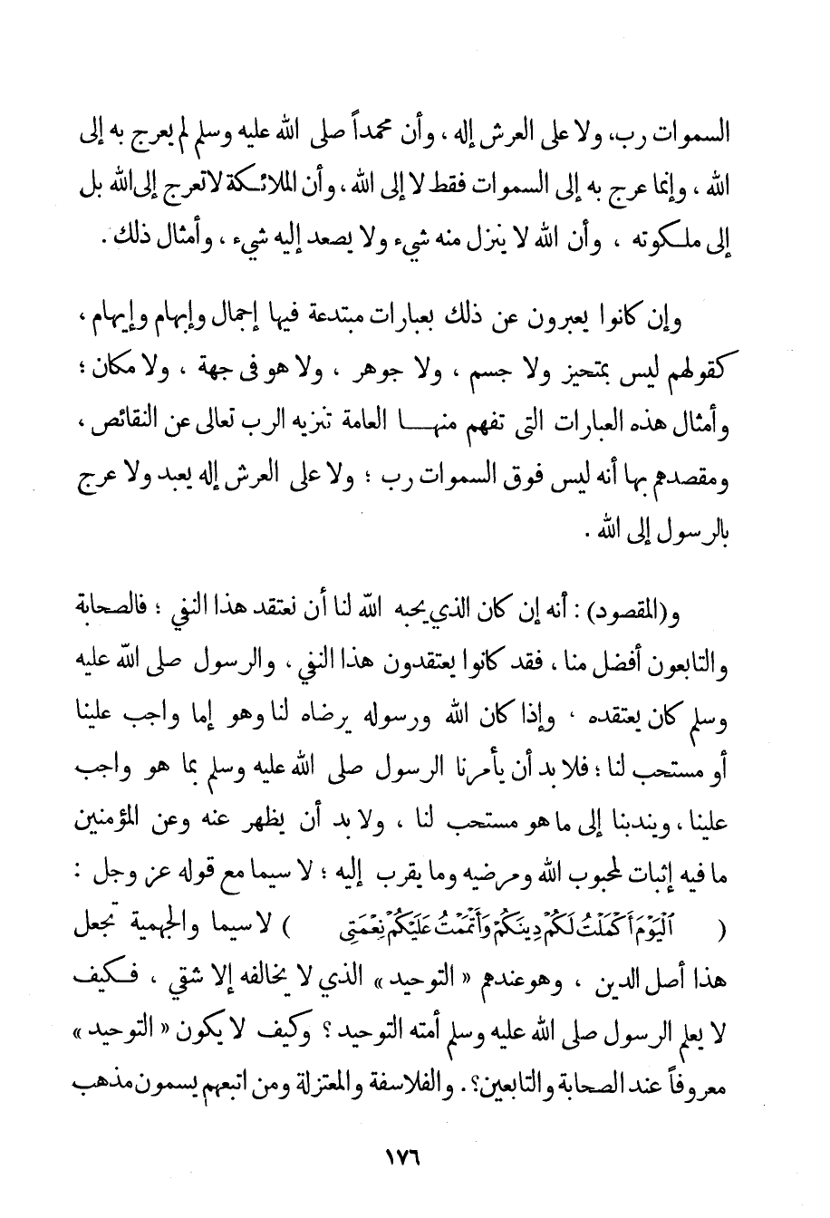 السَّمَوَاتِ رَبٌّ وَلَا عَلَى الْعَرْشِ إلَهٌ وَأَنَّ مُحَمَّدًا صَلَّى اللَّهُ عَلَيْهِ وَسَلَّمَ لَمْ يُعْرَجْ بِهِ إلَى اللَّهِ وَإِنَّمَا عُرِجَ بِهِ إلَى السَّمَوَاتِ فَقَطْ لَا إلَى اللَّهِ وَأَنَّ الْمَلَائِكَةَ لَا تَعْرُجُ إلَى اللَّهِ بَلْ إلَى مَلَكُوتِهِ وَأَنَّ اللَّهَ لَا يَنْزِلُ مِنْهُ شَيْءٌ وَلَا يَصْعَدُ إلَيْهِ شَيْءٌ وَأَمْثَالُ ذَلِكَ. وَإِنْ كَانُوا يُعَبِّرُونَ عَنْ ذَلِكَ بِعِبَارَاتِ مُبْتَدَعَةٍ فِيهَا إجْمَالٌ وَإِبْهَامٌ وَإِيهَامٌ كَقَوْلِهِمْ لَيْسَ بِمُتَحَيِّزِ وَلَا جِسْمٍ وَلَا جَوْهَرٍ وَلَا هُوَ فِي جِهَةٍ وَلَا مَكَانٍ؛ وَأَمْثَالُ هَذِهِ الْعِبَارَاتِ الَّتِي تَفْهَمُ مِنْهَا الْعَامَّةُ تَنْزِيهَ الرَّبِّ تَعَالَى عَنْ النَّقَائِصِ وَمَقْصِدُهُمْ بِهَا أَنَّهُ لَيْسَ فَوْقَ السَّمَوَاتِ رَبٌّ؛ وَلَا عَلَى الْعَرْشِ إلَهٌ يُعْبَدُ وَلَا عُرِجَ بِالرَّسُولِ إلَى اللَّهِ. وَ (الْمَقْصُودُ: أَنَّهُ إنْ كَانَ الَّذِي يُحِبُّهُ اللَّهُ لَنَا أَنْ نَعْتَقِدَ هَذَا النَّفْيَ؛ فَالصَّحَابَةُ وَالتَّابِعُونَ أَفْضَلُ مِنَّا فَقَدْ كَانُوا يَعْتَقِدُونَ هَذَا النَّفْيَ وَالرَّسُولُ صَلَّى اللَّهُ عَلَيْهِ وَسَلَّمَ كَانَ يَعْتَقِدُهُ وَإِذَا كَانَ اللَّهُ وَرَسُولُهُ يَرْضَاهُ لَنَا وَهُوَ إمَّا وَاجِبٌ عَلَيْنَا أَوْ مُسْتَحَبٌّ لَنَا؛ فَلَا بُدَّ أَنْ يَأْمُرَنَا الرَّسُولُ صَلَّى اللَّهُ عَلَيْهِ وَسَلَّمَ بِمَا هُوَ وَاجِبٌ عَلَيْنَا وَيَنْدُبُنَا إلَى مَا هُوَ مُسْتَحَبٌّ لَنَا وَلَا بُدَّ أَنْ يَظْهَرَ عَنْهُ وَعَنْ الْمُؤْمِنِينَ مَا فِيهِ إثْبَاتٌ لِمَحْبُوبِ اللَّهِ وَمُرْضِيهِ وَمَا يُقَرِّبُ إلَيْهِ؛ لَا سِيَّمَا مَعَ قَوْلِهِ عَزَّ وَجَلَّ: {الْيَوْمَ أَكْمَلْتُ لَكُمْ دِينَكُمْ وَأَتْمَمْتُ عَلَيْكُمْ نِعْمَتِي} لَا سِيَّمَا وَالْجَهْمِيَّة تَجْعَلُ هَذَا أَصْلَ الدِّينِ وَهُوَ عِنْدَهُمْ " التَّوْحِيدُ " الَّذِي لَا يُخَالِفُهُ إلَّا شَقِيٌّ فَكَيْفَ لَا يُعَلِّمُ الرَّسُولُ صَلَّى اللَّهُ عَلَيْهِ وَسَلَّمَ أُمَّتَهُ التَّوْحِيدَ؟ وَكَيْفَ لَا يَكُونُ " التَّوْحِيدُ " مَعْرُوفًا عِنْدَ الصَّحَابَةِ وَالتَّابِعِينَ؟ . وَالْفَلَاسِفَةُ وَالْمُعْتَزِلَةُ