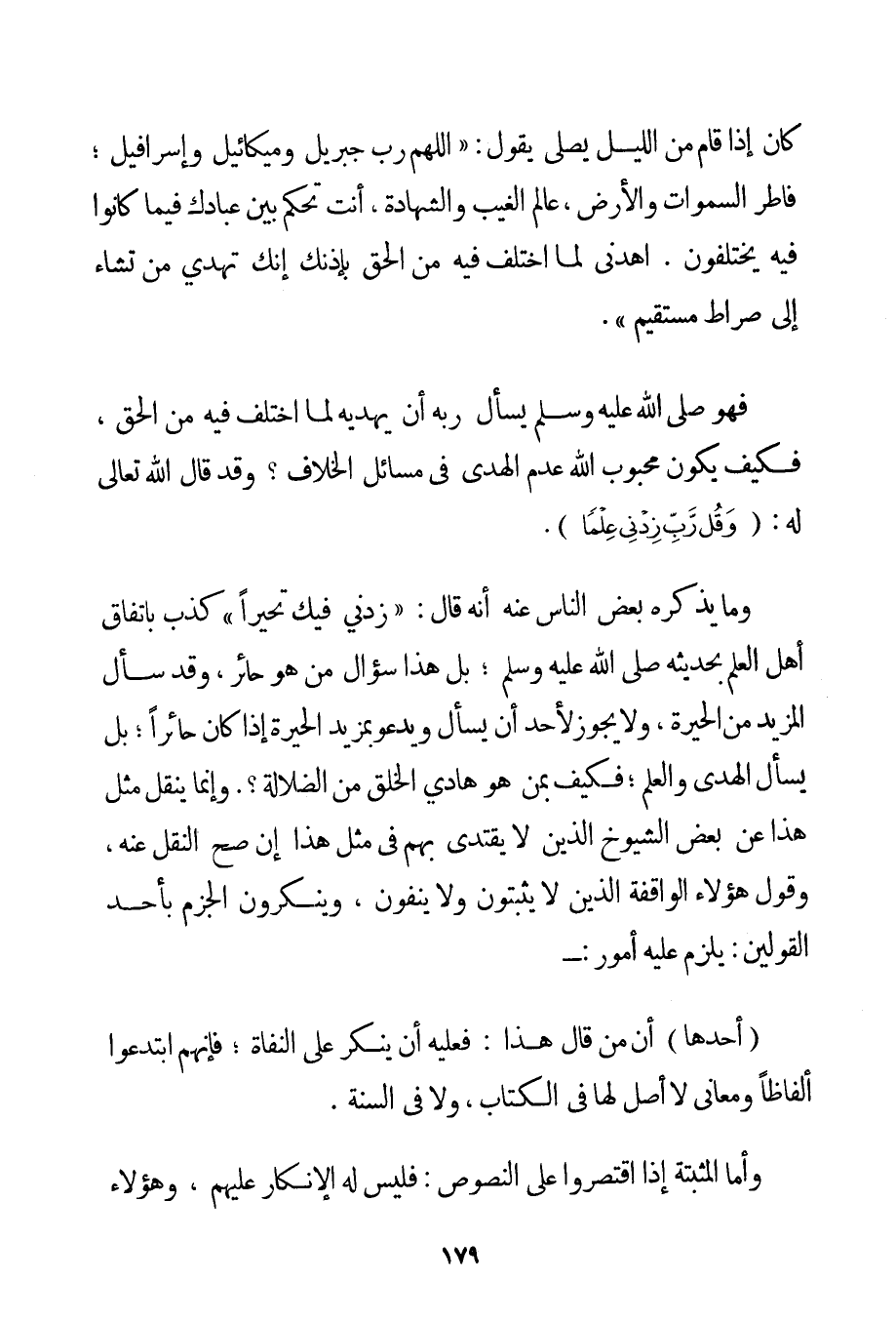 كَانَ إذَا قَامَ مِنْ اللَّيْلِ يُصَلِّي يَقُولُ: اللَّهُمَّ رَبَّ جِبْرِيلَ وميكائيل وَإِسْرَافِيلَ؛ فَاطِرَ السَّمَوَاتِ وَالْأَرْضِ عَالِمَ الْغَيْبِ وَالشَّهَادَةِ أَنْتَ تَحْكُمُ بَيْنَ عِبَادِك فِيمَا كَانُوا فِيهِ يَخْتَلِفُونَ. اهْدِنِي لِمَا اُخْتُلِفَ فِيهِ مِنْ الْحَقِّ بِإِذْنِك إنَّك تَهْدِي مَنْ تَشَاءُ إلَى صِرَاطٍ مُسْتَقِيمٍ} . فَهُوَ صَلَّى اللَّهُ عَلَيْهِ وَسَلَّمَ يَسْأَلُ رَبَّهُ أَنْ يَهْدِيَهُ لِمَا اُخْتُلِفَ فِيهِ مِنْ الْحَقِّ فَكَيْفَ يَكُونُ مَحْبُوبُ اللَّهِ عَدَمَ الْهُدَى فِي مَسَائِلِ الْخِلَافِ؟ وَقَدْ قَالَ اللَّهُ تَعَالَى لَهُ: {وَقُلْ رَبِّ زِدْنِي عِلْمًا} . وَمَا يَذْكُرُهُ بَعْضُ النَّاسِ عَنْهُ أَنَّهُ قَالَ: {زِدْنِي فِيك تَحَيُّرًا} كَذِبٌ بِاتِّفَاقِ أَهْلِ الْعِلْمِ بِحَدِيثِهِ صَلَّى اللَّهُ عَلَيْهِ وَسَلَّمَ بَلْ هَذَا سُؤَالٌ مَنْ هُوَ حَائِرٌ وَقَدْ سَأَلَ الْمَزِيدَ مِنْ الْحَيْرَةِ وَلَا يَجُوزُ لِأَحَدِ أَنْ يَسْأَلَ وَيَدْعُوَ بِمَزِيدِ الْحَيْرَةِ إذَا كَانَ حَائِرًا؛ بَلْ يَسْأَلُ الْهُدَى وَالْعِلْمَ؛ فَكَيْفَ بِمَنْ هُوَ هَادِي الْخَلْقِ مِنْ الضَّلَالَةِ؟ . وَإِنَّمَا يُنْقَلُ مِثْلُ هَذَا عَنْ بَعْضِ الشُّيُوخِ الَّذِينَ لَا يُقْتَدَى بِهِمْ فِي مِثْلِ هَذَا إنْ صَحَّ النَّقْلُ عَنْهُ، وَقَوْلُ هَؤُلَاءِ الْوَاقِفَةِ الَّذِينَ لَا يُثْبِتُونَ وَلَا يَنْفُونَ وَيُنْكِرُونَ الْجَزْمَ بِأَحَدِ الْقَوْلَيْنِ: يَلْزَمُ عَلَيْهِ أُمُورٌ: