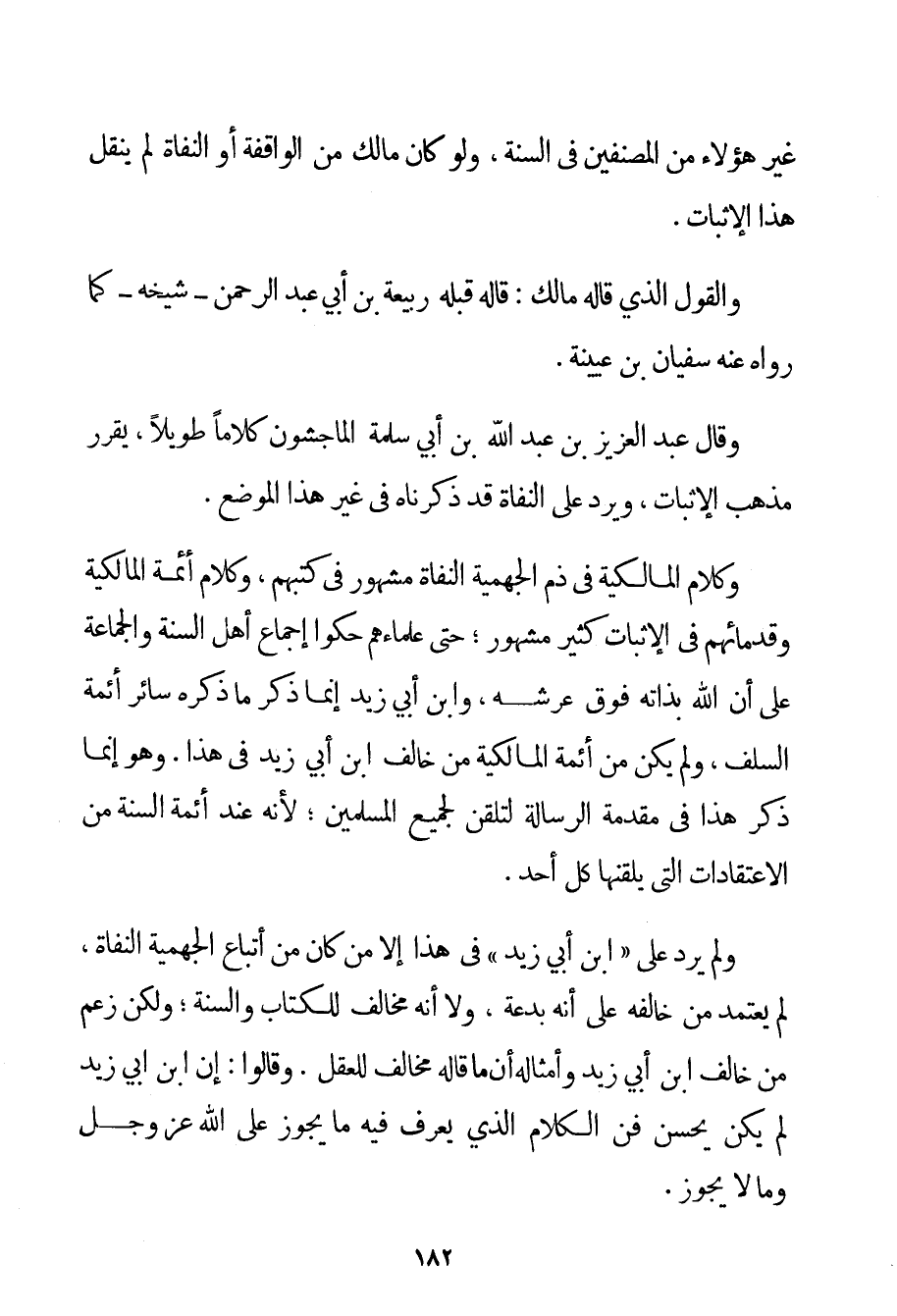 غَيْرِ هَؤُلَاءِ مِنْ الْمُصَنِّفِينَ فِي السُّنَّةِ وَلَوْ كَانَ مَالِكٌ مِنْ الْوَاقِفَةِ أَوْ الْنُّفَاةِ لَمْ يُنْقَلْ هَذَا الْإِثْبَاتُ. وَالْقَوْلُ الَّذِي قَالَهُ مَالِكٌ: قَالَهُ قَبْلَهُ رَبِيعَةُ بْنُ أَبِي عَبْدِ الرَّحْمَنِ - شَيْخُهُ - كَمَا رَوَاهُ عَنْهُ سُفْيَانُ بْنُ عُيَيْنَة. وَقَالَ عَبْدُ الْعَزِيزِ بْنُ عَبْدِ اللَّهِ بْنِ أَبِي سَلَمَةَ الماجشون كَلَامًا طَوِيلًا يُقَرِّرُ مَذْهَبَ الْإِثْبَاتِ وَيَرُدُّ عَلَى الْنُّفَاةِ قَدْ ذَكَرْنَاهُ فِي غَيْرِ هَذَا الْمَوْضِعِ.