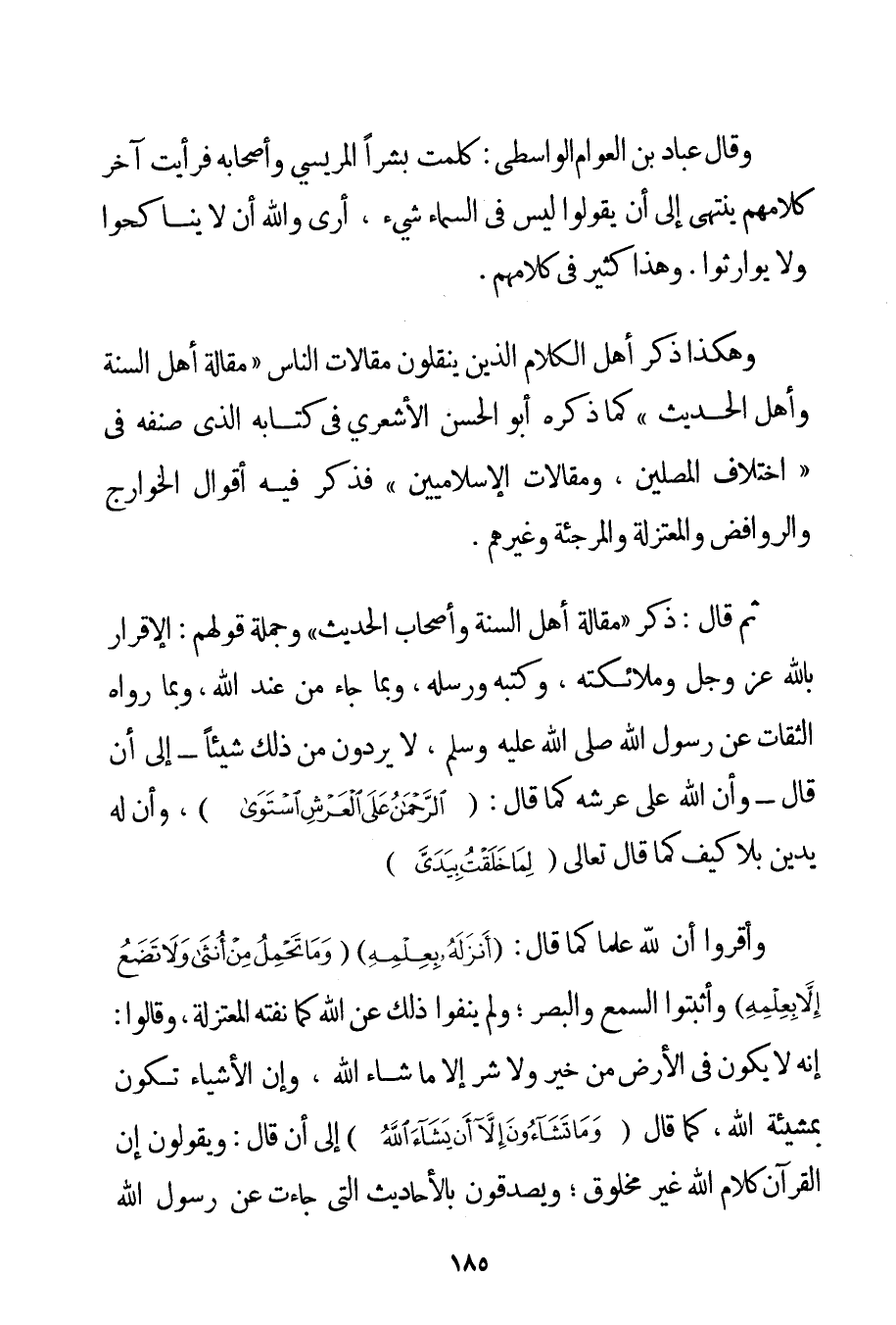 وَقَالَ عَبَّادُ بْنُ الْعَوَّامِ الواسطي: كَلَّمْت بِشْرًا الْمَرِيسِيَّ وَأَصْحَابَهُ فَرَأَيْت آخِرَ كَلَامِهِمْ يَنْتَهِي إلَى أَنْ يَقُولُوا لَيْسَ فِي السَّمَاءِ شَيْءٌ أَرَى وَاَللَّهِ أَنْ لَا يُنَاكَحُوا وَلَا يوارثوا. وَهَذَا كَثِيرٌ فِي كَلَامِهِمْ. وَهَكَذَا ذَكَرَ أَهْلُ الْكَلَامِ الَّذِينَ يَنْقُلُونَ مَقَالَاتِ النَّاسِ " مَقَالَةُ أَهْلِ السُّنَّةِ وَأَهْلِ الْحَدِيثِ " كَمَا ذَكَرَهُ أَبُو الْحَسَنِ الْأَشْعَرِيُّ فِي كِتَابِهِ الَّذِي صَنَّفَهُ فِي " اخْتِلَافِ الْمُصَلِّينَ وَمَقَالَاتِ الْإِسْلَامِيِّينَ " فَذَكَرَ فِيهِ أَقْوَالَ الْخَوَارِجِ وَالرَّوَافِضِ وَالْمُعْتَزِلَةِ وَالْمُرْجِئَةِ وَغَيْرِهِمْ. ثُمَّ قَالَ: ذَكَرَ " مَقَالَةِ أَهْلِ السُّنَّةِ وَأَصْحَابِ الْحَدِيثِ " وَجُمْلَةُ قَوْلِهِمْ: الْإِقْرَارُ بِاَللَّهِ عَزَّ وَجَلَّ وَمَلَائِكَتِهِ وَكُتُبِهِ وَرُسُلِهِ وَبِمَا جَاءَ مِنْ عِنْدِ اللَّهِ وَبِمَا رَوَاهُ الثِّقَاتُ عَنْ رَسُولِ اللَّهِ صَلَّى اللَّهُ عَلَيْهِ وَسَلَّمَ لَا يَرُدُّونَ مِنْ ذَلِكَ شَيْئًا - إلَى أَنْ قَالَ - وَأَنَّ اللَّهَ عَلَى عَرْشِهِ كَمَا قَالَ: {الرَّحْمَنُ عَلَى الْعَرْشِ اسْتَوَى} وَأَنَّ لَهُ يَدَيْنِ بِلَا كَيْفٍ كَمَا قَالَ تَعَالَى {لِمَا خَلَقْتُ بِيَدَيَّ} وَأَقَرُّوا أَنَّ لِلَّهِ عِلْمًا كَمَا قَالَ: {أَنْزَلَهُ بِعِلْمِهِ} {وَمَا تَحْمِلُ مِنْ أُنْثَى وَلَا تَضَعُ إلَّا بِعِلْمِهِ} وَأَثْبَتُوا السَّمْعَ وَالْبَصَرَ؛ وَلَمْ يَنْفُوا ذَلِكَ عَنْ اللَّهِ كَمَا نَفَتْهُ الْمُعْتَزِلَةُ وَقَالُوا: إنَّهُ لَا يَكُونُ فِي الْأَرْضِ مِنْ خَيْرٍ وَلَا شَرٍّ إلَّا مَا شَاءَ اللَّهُ وَإِنَّ الْأَشْيَاءَ تَكُونُ بِمَشِيئَةِ اللَّهِ كَمَا قَالَ {وَمَا تَشَاءُونَ إلَّا أَنْ يَشَاءَ اللَّهُ} إلَى أَنْ قَالَ: وَيَقُولُونَ إنَّ الْقُرْآنَ كَلَامُ اللَّهِ غَيْرُ مَخْلُوقٍ؛ وَيُصَدِّقُونَ بِالْأَحَادِيثِ الَّتِي جَاءَتْ عَنْ رَسُولِ اللَّهِ