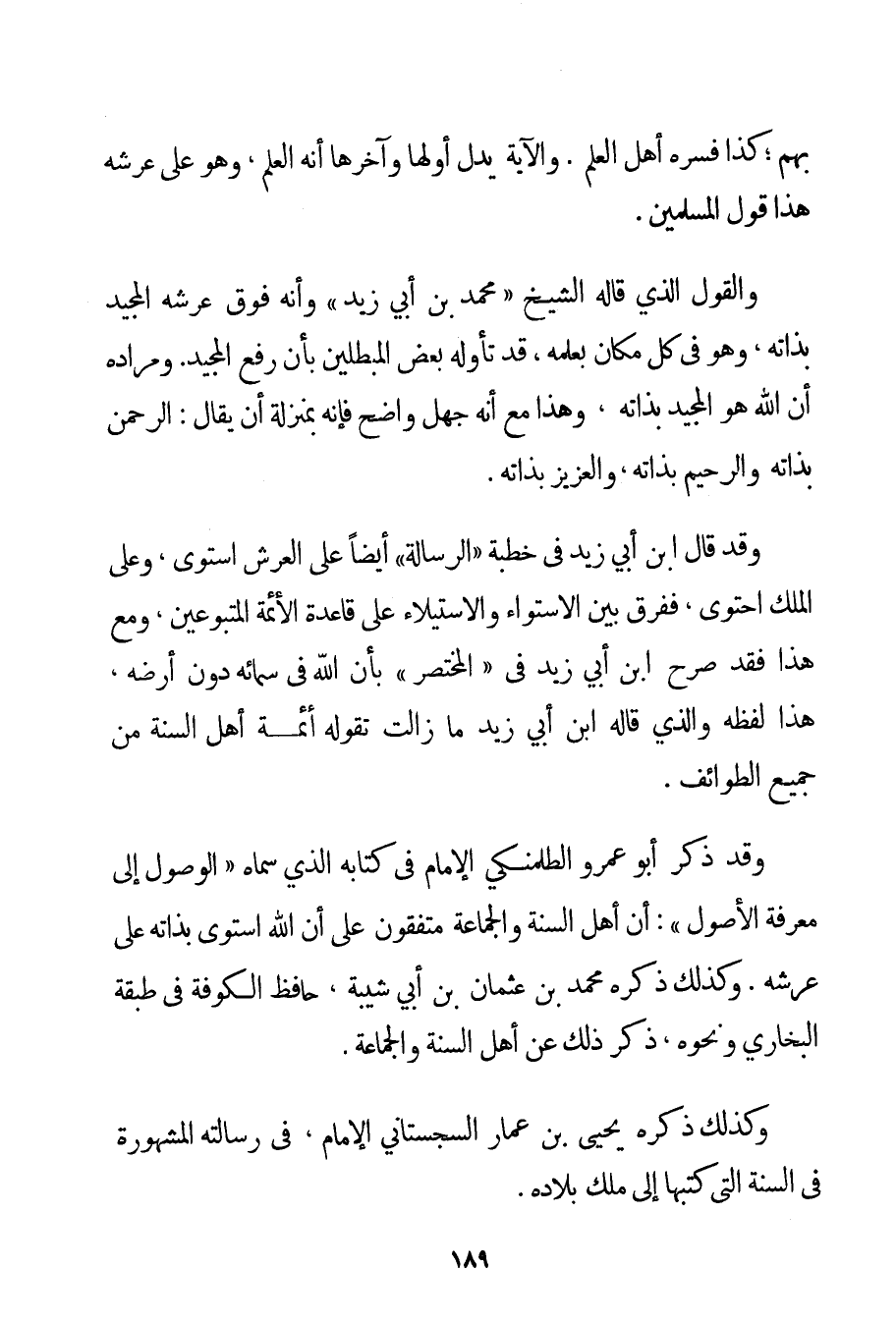 بِهِمْ؛ كَذَا فَسَّرَهُ أَهْلُ الْعِلْمِ. وَالْآيَةُ يَدُلُّ أَوَّلُهَا وَآخِرُهَا أَنَّهُ الْعِلْمُ وَهُوَ عَلَى عَرْشِهِ هَذَا قَوْلُ الْمُسْلِمِينَ. وَالْقَوْلُ الَّذِي قَالَهُ الشَّيْخُ " مُحَمَّدُ بْنُ أَبِي زَيْدٍ " وَأَنَّهُ فَوْقَ عَرْشِهِ الْمَجِيدُ بِذَاتِهِ وَهُوَ فِي كُلِّ مَكَانٍ بِعِلْمِهِ قَدْ تَأَوَّلَهُ بَعْضُ الْمُبْطِلِينَ بِأَنْ رَفَعَ الْمَجِيدَ. وَمُرَادُهُ أَنَّ اللَّهَ هُوَ الْمَجِيدُ بِذَاتِهِ وَهَذَا مَعَ أَنَّهُ جَهْلٌ وَاضِحٌ فَإِنَّهُ بِمَنْزِلَةِ أَنْ يُقَالَ: الرَّحْمَنُ بِذَاتِهِ وَالرَّحِيمُ بِذَاتِهِ وَالْعَزِيزُ بِذَاتِهِ. وَقَدْ قَالَ ابْنُ أَبِي زَيْدٍ فِي خُطْبَةِ " الرِّسَالَةِ " أَيْضًا عَلَى الْعَرْشِ اسْتَوَى وَعَلَى الْمُلْكِ احْتَوَى فَفَرَّقَ بَيْنَ الِاسْتِوَاءِ وَالِاسْتِيلَاءِ عَلَى قَاعِدَةِ الْأَئِمَّةِ الْمَتْبُوعِينَ وَمَعَ هَذَا فَقَدَ صَرَّحَ ابْنُ أَبِي زَيْدٍ فِي " الْمُخْتَصَرِ " بِأَنَّ اللَّهَ فِي سَمَائِهِ دُونَ أَرْضِهِ هَذَا لَفْظُهُ وَاَلَّذِي قَالَهُ ابْنُ أَبِي زَيْدٍ مَا زَالَتْ تَقُولُهُ أَئِمَّةُ أَهْلِ السُّنَّةِ مِنْ جَمِيعِ الطَّوَائِفِ. وَقَدْ ذَكَرَ أَبُو عَمْرٍو الطلمنكي الْإِمَامُ فِي كِتَابِهِ الَّذِي سَمَّاهُ " الْوُصُولُ إلَى مَعْرِفَةِ الْأُصُولِ ": أَنَّ أَهْلَ السُّنَّةِ وَالْجَمَاعَةِ مُتَّفِقُونَ عَلَى أَنَّ اللَّهَ اسْتَوَى بِذَاتِهِ عَلَى عَرْشِهِ. وَكَذَلِكَ ذَكَرَهُ مُحَمَّدُ بْنُ عُثْمَانَ بْنِ أَبِي شَيْبَةَ حَافِظُ الْكُوفَةِ فِي طَبَقَةِ الْبُخَارِيِّ وَنَحْوِهِ ذَكَرَ ذَلِكَ عَنْ أَهْلِ السُّنَّةِ وَالْجَمَاعَةِ. وَكَذَلِكَ ذَكَرَهُ يَحْيَى بْنُ عَمَّارٍ السجستاني الْإِمَامُ فِي رِسَالَتِهِ الْمَشْهُورَةِ فِي السُّنَّةِ الَّتِي كَتَبَهَا إلَى مَلِكِ بِلَادِهِ.