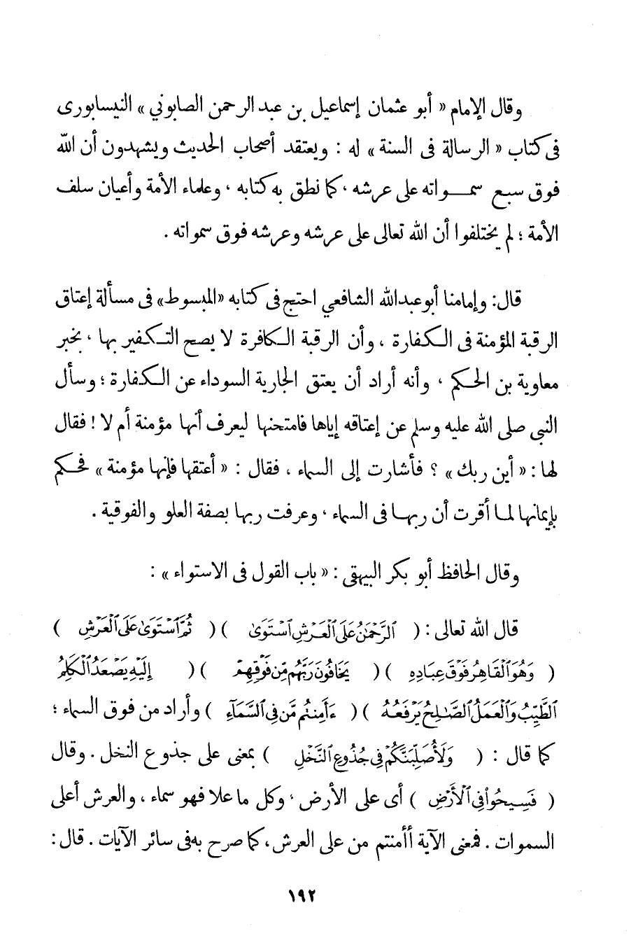 وَقَالَ الْإِمَامُ أَبُو عُثْمَانَ إسْمَاعِيلُ بْنُ عَبْدِ الرَّحْمَنِ الصَّابُونِيُّ النَّيْسَابُورِيُّ فِي كِتَابِ " الرِّسَالَةِ فِي السُّنَّةِ " لَهُ: وَيَعْتَقِدُ أَصْحَابُ الْحَدِيثِ وَيَشْهَدُونَ أَنَّ اللَّهَ فَوْقَ سَبْعِ سَمَوَاتِهِ عَلَى عَرْشِهِ كَمَا نَطَقَ بِهِ كِتَابُهُ وَعُلَمَاءُ الْأُمَّةِ وَأَعْيَانُ سَلَفِ الْأُمَّةِ؛ لَمْ يَخْتَلِفُوا أَنَّ اللَّهَ تَعَالَى عَلَى عَرْشِهِ وَعَرْشَهُ فَوْقَ سَمَوَاتِهِ. قَالَ: وَإِمَامُنَا أَبُو عَبْدِ اللَّهِ الشَّافِعِيُّ احْتَجَّ فِي كِتَابِهِ " الْمَبْسُوطِ " فِي مَسْأَلَةِ إعْتَاقِ الرَّقَبَةِ الْمُؤْمِنَةِ فِي الْكَفَّارَةِ وَأَنَّ الرَّقَبَةَ الْكَافِرَةَ لَا يَصِحُّ التَّكْفِيرُ بِهَا بِخَبَرِ {مُعَاوِيَةَ بْنِ الْحَكَمِ وَأَنَّهُ أَرَادَ أَنْ يَعْتِقَ الْجَارِيَةَ السَّوْدَاءَ عَنْ الْكَفَّارَةِ؛ وَسَأَلَ النَّبِيَّ صَلَّى اللَّهُ عَلَيْهِ وَسَلَّمَ عَنْ إعْتَاقِهِ إيَّاهَا فَامْتَحَنَهَا لِيَعْرِفَ أَنَّهَا مُؤْمِنَةٌ أَمْ لَا فَقَالَ لَهَا: أَيْنَ رَبُّك؟ فَأَشَارَتْ إلَى السَّمَاءِ فَقَالَ: أَعْتِقْهَا فَإِنَّهَا مُؤْمِنَةٌ} فَحَكَمَ بِإِيمَانِهَا لَمَّا أَقَرَّتْ أَنَّ رَبَّهَا فِي السَّمَاءِ وَعَرَفْت رَبَّهَا بِصِفَةِ الْعُلُوِّ وَالْفَوْقِيَّةِ. وَقَالَ الْحَافِظُ أَبُو بَكْرٍ البيهقي: " بَابُ الْقَوْلِ فِي الِاسْتِوَاءِ ": قَالَ اللَّهُ تَعَالَى: {الرَّحْمَنُ عَلَى الْعَرْشِ اسْتَوَى} {ثُمَّ اسْتَوَى عَلَى الْعَرْشِ} {وَهُوَ الْقَاهِرُ فَوْقَ عِبَادِهِ} {يَخَافُونَ رَبَّهُمْ مِنْ فَوْقِهِمْ} {إلَيْهِ يَصْعَدُ الْكَلِمُ الطَّيِّبُ وَالْعَمَلُ الصَّالِحُ يَرْفَعُهُ} {أَأَمِنْتُمْ مَنْ فِي السَّمَاءِ} وَأَرَادَ مَنْ فَوْقِ السَّمَاءِ؛ كَمَا قَالَ: {وَلَأُصَلِّبَنَّكُم فِي جُذُوعِ النَّخْلِ} بِمَعْنَى عَلَى جُذُوعِ النَّخْلِ. وَقَالَ {فَسِيحُوا فِي الْأَرْضِ} أَيْ عَلَى الْأَرْضِ وَكُلُّ مَا عَلَا فَهُوَ سَمَاءٌ وَالْعَرْشُ أَعْلَى السَّمَوَاتِ. فَمَعْنَى الْآيَةِ أَأَمِنْتُمْ مَنْ عَلَى الْعَرْشِ كَمَا صَرَّحَ بِهِ فِي سَائِرِ الْآيَاتِ. قَالَ: