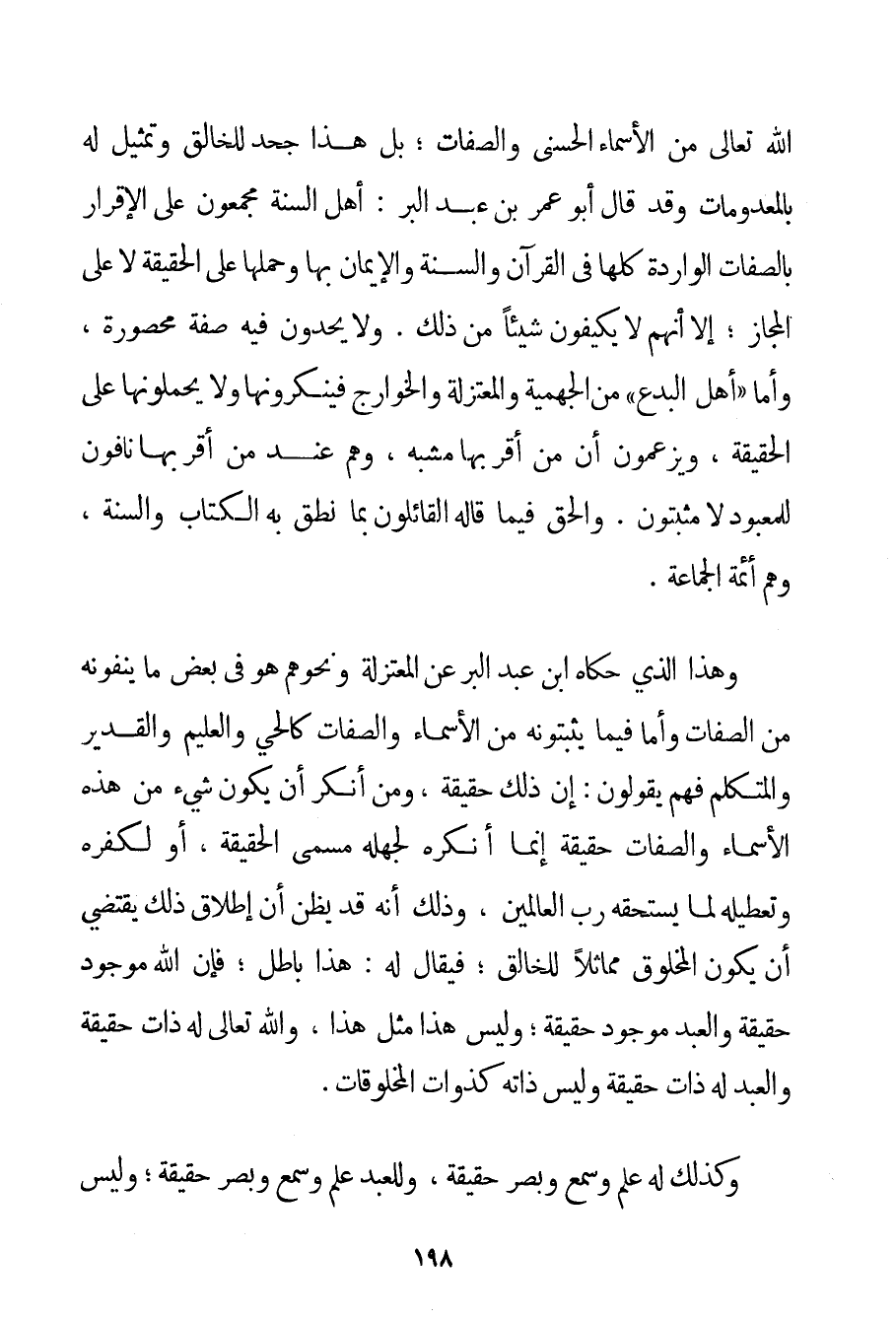 اللَّهُ تَعَالَى مِنْ الْأَسْمَاءِ الْحُسْنَى وَالصِّفَاتِ؛ بَلْ هَذَا جَحْدٌ لِلْخَالِقِ وَتَمْثِيلٌ لَهُ بِالْمَعْدُومَاتِ وَقَدْ قَالَ أَبُو عُمَرَ بْنُ عَبْدِ الْبَرِّ: أَهْلُ السُّنَّةِ مُجْمِعُونَ عَلَى الْإِقْرَارِ بِالصِّفَاتِ الْوَارِدَةِ كُلِّهَا فِي الْقُرْآنِ وَالسُّنَّةِ وَالْإِيمَانِ بِهَا وَحَمْلِهَا عَلَى الْحَقِيقَةِ لَا عَلَى الْمَجَازِ؛ إلَّا أَنَّهُمْ لَا يُكَيِّفُونَ شَيْئًا مِنْ ذَلِكَ. وَلَا يَحُدُّونَ فِيهِ صِفَةً مَحْصُورَةً وَأَمَّا " أَهْلُ الْبِدَعِ " مَنْ الْجَهْمِيَّة وَالْمُعْتَزِلَةِ وَالْخَوَارِجِ فَيُنْكِرُونَهَا وَلَا يَحْمِلُونَهَا عَلَى الْحَقِيقَةِ وَيَزْعُمُونَ أَنَّ مَنْ أَقَرَّ بِهَا مُشَبِّهٌ وَهُمْ عِنْدَ مَنْ أَقَرَّ بِهَا نَافُونَ لِلْمَعْبُودِ لَا مُثْبِتُونَ. وَالْحَقُّ فِيمَا قَالَهُ الْقَائِلُونَ بِمَا نَطَقَ بِهِ الْكِتَابُ وَالسُّنَّةُ وَهُمْ وَأَئِمَّةُ الْجَمَاعَةِ. وَهَذَا الَّذِي حَكَاهُ ابْنُ عَبْدِ الْبَرِّ عَنْ الْمُعْتَزِلَةِ وَنَحْوِهِمْ هُوَ فِي بَعْضِ مَا يَنْفُونَهُ مِنْ الصِّفَاتِ وَأَمَّا فِيمَا يُثْبِتُونَهُ مِنْ الْأَسْمَاءِ وَالصِّفَاتِ كَالْحَيِّ وَالْعَلِيمِ وَالْقَدِيرِ وَالْمُتَكَلِّمِ فَهُمْ يَقُولُونَ: إنَّ ذَلِكَ حَقِيقَةٌ وَمَنْ أَنْكَرَ أَنْ يَكُونَ شَيْءٌ مِنْ هَذِهِ الْأَسْمَاءِ وَالصِّفَاتِ حَقِيقَةً إنَّمَا أَنْكَرَهُ لِجَهْلِهِ مُسَمَّى الْحَقِيقَةِ أَوْ لِكُفْرِهِ وَتَعْطِيلِهِ لِمَا يَسْتَحِقُّهُ رَبُّ الْعَالَمِينَ وَذَلِكَ أَنَّهُ قَدْ يَظُنُّ أَنَّ إطْلَاقَ ذَلِكَ يَقْتَضِي أَنْ يَكُونَ الْمَخْلُوقُ مُمَاثِلًا لِلْخَالِقِ فَيُقَالُ لَهُ: هَذَا بَاطِلٌ؛ فَإِنَّ اللَّهَ مَوْجُودٌ حَقِيقَةً وَالْعَبْدَ مَوْجُودٌ حَقِيقَةً؛ وَلَيْسَ هَذَا مِثْلُ هَذَا وَاَللَّهُ تَعَالَى لَهُ ذَاتٌ حَقِيقَةً وَالْعَبْدُ لَهُ ذَاتٌ حَقِيقَةً وَلَيْسَ ذَاتُهُ كَذَوَاتِ الْمَخْلُوقَاتِ. وَكَذَلِكَ لَهُ عِلْمٌ وَسَمْعٌ وَبَصَرٌ حَقِيقَةً وَلِلْعَبْدِ عِلْمٌ وَسَمْعٌ وَبَصَرٌ حَقِيقَةً؛ وَلَيْسَ
