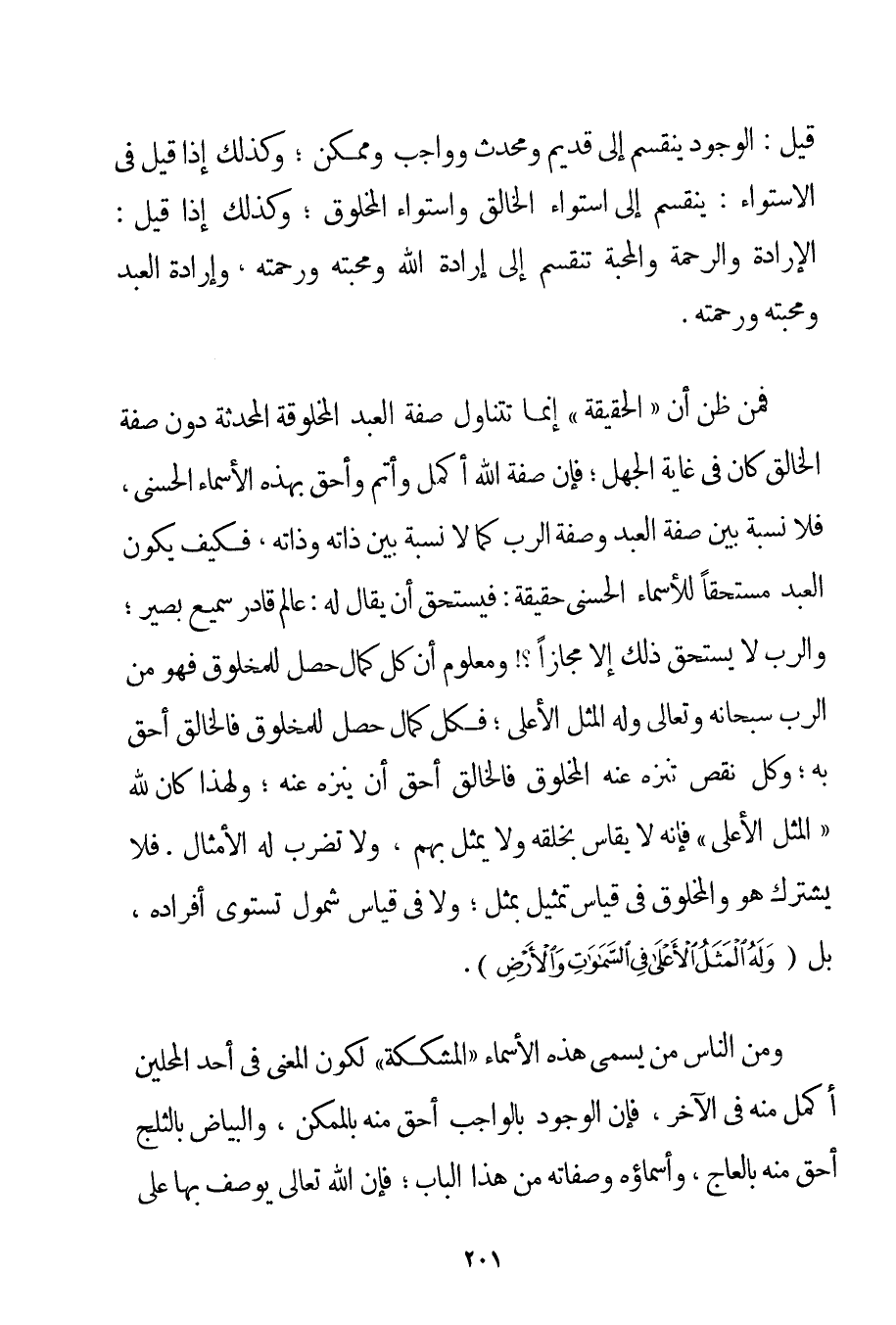 قِيلَ: الْوُجُودُ يَنْقَسِمُ إلَى قَدِيمٍ وَمُحْدَثٍ وَوَاجِبٍ وَمُمْكِنٍ؛ وَكَذَلِكَ إذَا قِيلَ فِي الِاسْتِوَاءِ: يَنْقَسِمُ إلَى اسْتِوَاءِ الْخَالِقِ وَاسْتِوَاءِ الْمَخْلُوقِ؛ وَكَذَلِكَ إذَا قِيلَ: الْإِرَادَةُ وَالرَّحْمَةُ وَالْهِبَةُ تَنْقَسِمُ إلَى إرَادَةِ اللَّهِ وَمَحَبَّتِهِ وَرَحْمَتِهِ وَإِرَادَةِ الْعَبْدِ وَمَحَبَّتِهِ وَرَحْمَتِهِ. فَمَنْ ظَنَّ أَنَّ " الْحَقِيقَةَ " إنَّمَا تَتَنَاوَلُ صِفَةَ الْعَبْدِ الْمَخْلُوقَةَ الْمُحْدَثَةَ دُونَ صِفَةِ الْخَالِقِ كَانَ فِي غَايَةِ الْجَهْلِ؛ فَإِنَّ صِفَةَ اللَّهِ أَكْمَلُ وَأَتَمُّ وَأَحَقُّ بِهَذِهِ الْأَسْمَاءِ الْحُسْنَى فَلَا نِسْبَةَ بَيْنَ صِفَةِ الْعَبْدِ وَصِفَةِ الرَّبِّ كَمَا لَا نِسْبَةَ بَيْنَ ذَاتِهِ وَذَاتِهِ فَكَيْفَ يَكُونُ الْعَبْدُ مُسْتَحِقًّا لِلْأَسْمَاءِ الْحُسْنَى حَقِيقَةً: فَيَسْتَحِقُّ أَنْ يُقَالَ لَهُ: عَالِمٌ قَادِرٌ سَمِيعٌ بَصِيرٌ؛ وَالرَّبُّ لَا يَسْتَحِقُّ ذَلِكَ إلَّا مَجَازًا وَمَعْلُومٌ أَنَّ كُلَّ كَمَالٍ حَصَلَ لِلْمَخْلُوقِ فَهُوَ مِنْ الرَّبِّ سُبْحَانَهُ وَتَعَالَى وَلَهُ الْمَثَلُ الْأَعْلَى؛ فَكُلُّ كَمَالٍ حَصَلَ لِلْمَخْلُوقِ فَالْخَالِقُ أَحَقُّ بِهِ؛ وَكُلُّ نَقْصٍ تَنَزَّهَ عَنْهُ الْمَخْلُوقُ فَالْخَالِقُ أَحَقُّ أَنْ يُنَزَّهَ عَنْهُ؛ وَلِهَذَا كَانَ اللَّهُ " الْمَثَلُ الْأَعْلَى " فَإِنَّهُ لَا يُقَاسُ بِخَلْقِهِ وَلَا يُمَثَّلُ بِهِمْ وَلَا تُضْرَبُ لَهُ الْأَمْثَالُ. فَلَا يَشْتَرِكُ هُوَ وَالْمَخْلُوقُ فِي قِيَاسِ تَمْثِيلٍ بِمَثَلِ؛ وَلَا فِي قِيَاسِ شُمُولٍ تَسْتَوِي أَفْرَادُهُ بَلْ {وَلَهُ الْمَثَلُ الْأَعْلَى فِي السَّمَاوَاتِ وَالْأَرْضِ} . وَمِنْ النَّاسِ مَنْ يُسَمِّي هَذِهِ الْأَسْمَاءَ " الْمُشَكِّكَةَ " لِكَوْنِ الْمَعْنَى فِي أَحَدِ الْمَحَلَّيْنِ أَكْمَلَ مِنْهُ فِي الْآخَرِ فَإِنَّ الْوُجُودَ بِالْوَاجِبِ أَحَقُّ مِنْهُ بِالْمُمْكِنِ وَالْبَيَاضَ بِالثَّلْجِ أَحَقُّ مِنْهُ بِالْعَاجِ وَأَسْمَاؤُهُ وَصِفَاتُهُ مِنْ هَذَا الْبَابِ؛ فَإِنَّ اللَّهَ تَعَالَى يُوصَفُ بِهَا عَلَى
