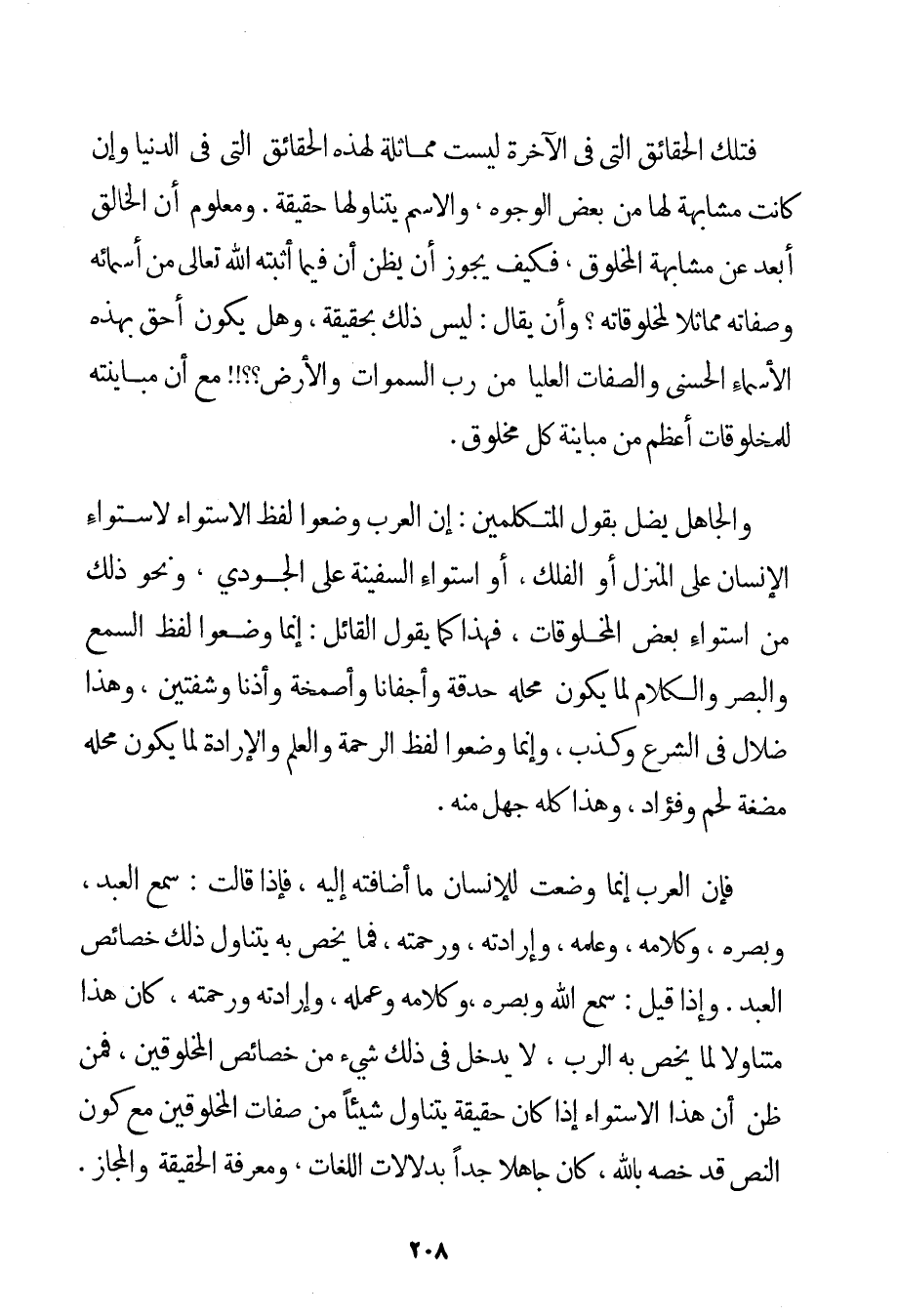 فَتِلْكَ الْحَقَائِقُ الَّتِي فِي الْآخِرَةِ لَيْسَتْ مُمَاثِلَةً لِهَذِهِ الْحَقَائِقِ الَّتِي فِي الدُّنْيَا وَإِنْ كَانَتْ مُشَابِهَةً لَهَا مِنْ بَعْضِ الْوُجُوهِ وَالِاسْمِ يَتَنَاوَلُهَا حَقِيقَةً. وَمَعْلُومٌ أَنَّ الْخَالِقَ أَبْعَدُ عَنْ مُشَابَهَةِ الْمَخْلُوقِ فَكَيْفَ يَجُوزُ أَنْ يَظُنَّ أَنَّ فِيمَا أَثْبَتَهُ اللَّهُ تَعَالَى مِنْ أَسْمَائِهِ وَصِفَاتِهِ مُمَاثِلًا لِمَخْلُوقَاتِهِ؟ وَأَنْ يُقَالَ: لَيْسَ ذَلِكَ بِحَقِيقَةِ وَهَلْ يَكُونُ أَحَقُّ بِهَذِهِ الْأَسْمَاءِ الْحُسْنَى وَالصِّفَاتِ الْعُلْيَا مِنْ رَبِّ السَّمَوَاتِ وَالْأَرْضِ مَعَ أَنَّ مُبَايَنَتَهُ لِلْمَخْلُوقَاتِ أَعْظَمُ مِنْ مُبَايَنَةِ كُلِّ مَخْلُوقٍ. وَالْجَاهِلُ يَضِلُّ بِقَوْلِ الْمُتَكَلِّمِينَ: إنَّ الْعَرَبَ وَضَعُوا لَفْظَ الِاسْتِوَاءِ لِاسْتِوَاءِ الْإِنْسَانِ عَلَى الْمَنْزِلِ أَوْ الْفُلْكِ أَوْ اسْتِوَاءِ السَّفِينَةِ عَلَى الْجُودِيِّ وَنَحْوِ ذَلِكَ مِنْ اسْتِوَاءِ بَعْضِ الْمَخْلُوقَاتِ فَهَذَا كَمَا يَقُولُ الْقَائِلُ: إنَّمَا وَضَعُوا لَفْظَ السَّمْعِ وَالْبَصَرِ وَالْكَلَامِ لِمَا يَكُونُ مَحَلُّهُ حَدَقَةً وَأَجْفَانًا وَأَصْمِخَةً وَأُذُنًا وَشَفَتَيْنِ وَهَذَا ضَلَالٌ فِي الشَّرْعِ وَكَذِبٌ وَإِنَّمَا وَضَعُوا لَفْظَ الرَّحْمَةِ وَالْعِلْمِ وَالْإِرَادَةِ لِمَا يَكُونُ مَحَلُّهُ مُضْغَةَ لَحْمٍ وَفُؤَادٍ وَهَذَا كُلُّهُ جَهْلٌ مِنْهُ. فَإِنَّ الْعَرَبَ إنَّمَا وَضَعَتْ لِلْإِنْسَانِ مَا أَضَافَتْهُ إلَيْهِ فَإِذَا قَالَتْ: سَمْعُ الْعَبْدِ وَبَصَرُهُ وَكَلَامُهُ وَعِلْمُهُ وَإِرَادَتُهُ وَرَحْمَتُهُ فَمَا يَخُصُّ بِهِ يَتَنَاوَلُ ذَلِكَ خَصَائِصَ الْعَبْدِ. وَإِذَا قِيلَ: سَمْعُ اللَّهِ وَبَصَرُهُ وَكَلَامُهُ وَعِلْمُهُ وَإِرَادَتُهُ وَرَحْمَتُهُ كَانَ هَذَا مُتَنَاوِلًا لِمَا يُخَصُّ بِهِ الرَّبُّ لَا يَدْخُلُ فِي ذَلِكَ شَيْءٌ مِنْ خَصَائِصِ الْمَخْلُوقِينَ فَمَنْ ظَنَّ أَنَّ هَذَا الِاسْتِوَاءَ إذَا كَانَ حَقِيقَةً يَتَنَاوَلُ شَيْئًا مِنْ صِفَاتِ الْمَخْلُوقِينَ مَعَ كَوْنِ النَّصِّ قَدْ خَصَّهُ بِاَللَّهِ كَانَ جَاهِلًا جِدًّا بِدَلَالَاتِ اللُّغَاتِ وَمَعْرِفَةِ الْحَقِيقَةِ وَالْمَجَازِ.