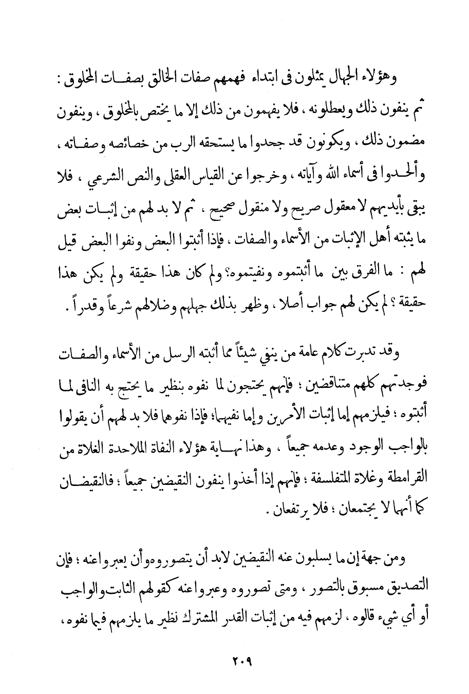 وَهَؤُلَاءِ الْجُهَّالُ يُمَثِّلُونَ فِي ابْتِدَاءِ فَهْمِهِمْ صِفَاتِ الْخَالِقِ بِصِفَاتِ الْمَخْلُوقِ: ثُمَّ يَنْفُونَ ذَلِكَ وَيُعَطِّلُونَهُ فَلَا يَفْهَمُونَ مِنْ ذَلِكَ إلَّا مَا يَخْتَصُّ بِالْمَخْلُوقِ وَيَنْفُونَ مَضْمُونَ ذَلِكَ وَيَكُونُونَ قَدْ جَحَدُوا مَا يَسْتَحِقُّهُ الرَّبُّ مِنْ خَصَائِصِهِ وَصِفَاتِهِ وَأَلْحَدُوا فِي أَسْمَاءِ اللَّهِ وَآيَاتِهِ وَخَرَجُوا عَنْ الْقِيَاسِ الْعَقْلِيِّ وَالنَّصِّ الشَّرْعِيِّ فَلَا يَبْقَى بِأَيْدِيهِمْ لَا مَعْقُولٌ صَرِيحٌ وَلَا مَنْقُولٌ صَحِيحٌ ثُمَّ لَا بُدَّ لَهُمْ مِنْ إثْبَاتِ بَعْضِ مَا يُثْبِتُهُ أَهْلُ الْإِثْبَاتِ مِنْ الْأَسْمَاءِ وَالصِّفَاتِ فَإِذَا أَثْبَتُوا الْبَعْضَ وَنَفَوْا الْبَعْضَ قِيلَ لَهُمْ: مَا الْفَرْقُ بَيْنَ مِمَّا أَثْبَتُّمُوهُ وَنَفَيْتُمُوهُ؟ وَلِمَ كَانَ هَذَا حَقِيقَةً وَلَمْ يَكُنْ هَذَا حَقِيقَةً؟ لَمْ يَكُنْ لَهُمْ جَوَابٌ أَصْلًا وَظَهَرَ بِذَلِكَ جَهْلُهُمْ وَضَلَالُهُمْ شَرْعًا وَقَدْرًا. وَقَدْ تَدَبَّرْت كَلَامَ عَامَّةِ مَنْ يَنْفِي شَيْئًا مِمَّا أَثْبَتَهُ الرُّسُلُ مِنْ الْأَسْمَاءِ وَالصِّفَاتِ فَوَجَدْتهمْ كُلَّهُمْ مُتَنَاقِضِينَ؛ فَإِنَّهُمْ يَحْتَجُّونَ لِمَا نَفَوْهُ بِنَظِيرِ مَا يَحْتَجُّ بِهِ النَّافِي لِمَا أَثْبَتُوهُ؛ فَيَلْزَمُهُمْ إمَّا إثْبَاتُ الْأَمْرَيْنِ وَإِمَّا نَفْيُهُمَا؛ فَإِذَا نَفَوْهُمَا فَلَا بُدَّ لَهُمْ أَنْ يَقُولُوا بِالْوَاجِبِ الْوُجُودِ وَعَدَمِهِ جَمِيعًا وَهَذَا نِهَايَةُ هَؤُلَاءِ الْنُّفَاةِ الْمَلَاحِدَةِ الْغُلَاةِ مِنْ الْقَرَامِطَةِ وَغُلَاةِ الْمُتَفَلْسِفَةِ؛ فَإِنَّهُمْ إذَا أَخَذُوا يَنْفُونَ النَّقِيضَيْنِ جَمِيعًا؛ فَالنَّقِيضَانِ كَمَا أَنَّهُمَا لَا يَجْتَمِعَانِ؛ فَلَا يَرْتَفِعَانِ. وَمِنْ جِهَةِ إنَّ مَا يَسْلُبُونَ عَنْهُ النَّقِيضَيْنِ لَا بُدَّ أَنْ يَتَصَوَّرُوهُ وَأَنْ يُعَبِّرُوا عَنْهُ؛ فَإِنَّ التَّصْدِيقَ مَسْبُوقٌ بِالتَّصَوُّرِ وَمَتَى تَصَوَّرُوهُ وَعَبَّرُوا عَنْهُ كَقَوْلِهِمْ الثَّابِتِ وَالْوَاجِبِ أَوْ أَيُّ شَيْءٍ قَالُوهُ لَزِمَهُمْ فِيهِ مِنْ إثْبَاتِ الْقَدْرِ الْمُشْتَرَكِ نَظِيرُ مَا يَلْزَمُهُمْ فِيمَا نَفَوْهُ
