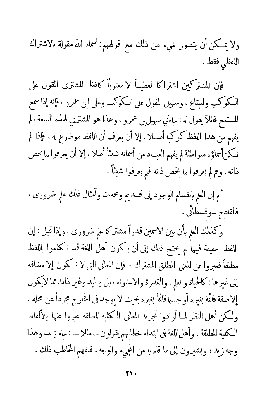 ثُمَّ إنَّ الْعِلْمَ بِانْقِسَامِ الْوُجُودِ إلَى قَدِيمٍ وَمُحْدَثٍ وَأَمْثَالِ ذَلِكَ عِلْمٌ ضَرُورِيٌّ فَالْقَادِحُ سوفسطائي. وَكَذَلِكَ الْعِلْمُ بِأَنَّ بَيْنَ الِاسْمَيْنِ قَدْرًا مُشْتَرَكًا عِلْمٌ ضَرُورِيٌّ. وَإِذَا قِيلَ: إنَّ اللَّفْظَ حَقِيقَةٌ فِيهِمَا لَمْ يَحْتَجْ ذَلِكَ إلَى أَنْ يَكُونَ أَهْلُ اللُّغَةِ قَدْ تَكَلَّمُوا بِاللَّفْظِ مُطْلَقًا فَعَبَّرُوا عَنْ الْمَعْنَى الْمُطْلَقِ الْمُشْتَرَكِ؛ فَإِنَّ الْمَعَانِيَ الَّتِي لَا تَكُونُ إلَّا مُضَافَةً إلَى غَيْرِهَا: كَالْحَيَاةِ وَالْعِلْمِ وَالْقُدْرَةِ وَالِاسْتِوَاءِ؛ بَلْ وَالْيَدُ وَغَيْرُ ذَلِكَ مِمَّا لَا يَكُونُ إلَّا صِفَةً قَائِمَةً بِغَيْرِهِ أَوْ جِسْمًا قَائِمًا بِغَيْرِهِ بِحَيْثُ لَا يُوجَدُ فِي الْخَارِجِ مُجَرَّدًا عَنْ مَحَلِّهِ. وَلَكِنَّ أَهْلَ النَّظَرِ لَمَّا أَرَادُوا تَجْرِيدَ الْمَعَانِي الْكُلِّيَّةِ الْمُطْلَقَةِ عَبَّرُوا عَنْهَا بِالْأَلْفَاظِ الْكُلِّيَّةِ الْمُطْلَقَةِ وَأَهْلُ اللُّغَةِ فِي ابْتِدَاءِ خِطَابِهِمْ يَقُولُونَ - مَثَلًا -: جَاءَ زَيْدٌ وَهَذَا وَجْهُ زَيْدٍ؛ وَيُشِيرُونَ إلَى مَا قَامَ بِهِ مِنْ الْمَجِيءِ وَالْوَجْهِ فَيَفْهَمُ الْمُخَاطَبُ ذَلِكَ.