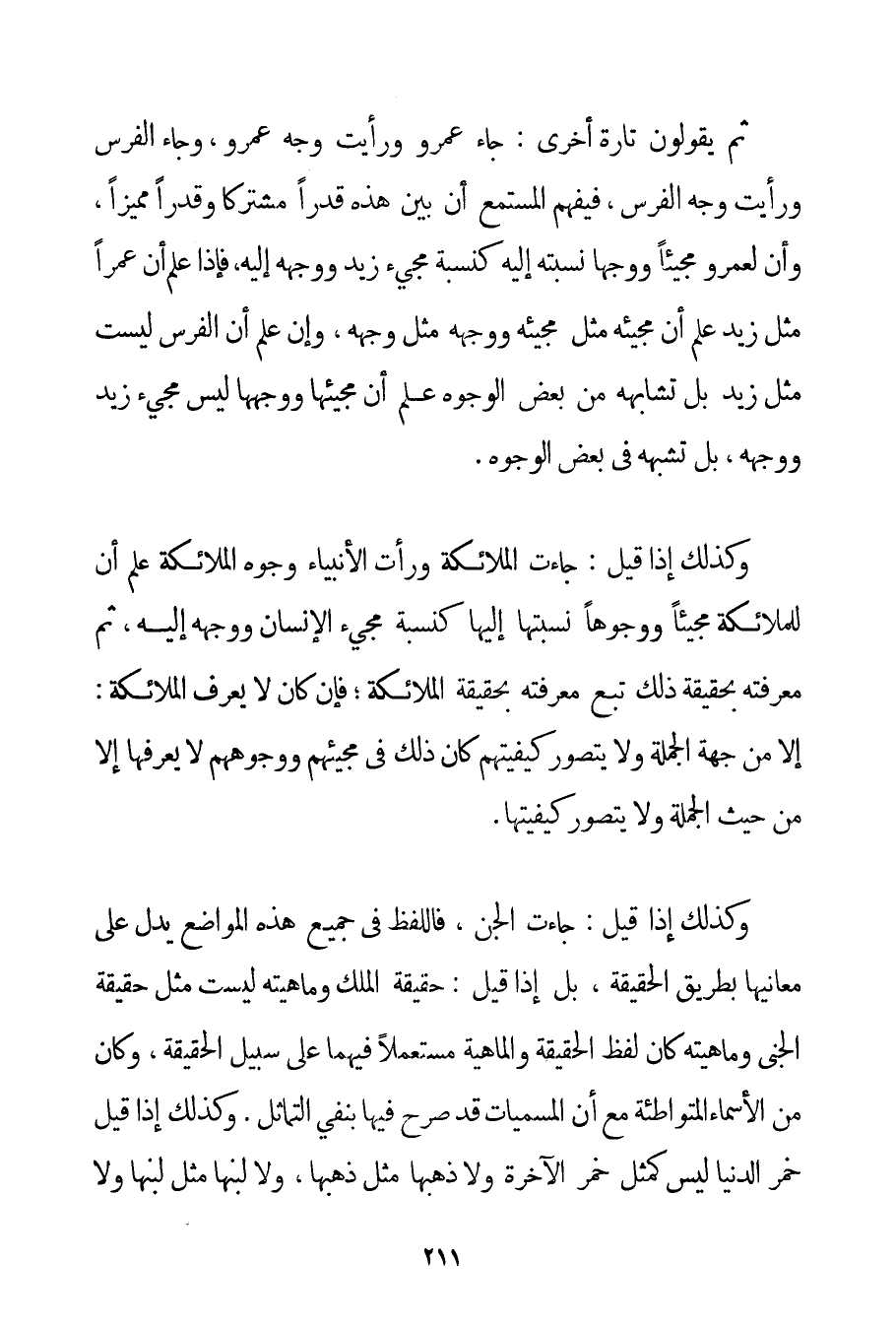 ثُمَّ يَقُولُونَ تَارَةً أُخْرَى: جَاءَ عَمْرٌو وَرَأَيْت وَجْهَ عَمْرٍو وَجَاءَ الْفَرَسُ وَرَأَيْت وَجْهَ الْفَرَسِ فَيَفْهَمُ الْمُسْتَمِعُ أَنَّ بَيْنَ هَذِهِ قَدْرًا مُشْتَرَكًا وَقَدْرًا مُمَيَّزًا وَأَنَّ لِعَمْرٍو مَجِيئًا وَوَجْهًا نِسْبَتُهُ إلَيْهِ كَنِسْبَةِ مَجِيءِ زَيْدٍ وَوَجْهِهِ إلَيْهِ فَإِذَا عُلِمَ أَنَّ عَمْرًا مِثْلُ زَيْدٍ عُلِمَ أَنَّ مَجِيئَهُ مِثْلُ مَجِيئِهِ وَوَجْهَهُ مِثْلُ وَجْهِهِ وَإِنْ عُلِمَ أَنَّ الْفَرَسَ لَيْسَتْ مِثْلُ زَيْدٍ بَلْ تُشَابِهُهُ مِنْ بَعْضِ الْوُجُوهِ عُلِمَ أَنَّ مَجِيئَهَا وَوَجْهَهَا لَيْسَ مَجِيءَ زَيْدٍ وَوَجْهَهُ بَلْ تُشْبِهُهُ فِي بَعْضِ الْوُجُوهِ. وَكَذَلِكَ إذَا قِيلَ: جَاءَتْ الْمَلَائِكَةُ وَرَأَتْ الْأَنْبِيَاءُ وُجُوهَ الْمَلَائِكَةِ عُلِمَ أَنَّ لِلْمَلَائِكَةِ مَجِيئًا وَوُجُوهًا نِسْبَتُهَا إلَيْهَا كَنِسْبَةِ مَجِيءِ الْإِنْسَانِ وَوَجْهِهِ إلَيْهِ ثُمَّ مَعْرِفَتُهُ بِحَقِيقَةِ ذَلِكَ تَبَعُ مَعْرِفَتِهِ بِحَقِيقَةِ الْمَلَائِكَةِ؛ فَإِنْ كَانَ لَا يَعْرِفُ الْمَلَائِكَةَ: إلَّا مِنْ جِهَةِ الْجُمْلَةِ وَلَا يُتَصَوَّرُ كَيْفِيَّتَهُمْ كَانَ ذَلِكَ فِي مَجِيئِهِمْ وَوُجُوهِهِمْ لَا يَعْرِفُهَا إلَّا مِنْ حَيْثُ الْجُمْلَةُ وَلَا يُتَصَوَّرُ كَيْفِيَّتُهَا. وَكَذَلِكَ إذَا قِيلَ: جَاءَتْ الْجِنُّ فَاللَّفْظُ فِي جَمِيعِ هَذِهِ الْمَوَاضِعِ يَدُلُّ عَلَى مَعَانِيهَا بِطَرِيقِ الْحَقِيقَةِ بَلْ إذَا قِيلَ: حَقِيقَةُ الْمَلَكِ وَمَاهِيَّتُهُ لَيْسَتْ مِثْلَ حَقِيقَةِ الْجِنِّيِّ وَمَاهِيَّتِهِ كَانَ لَفْظُ الْحَقِيقَةِ وَالْمَاهِيَّةِ مُسْتَعْمَلًا فِيهِمَا عَلَى سَبِيلِ الْحَقِيقَةِ وَكَانَ مِنْ الْأَسْمَاءِ الْمُتَوَاطِئَةِ مَعَ أَنَّ الْمُسَمَّيَاتِ قَدْ صَرَّحَ فِيهَا بِنَفْيِ التَّمَاثُلِ. وَكَذَلِكَ إذَا قِيلَ خَمْرُ الدُّنْيَا لَيْسَ كَمِثْلِ خَمْرِ الْآخِرَةِ وَلَا ذَهَبُهَا مِثْلُ ذَهَبِهَا وَلَا لَبَنُهَا مِثْلُ لَبَنِهَا وَلَا