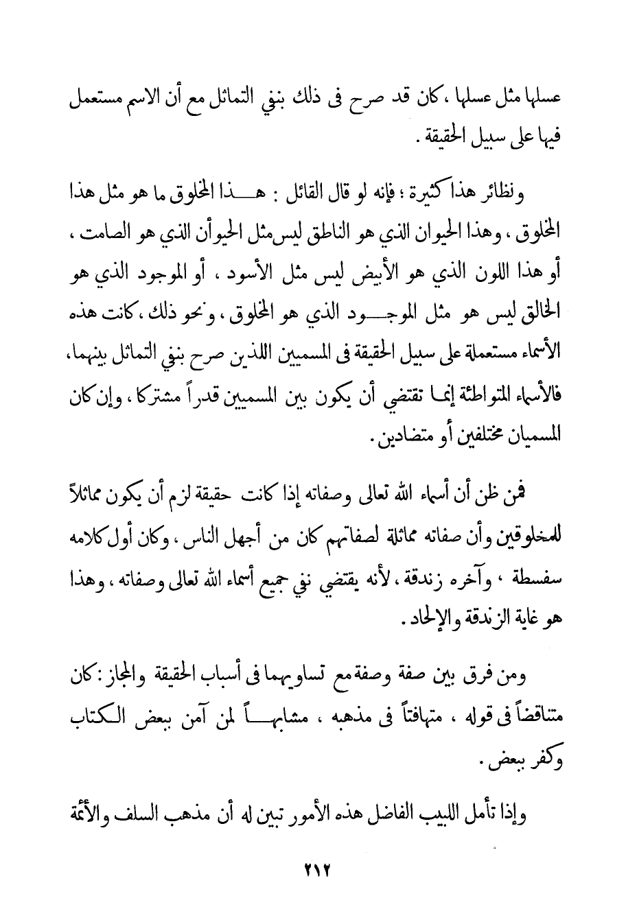 فَمَنْ ظَنَّ أَنَّ أَسْمَاءَ اللَّهِ تَعَالَى وَصِفَاتِهِ إذَا كَانَتْ حَقِيقَةً لَزِمَ أَنْ يَكُونَ مُمَاثِلًا لِلْمَخْلُوقِينَ وَأَنَّ صِفَاتِهِ مُمَاثِلَةٌ لِصِفَاتِهِمْ كَانَ مِنْ أَجْهَلِ النَّاسِ وَكَانَ أَوَّلُ كَلَامِهِ سَفْسَطَةً وَآخِرُهُ زَنْدَقَةً لِأَنَّهُ يَقْتَضِي نَفْيَ جَمِيعِ أَسْمَاءِ اللَّهِ تَعَالَى وَصِفَاتِهِ وَهَذَا هُوَ غَايَةُ الزَّنْدَقَةِ وَالْإِلْحَادِ. وَمَنْ فَرَّقَ بَيْنَ صِفَةٍ وَصِفَةٍ مَعَ تَسَاوِيهِمَا فِي أَسْبَابِ الْحَقِيقَةِ وَالْمَجَازِ: كَانَ مُتَنَاقِضًا فِي قَوْلِهِ مُتَهَافِتًا فِي مَذْهَبِهِ مُشَابِهًا لِمَنْ آمَنَ بِبَعْضِ الْكِتَابِ وَكَفَرَ بِبَعْضِ. وَإِذَا تَأَمَّلَ اللَّبِيبُ الْفَاضِلُ هَذِهِ الْأُمُورَ تَبَيَّنَ لَهُ أَنَّ مَذْهَبَ السَّلَفِ وَالْأَئِمَّةِ