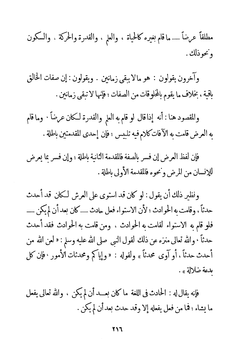مُطْلَقًا عَرَضًا - مَا قَامَ بِغَيْرِهِ كَالْحَيَاةِ وَالْعِلْمِ وَالْقُدْرَةِ وَالْحَرَكَةِ. وَالسُّكُونِ وَنَحْوِ ذَلِكَ. وَآخَرُونَ يَقُولُونَ: هُوَ مَا لَا يَبْقَى زَمَانَيْنِ. وَيَقُولُونَ: إنَّ صِفَاتِ الْخَالِقِ بَاقِيَةٌ بِخِلَافِ مَا يَقُومُ بِالْمَخْلُوقَاتِ مِنْ الصِّفَاتِ؛ فَإِنَّهَا لَا تَبْقَى زَمَانَيْنِ. وَالْمَقْصُودُ هُنَا: أَنَّهُ إذَا قَالَ لَوْ قَامَ بِهِ الْعِلْمُ وَالْقُدْرَةُ لَكَانَ عَرَضًا وَمَا قَامَ بِهِ الْعَرَضُ قَامَتْ بِهِ الْآفَاتُ كَلَامٌ فِيهِ تَلْبِيسٌ؛ فَإِنَّ إحْدَى الْمُقَدِّمَتَيْنِ بَاطِلَةٌ. فَإِنَّ لَفْظَ الْعَرَضِ إنْ فُسِّرَ بِالصِّفَةِ فَالْمُقَدِّمَةُ الثَّانِيَةُ بَاطِلَةٌ؛ وَإِنْ فُسِّرَ بِمَا يَعْرِضُ لِلْإِنْسَانِ مِنْ الْمَرَضِ وَنَحْوِهِ فَالْمُقَدِّمَةُ الْأُولَى بَاطِلَةٌ. وَنَظِيرُ ذَلِكَ أَنْ يَقُولَ: لَوْ كَانَ قَدْ اسْتَوَى عَلَى الْعَرْشِ لَكَانَ قَدْ أَحْدَثَ حَدَثًا وَقَامَتْ بِهِ الْحَوَادِثُ؛ لِأَنَّ الِاسْتِوَاءَ فِعْلٌ حَادِثٌ - كَانَ بَعْدَ أَنْ لَمْ يَكُنْ - فَلَوْ قَامَ بِهِ الِاسْتِوَاءُ لَقَامَتْ بِهِ الْحَوَادِثُ وَمَنْ قَامَتْ بِهِ الْحَوَادِثُ فَقَدْ أَحْدَثَ حَدَثًا وَاَللَّهُ تَعَالَى مُنَزَّهٌ عَنْ ذَلِكَ لِقَوْلِ النَّبِيِّ صَلَّى اللَّهُ عَلَيْهِ وَسَلَّمَ {لَعَنَ اللَّهُ مَنْ أَحْدَثَ حَدَثًا أَوْ آوَى مُحْدِثًا} وَلِقَوْلِهِ: {وَإِيَّاكُمْ وَمُحْدَثَاتِ الْأُمُورِ فَإِنَّ كُلَّ بِدْعَةٍ ضَلَالَةٌ} . فَإِنَّهُ يُقَالُ لَهُ: الْحَادِثُ فِي اللُّغَةِ مَا كَانَ بَعْدَ أَنْ لَمْ يَكُنْ وَاَللَّهُ تَعَالَى يَفْعَلُ مَا يَشَاءُ؛ فَمَا مِنْ فِعْلٍ يَفْعَلُهُ إلَّا وَقَدْ حَدَثَ بَعْدَ أَنْ لَمْ يَكُنْ.