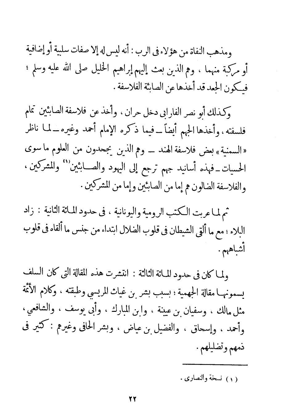 وَمَذْهَبُ الْنُّفَاةِ مِنْ هَؤُلَاءِ فِي الرَّبِّ: أَنَّهُ لَيْسَ لَهُ إلَّا صِفَاتٌ سَلْبِيَّةٌ أَوْ إضَافِيَّةٌ أَوْ مُرَكَّبَةٌ مِنْهُمَا وَهُمْ الَّذِينَ بَعَثَ إلَيْهِمْ إبْرَاهِيمَ الْخَلِيلَ صَلَّى اللَّهُ عَلَيْهِ وَسَلَّمَ فَيَكُونُ الْجَعْدُ قَدْ أَخَذَهَا عَنْ الصَّابِئَةِ الْفَلَاسِفَةِ. وَكَذَلِكَ أَبُو نَصْرٍ الْفَارَابِيُّ دَخَلَ حَرَّانَ وَأَخَذَ عَنْ فَلَاسِفَةِ الصَّابِئِينَ تَمَامَ فَلْسَفَتِهِ وَأَخَذَهَا الْجَهْمُ أَيْضًا - فِيمَا ذَكَرَهُ الْإِمَامُ أَحْمَد وَغَيْرُهُ - لَمَّا نَاظَرَ " السمنية " بَعْضَ فَلَاسِفَةِ الْهِنْدِ - وَهُمْ الَّذِينَ يَجْحَدُونَ مِنْ الْعُلُومِ مَا سِوَى الْحِسِّيَّاتِ - فَهَذِهِ أَسَانِيدُ جَهْمٍ تَرْجِعُ إلَى الْيَهُودِ وَالصَّابِئِينَ وَالْمُشْرِكِينَ وَالْفَلَاسِفَةُ الضَّالُّونَ هُمْ إمَّا مِنْ الصَّابِئِينَ وَإِمَّا مِنْ الْمُشْرِكِينَ. ثُمَّ لَمَّا عُرِّبَتْ الْكُتُبُ الرُّومِيَّةُ وَالْيُونَانِيَّةُ فِي حُدُودِ الْمِائَةِ الثَّانِيَةِ: زَادَ الْبَلَاءُ؛ مَعَ مَا أَلْقَى الشَّيْطَانُ فِي قُلُوبِ الضُّلَّالِ ابْتِدَاءً مِنْ جِنْسِ مَا أَلْقَاهُ فِي قُلُوبِ أَشْبَاهِهِمْ. وَلَمَّا كَانَ فِي حُدُودِ الْمِائَةِ الثَّالِثَةِ: انْتَشَرَتْ هَذِهِ الْمَقَالَةُ الَّتِي كَانَ السَّلَفُ يُسَمُّونَهَا مَقَالَةَ الْجَهْمِيَّة؛ بِسَبَبِ بِشْرِ بْنِ غِيَاثٍ المريسي وَطَبَقَتِهِ وَكَلَامِ الْأَئِمَّةِ مِثْلَ مَالِكٍ وَسُفْيَانَ بْنِ عُيَيْنَة وَابْنِ الْمُبَارَكِ وَأَبِي يُوسُفَ وَالشَّافِعِيِّ وَأَحْمَد وَإِسْحَاقَ والْفُضَيْل بْنِ عِيَاضٍ وَبِشْرٍ الْحَافِي وَغَيْرِهِمْ: كَثِيرٌ فِي ذَمِّهِمْ وَتَضْلِيلِهِمْ.