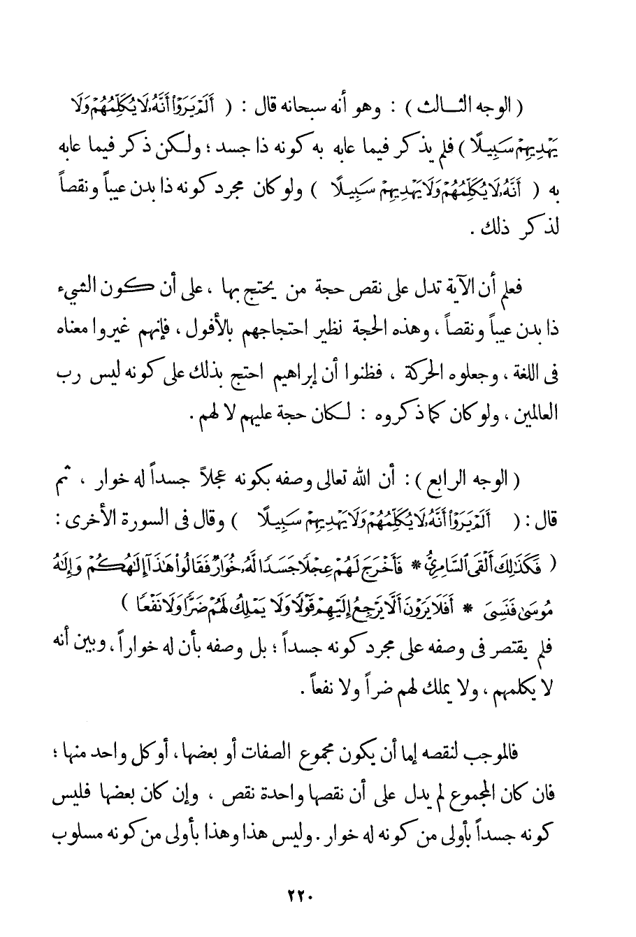 الْوَجْهُ الثَّالِثُ: وَهُوَ أَنَّهُ سُبْحَانَهُ قَالَ: {أَلَمْ يَرَوْا أَنَّهُ لَا يُكَلِّمُهُمْ وَلَا يَهْدِيهِمْ سَبِيلًا} فَلَمْ يَذْكُرْ فِيمَا عَابَهُ بِهِ كَوْنَهُ ذَا جَسَدٍ؛ وَلَكِنْ ذَكَرَ فِيمَا عَابَهُ بِهِ {أَنَّهُ لَا يُكَلِّمُهُمْ وَلَا يَهْدِيهِمْ سَبِيلًا} وَلَوْ كَانَ مُجَرَّدَ كَوْنِهِ ذَا بَدَنٍ عَيْبًا وَنَقْصًا لَذَكَرَ ذَلِكَ. فَعُلِمَ أَنَّ الْآيَةَ تَدُلُّ عَلَى نَقْصِ حُجَّةِ مَنْ يَحْتَجُّ بِهَا عَلَى أَنَّ كَوْنَ الشَّيْءِ ذَا بَدَنٍ عَيْبًا وَنَقْصًا وَهَذِهِ الْحُجَّةُ نَظِيرُ احْتِجَاجِهِمْ بِالْأُفُولِ فَإِنَّهُمْ غَيَّرُوا مَعْنَاهُ فِي اللُّغَةِ وَجَعَلُوهُ الْحَرَكَةَ فَظَنُّوا أَنَّ إبْرَاهِيمَ احْتَجَّ بِذَلِكَ عَلَى كَوْنِهِ لَيْسَ رَبَّ الْعَالَمِينَ وَلَوْ كَانَ كَمَا ذَكَرُوهُ: لَكَانَ حُجَّةً عَلَيْهِمْ لَا لَهُمْ. (الْوَجْهُ الرَّابِعُ) : أَنَّ اللَّهَ تَعَالَى وَصَفَهُ بِكَوْنِهِ عِجْلًا جَسَدًا لَهُ خُوَارٌ ثُمَّ قَالَ: {أَلَمْ يَرَوْا أَنَّهُ لَا يُكَلِّمُهُمْ وَلَا يَهْدِيهِمْ سَبِيلًا} وَقَالَ فِي السُّورَةِ الْأُخْرَى: {فَكَذَلِكَ أَلْقَى السَّامِرِيُّ} {فَأَخْرَجَ لَهُمْ عِجْلًا جَسَدًا لَهُ خُوَارٌ فَقَالُوا هَذَا إلَهُكُمْ وَإِلَهُ مُوسَى فَنَسِيَ} {أَفَلَا يَرَوْنَ أَلَّا يَرْجِعُ إلَيْهِمْ قَوْلًا وَلَا يَمْلِكُ لَهُمْ ضَرًّا وَلَا نَفْعًا} فَلَمْ يَقْتَصِرْ فِي وَصْفِهِ عَلَى مُجَرَّدِ كَوْنِهِ جَسَدًا. بَلْ وَصَفَهُ بِأَنَّ لَهُ خُوَارًا وَبَيَّنَ أَنَّهُ لَا يُكَلِّمُهُمْ وَلَا يَمْلِكُ لَهُمْ ضَرًّا وَلَا نَفْعًا. فَالْمُوجِبُ لِنَقْصِهِ إمَّا أَنْ يَكُونَ مَجْمُوعَ الصِّفَاتِ أَوْ بَعْضَهَا أَوْ كُلَّ وَاحِدٍ مِنْهَا؛ فَإِنْ كَانَ الْمَجْمُوعَ لَمْ يَدُلَّ عَلَى أَنَّ نَقْصَهَا وَاحِدَةً نَقْصٌ وَإِنْ كَانَ بَعْضَهَا فَلَيْسَ كَوْنُهُ جَسَدًا بِأَوْلَى مِنْ كَوْنِهِ لَهُ خُوَارٌ. وَلَيْسَ هَذَا وَهَذَا بِأَوْلَى مِنْ كَوْنِهِ مَسْلُوبَ