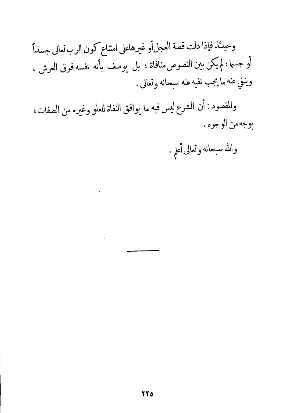وَحِينَئِذٍ فَإِذَا دَلَّتْ قِصَّةُ الْعِجْلِ أَوْ غَيْرِهَا عَلَى امْتِنَاعِ كَوْنِ الرَّبِّ تَعَالَى جَسَدًا أَوْ جِسْمًا؛ لَمْ يَكُنْ بَيْنَ النُّصُوصِ مُنَافَاةٌ؛ بَلْ يُوصَفُ بِأَنَّهُ نَفْسُهُ فَوْقَ الْعَرْشِ وَيَنْفِي عَنْهُ مَا يَجِبُ نَفْيُهُ عَنْهُ سُبْحَانَهُ وَتَعَالَى. وَالْمَقْصُودُ: أَنَّ الشَّرْعَ لَيْسَ فِيهِ مَا يُوَافِقُ الْنُّفَاةِ لِلْعُلُوِّ وَغَيْرِهِ مِنْ الصِّفَاتِ؛ بِوَجْهِ مِنْ الْوُجُوهِ. وَاَللَّهُ سُبْحَانَهُ وَتَعَالَى أَعْلَمُ.