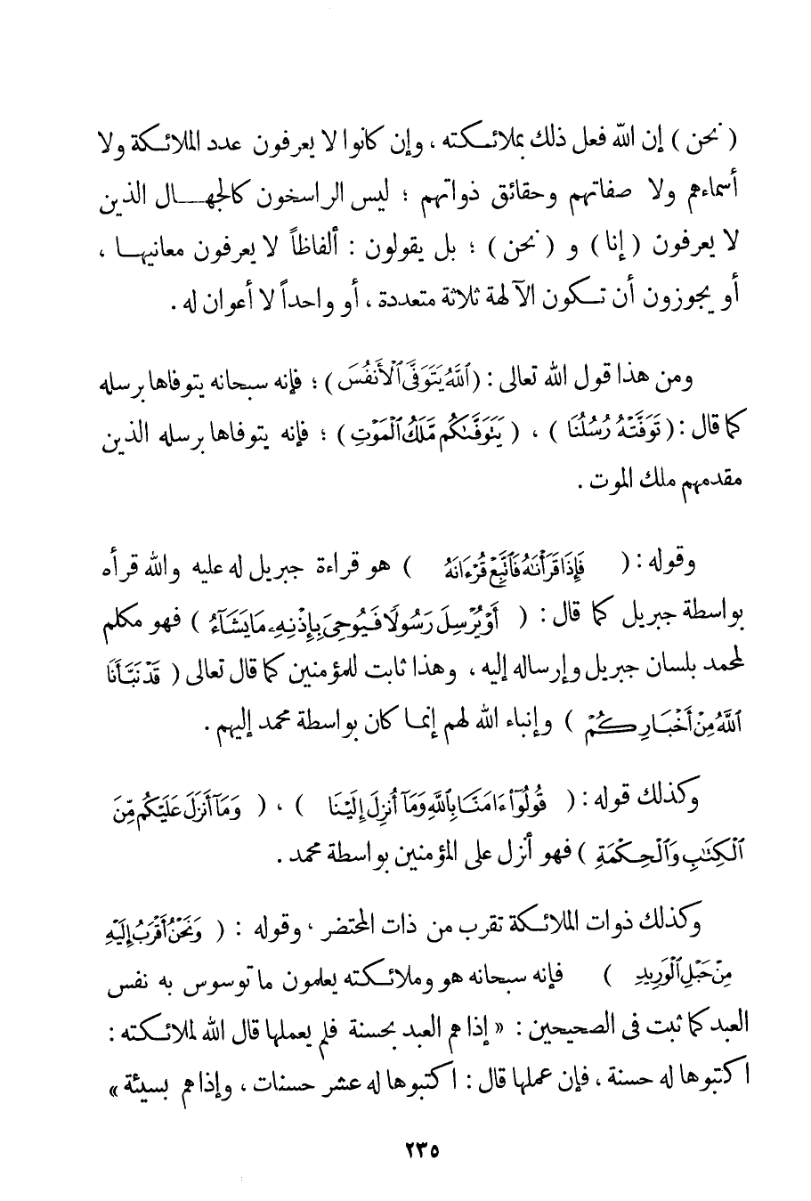 (نَحْنُ) إنَّ اللَّهَ فَعَلَ ذَلِكَ بِمَلَائِكَتِهِ وَإِنْ كَانُوا لَا يَعْرِفُونَ عَدَدَ الْمَلَائِكَةِ وَلَا أَسْمَاءَهُمْ وَلَا صِفَاتِهِمْ وَحَقَائِقَ ذَوَاتِهِمْ؛ لَيْسَ الرَّاسِخُونَ كَالْجُهَّالِ الَّذِينَ لَا يَعْرِفُونَ (إنَّا) و (نَحْنُ) ؛ بَلْ يَقُولُونَ: أَلْفَاظًا لَا يَعْرِفُونَ مَعَانِيَهَا أَوْ يُجَوِّزُونَ أَنْ تَكُونَ الْآلِهَةُ ثَلَاثَةً مُتَعَدِّدَةً أَوْ وَاحِدًا لَا أَعْوَانَ لَهُ. وَمِنْ هَذَا قَوْلُ اللَّهِ تَعَالَى: {اللَّهُ يَتَوَفَّى الْأَنْفُسَ} فَإِنَّهُ سُبْحَانَهُ يَتَوَفَّاهَا بِرُسُلِهِ كَمَا قَالَ: {تَوَفَّتْهُ رُسُلُنَا} {يَتَوَفَّاكُمْ مَلَكُ الْمَوْتِ} فَإِنَّهُ يَتَوَفَّاهَا بِرُسُلِهِ الَّذِينَ مُقَدَّمُهُمْ مَلَكُ الْمَوْتِ. وَقَوْلُهُ: {فَإِذَا قَرَأْنَاهُ فَاتَّبِعْ قُرْآنَهُ} هُوَ قِرَاءَةُ جِبْرِيلَ لَهُ عَلَيْهِ وَاَللَّهُ قَرَأَهُ بِوَاسِطَةِ جِبْرِيلَ كَمَا قَالَ: {أَوْ يُرْسِلَ رَسُولًا فَيُوحِيَ بِإِذْنِهِ مَا يَشَاءُ} فَهُوَ مُكَلِّمٌ لِمُحَمَّدِ بِلِسَانِ جِبْرِيلَ وَإِرْسَالِهِ إلَيْهِ وَهَذَا ثَابِتٌ لِلْمُؤْمِنِينَ كَمَا قَالَ تَعَالَى {قَدْ نَبَّأَنَا اللَّهُ مِنْ أَخْبَارِكُمْ} وَإِنْبَاءُ اللَّهِ لَهُمْ إنَّمَا كَانَ بِوَاسِطَةِ مُحَمَّدٍ إلَيْهِمْ. وَكَذَلِكَ قَوْلُهُ: {قُولُوا آمَنَّا بِاللَّهِ وَمَا أُنْزِلَ إلَيْنَا} {وَمَا أَنْزَلَ عَلَيْكُمْ مِنَ الْكِتَابِ وَالْحِكْمَةِ} فَهُوَ أُنْزِلَ عَلَى الْمُؤْمِنِينَ بِوَاسِطَةِ مُحَمَّدٍ. وَكَذَلِكَ ذَوَاتُ الْمَلَائِكَةِ تَقْرُبُ مِنْ ذَاتِ الْمُحْتَضِرِ؛ وَقَوْلُهُ: {وَنَحْنُ أَقْرَبُ إلَيْهِ مِنْ حَبْلِ الْوَرِيدِ} فَإِنَّهُ سُبْحَانَهُ هُوَ وَمَلَائِكَتُهُ يَعْلَمُونَ مَا تُوَسْوِسُ بِهِ نَفْسُ الْعَبْدِ كَمَا ثَبَتَ فِي الصَّحِيحَيْنِ: {إذَا هَمَّ الْعَبْدُ بِحَسَنَةٍ فَلَمْ يَعْمَلْهَا قَالَ اللَّهُ لِمَلَائِكَتِهِ: اُكْتُبُوهَا لَهُ حَسَنَةً فَإِنْ عَمِلَهَا قَالَ: اُكْتُبُوهَا لَهُ عَشْرَ حَسَنَاتٍ وَإِذَا هَمَّ بِسَيِّئَةٍ}