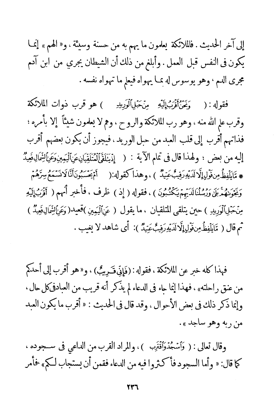 إلَى آخِرِ الْحَدِيثِ. فَالْمَلَائِكَةُ يَعْلَمُونَ مَا يَهُمُّ بِهِ مِنْ حَسَنَةٍ وَسَيِّئَةٍ وَ " الْهَمُّ " إنَّمَا يَكُونُ فِي النَّفْسِ قَبْلَ الْعَمَلِ. وَأَبْلَغُ مِنْ ذَلِكَ أَنَّ الشَّيْطَانَ يَجْرِي مِنْ ابْنِ آدَمَ مَجْرَى الدَّمِ، وَهُوَ يُوَسْوِسُ لَهُ بِمَا يَهْوَاهُ فَيَعْلَمُ مَا تَهْوَاهُ نَفْسُهُ. فَقَوْلُهُ: {وَنَحْنُ أَقْرَبُ إلَيْهِ مِنْ حَبْلِ الْوَرِيدِ} هُوَ قُرْبُ ذَوَاتِ الْمَلَائِكَةِ وَقُرْبُ عِلْمِ اللَّهِ مِنْهُ وَهُوَ رَبُّ الْمَلَائِكَةِ وَالرُّوحِ وَهُمْ لَا يَعْلَمُونَ شَيْئًا إلَّا بِأَمْرِهِ؛ فَذَاتُهُمْ أَقْرَبُ إلَى قَلْبِ الْعَبْدِ مِنْ حَبْلِ الْوَرِيدِ فَيَجُوزُ أَنْ يَكُونَ بَعْضُهُمْ أَقْرَبَ إلَيْهِ مِنْ بَعْضٍ؛ وَلِهَذَا قَالَ فِي تَمَامِ الْآيَةِ: {إذْ يَتَلَقَّى الْمُتَلَقِّيَانِ عَنِ الْيَمِينِ وَعَنِ الشِّمَالِ قَعِيدٌ} {مَا يَلْفِظُ مِنْ قَوْلٍ إلَّا لَدَيْهِ رَقِيبٌ عَتِيدٌ} وَهَذَا كَقَوْلِهِ: {أَمْ يَحْسَبُونَ أَنَّا لَا نَسْمَعُ سِرَّهُمْ وَنَجْوَاهُمْ بَلَى وَرُسُلُنَا لَدَيْهِمْ يَكْتُبُونَ} فَقَوْلُهُ إذْ ظَرْفٌ فَأَخْبَرَ أَنَّهُمْ {أَقْرَبُ إلَيْهِ مِنْ حَبْلِ الْوَرِيدِ} حِينَ يَتَلَقَّى الْمُتَلَقِّيَانِ مَا يَقُولُ {عَنِ الْيَمِينِ} قَعِيدٌ {وَعَنِ الشِّمَالِ قَعِيدٌ} ثُمَّ قَالَ {مَا يَلْفِظُ مِنْ قَوْلٍ إلَّا لَدَيْهِ رَقِيبٌ عَتِيدٌ} أَيْ شَاهِدٌ لَا يَغِيبُ. فَهَذَا كُلُّهُ خَبَرٌ عَنْ الْمَلَائِكَةِ فَقَوْلُهُ: {فَإِنِّي قَرِيبٌ} و {هُوَ أَقْرَبُ إلَى أَحَدِكُمْ مِنْ عُنُقِ رَاحِلَتِهِ} فَهَذَا إنَّمَا جَاءَ فِي الدُّعَاءِ لَمْ يَذْكُرْ أَنَّهُ قَرِيبٌ مِنْ الْعِبَادِ فِي كُلِّ حَالٍ وَإِنَّمَا ذَكَرَ ذَلِكَ فِي بَعْضِ الْأَحْوَالِ وَقَدْ قَالَ فِي الْحَدِيثِ: {أَقْرَبُ مَا يَكُونُ الْعَبْدُ مِنْ رَبِّهِ وَهُوَ سَاجِدٌ} . وَقَالَ تَعَالَى: {وَاسْجُدْ وَاقْتَرِبْ} وَالْمُرَادُ الْقُرْبُ مِنْ الدَّاعِي فِي سُجُودِهِ كَمَا قَالَ: {وَأَمَّا السُّجُودُ فَأَكْثِرُوا فِيهِ مِنْ الدُّعَاءِ فَقَمِنَ أَنْ يُسْتَجَابَ لَكُمْ} فَأَمَرَ