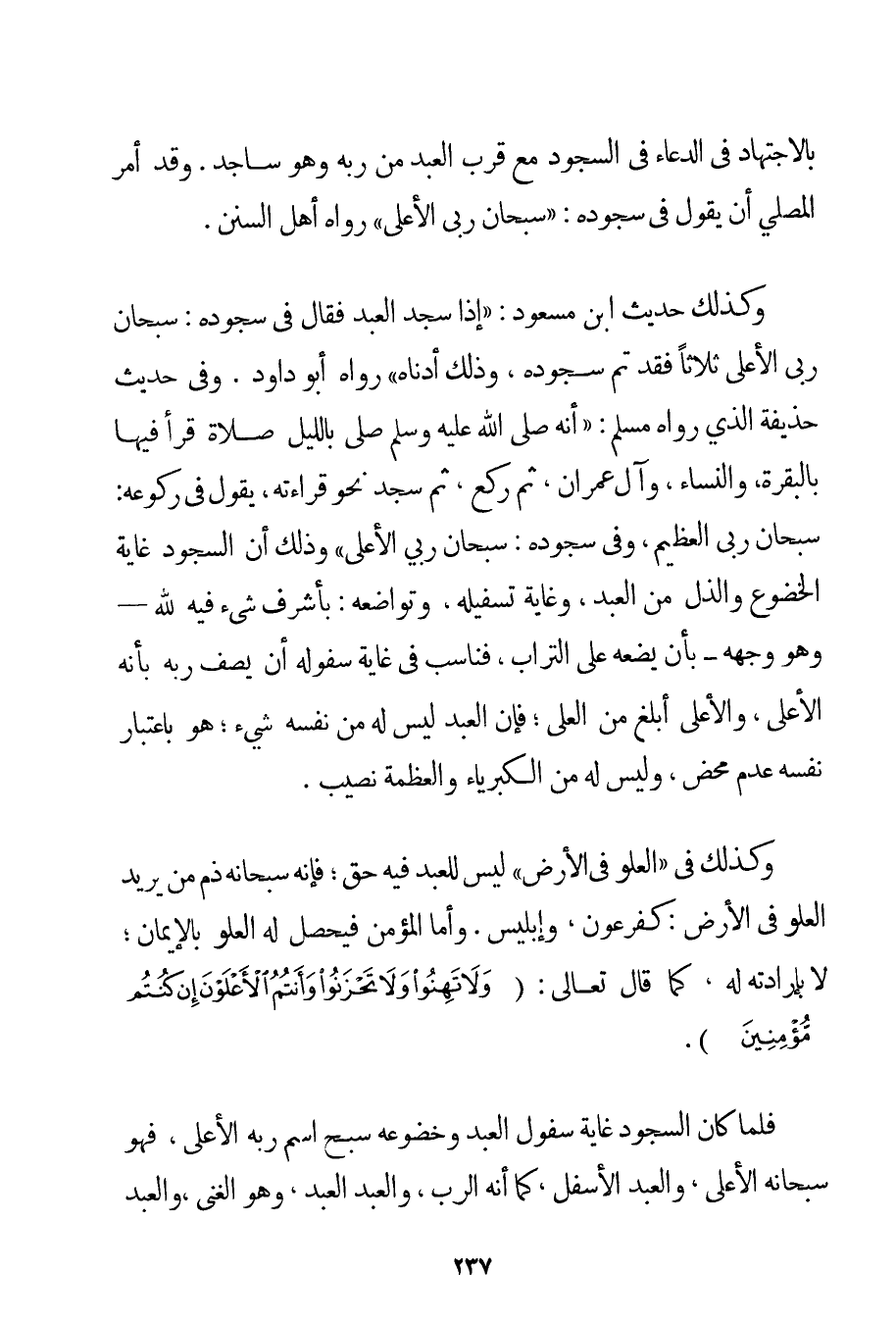 بِالِاجْتِهَادِ فِي الدُّعَاءِ فِي السُّجُودِ مَعَ قُرْبِ الْعَبْدِ مِنْ رَبِّهِ وَهُوَ سَاجِدٌ. وَقَدْ أُمِرَ الْمُصَلِّي أَنْ يَقُولَ فِي سُجُودِهِ: {سُبْحَانَ رَبِّي الْأَعْلَى} رَوَاهُ أَهْلُ السُّنَنِ. وَكَذَلِكَ حَدِيثُ ابْنِ مَسْعُودٍ: {إذَا سَجَدَ الْعَبْدُ فَقَالَ فِي سُجُودِهِ: سُبْحَانَ رَبِّي الْأَعْلَى ثَلَاثًا فَقَدْ تَمَّ سُجُودُهُ وَذَلِكَ أَدْنَاهُ} رَوَاهُ أَبُو دَاوُد. وَفِي حَدِيثِ حُذَيْفَةَ الَّذِي رَوَاهُ مُسْلِمٌ: {أَنَّهُ صَلَّى اللَّهُ عَلَيْهِ وَسَلَّمَ صَلَّى بِاللَّيْلِ صَلَاةً قَرَأَ فِيهَا بِالْبَقَرَةِ وَالنِّسَاءِ وَآلِ عِمْرَانَ ثُمَّ رَكَعَ ثُمَّ سَجَدَ نَحْوَ قِرَاءَتِهِ يَقُولُ فِي رُكُوعِهِ: سُبْحَانَ رَبِّي الْعَظِيمِ وَفِي سُجُودِهِ: سُبْحَانَ رَبِّي الْأَعْلَى} وَذَلِكَ أَنَّ السُّجُودَ غَايَةُ الْخُضُوعِ وَالذُّلِّ مِنْ الْعَبْدِ وَغَايَةُ تَسْفِيلِهِ وَتَوَاضُعِهِ: بِأَشْرَفِ شَيْءٍ فِيهِ لِلَّهِ - وَهُوَ وَجْهُهُ - بِأَنْ يَضَعَهُ عَلَى التُّرَابِ فَنَاسَبَ فِي غَايَةِ سُفُولِهِ أَنْ يَصِفَ رَبَّهُ بِأَنَّهُ الْأَعْلَى، وَالْأَعْلَى أَبْلَغُ مِنْ الْعَلِيِّ؛ فَإِنَّ الْعَبْدَ لَيْسَ لَهُ مِنْ نَفْسِهِ شَيْءٌ؛ هُوَ بِاعْتِبَارِ نَفْسِهِ عَدَمٌ مَحْضٌ وَلَيْسَ لَهُ مِنْ الْكِبْرِيَاءِ وَالْعَظَمَةِ نَصِيبٌ. وَكَذَلِكَ فِي " الْعُلُوِّ فِي الْأَرْضِ " لَيْسَ لِلْعَبْدِ فِيهِ حَقٌّ؛ فَإِنَّهُ سُبْحَانَهُ ذَمَّ مَنْ يُرِيدُ الْعُلُوَّ فِي الْأَرْضِ: كَفِرْعَوْنَ وَإِبْلِيسَ. وَأَمَّا الْمُؤْمِنُ فَيَحْصُلُ لَهُ الْعُلُوُّ بِالْإِيمَانِ؛ لَا بِإِرَادَتِهِ لَهُ كَمَا قَالَ تَعَالَى: {وَلَا تَهِنُوا وَلَا تَحْزَنُوا وَأَنْتُمُ الْأَعْلَوْنَ إنْ كُنْتُمْ مُؤْمِنِينَ} . فَلَمَّا كَانَ السُّجُودُ غَايَةَ سُفُولِ الْعَبْدِ وَخُضُوعِهِ سَبَّحَ اسْمَ رَبِّهِ الْأَعْلَى فَهُوَ سُبْحَانَهُ الْأَعْلَى وَالْعَبْدُ الْأَسْفَلُ كَمَا أَنَّهُ الرَّبُّ وَالْعَبْدُ الْعَبْدُ وَهُوَ الْغَنِيُّ وَالْعَبْدُ