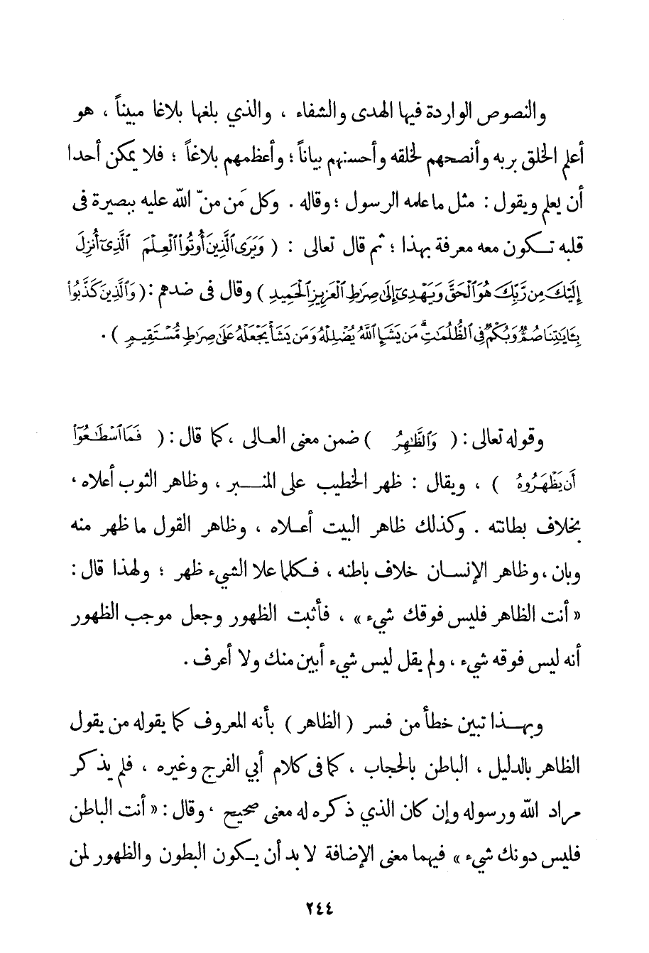 وَالنُّصُوصُ الْوَارِدَةُ فِيهَا الْهُدَى وَالشِّفَاءُ وَاَلَّذِي بَلَّغَهَا بَلَاغًا مُبِينًا هُوَ أَعْلَمُ الْخَلْقِ بِرَبِّهِ وَأَنْصَحُهُمْ لِخَلْقِهِ وَأَحْسَنُهُمْ بَيَانًا؛ وَأَعْظَمُهُمْ بَلَاغًا؛ فَلَا يُمْكِنُ أَحَدًا أَنْ يَعْلَمَ وَيَقُولَ: مِثْلَ مَا عَلِمَهُ الرَّسُولُ، وَقَالَهُ. وَكُلُّ مَنْ مَنَّ اللَّهُ عَلَيْهِ بِبَصِيرَةٍ فِي قَلْبِهِ تَكُونُ مَعَهُ مَعْرِفَةٌ بِهَذَا؛ ثُمَّ قَالَ تَعَالَى: {وَيَرَى الَّذِينَ أُوتُوا الْعِلْمَ الَّذِي أُنْزِلَ إلَيْكَ مِنْ رَبِّكَ هُوَ الْحَقَّ وَيَهْدِي إلَى صِرَاطِ الْعَزِيزِ الْحَمِيدِ} وَقَالَ فِي ضِدِّهِمْ: {وَالَّذِينَ كَذَّبُوا بِآيَاتِنَا صُمٌّ وَبُكْمٌ فِي الظُّلُمَاتِ مَنْ يَشَأِ اللَّهُ يُضْلِلْهُ وَمَنْ يَشَأْ يَجْعَلْهُ عَلَى صِرَاطٍ مُسْتَقِيمٍ} . وقَوْله تَعَالَى {الظَّاهِرُ} ضُمِّنَ مَعْنَى الْعَالِي كَمَا قَالَ: {فَمَا اسْطَاعُوا أَنْ يَظْهَرُوهُ} وَيُقَالُ: ظَهَرَ الْخَطِيبُ عَلَى الْمِنْبَرِ وَظَاهِرُ الثَّوْبِ أَعْلَاهُ بِخِلَافِ بِطَانَتِهِ. وَكَذَلِكَ ظَاهِرُ الْبَيْتِ أَعْلَاهُ وَظَاهِرُ الْقَوْلِ مَا ظَهَرَ مِنْهُ وَبَانَ وَظَاهِرُ الْإِنْسَانِ خِلَافُ بَاطِنِهِ فَكُلَّمَا عَلَا الشَّيْءُ ظَهَرَ؛ وَلِهَذَا قَالَ: {أَنْتَ الظَّاهِرُ فَلَيْسَ فَوْقَك شَيْءٌ} فَأَثْبَتَ الظُّهُورَ وَجَعَلَ مُوجِبَ الظُّهُورِ أَنَّهُ لَيْسَ فَوْقَهُ شَيْءٌ وَلَمْ يَقُلْ لَيْسَ شَيْءٌ أَبْيَنَ مِنْك وَلَا أَعْرَفَ. وَبِهَذَا تَبَيَّنَ خَطَأُ مَنْ فَسَّرَ (الظَّاهِرَ) بِأَنَّهُ الْمَعْرُوفُ كَمَا يَقُولُهُ مَنْ يَقُولُ الظَّاهِرُ بِالدَّلِيلِ الْبَاطِنِ بِالْحِجَابِ كَمَا فِي كَلَامِ أَبِي الْفَرَجِ وَغَيْرِهِ فَلَمْ يَذْكُرْ مُرَادَ اللَّهِ وَرَسُولِهِ وَإِنْ كَانَ الَّذِي ذَكَرَهُ لَهُ مَعْنًى صَحِيحٌ وَقَالَ: {أَنْتَ الْبَاطِنُ فَلَيْسَ دُونَك شَيْءٌ} فِيهِمَا مَعْنَى الْإِضَافَةِ لَا بُدَّ أَنْ يَكُونَ الْبُطُونُ وَالظُّهُورُ لِمَنْ