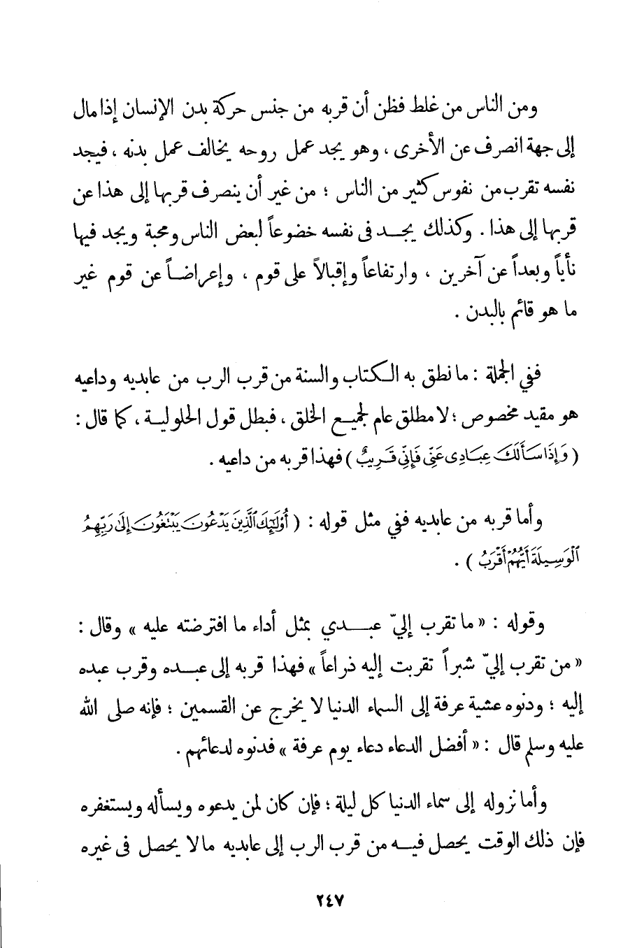 وَمِنْ النَّاسِ مَنْ غَلِطَ فَظَنَّ أَنَّ قُرْبَهُ مَنْ جِنْسِ حَرَكَةِ بَدَنِ الْإِنْسَانِ إذَا مَالَ إلَى جِهَةٍ انْصَرَفَ عَنْ الْأُخْرَى وَهُوَ يَجِدُ عَمَلَ رُوحِهِ يُخَالِفُ عَمَلَ بَدَنِهِ فَيَجِدُ نَفْسَهُ تَقْرُبُ مِنْ نُفُوسِ كَثِيرٍ مِنْ النَّاسِ؛ مِنْ غَيْرِ أَنْ يَنْصَرِفَ قُرْبُهَا إلَى هَذَا عَنْ قُرْبِهَا إلَى هَذَا. وَكَذَلِكَ يَجِدُ فِي نَفْسِهِ خُضُوعًا لِبَعْضِ النَّاسِ وَمَحَبَّةً وَيَجِدُ فِيهَا نَأْيًا وَبُعْدًا عَنْ آخَرِينَ وَارْتِفَاعًا وَإِقْبَالًا عَلَى قَوْمٍ وَإِعْرَاضًا عَنْ قَوْمٍ غَيْرَ مَا هُوَ قَائِمٌ بِالْبَدَنِ. فَفِي الْجُمْلَةِ: مَا نَطَقَ بِهِ الْكِتَابُ وَالسُّنَّةُ مِنْ قُرْبِ الرَّبِّ مِنْ عَابِدِيهِ وَدَاعِيهِ هُوَ مُقَيَّدٌ مَخْصُوصٌ؛ لَا مُطْلَقٌ عَامٌّ لِجَمِيعِ الْخَلْقِ فَبَطَلَ قَوْلُ الْحُلُولِيَّةِ كَمَا قَالَ: {وَإِذَا سَأَلَكَ عِبَادِي عَنِّي فَإِنِّي قَرِيبٌ} فَهَذَا قُرْبُهُ مِنْ دَاعِيهِ. وَأَمَّا قُرْبُهُ مِنْ عَابِدِيهِ فَفِي مِثْلِ قَوْلِهِ: {أُولَئِكَ الَّذِينَ يَدْعُونَ يَبْتَغُونَ إلَى رَبِّهِمُ الْوَسِيلَةَ أَيُّهُمْ أَقْرَبُ} . وَقَوْلُهُ: {مَا تَقَرَّبَ إلَيَّ عَبْدِي بِمِثْلِ أَدَاءِ مَا افْتَرَضْته عَلَيْهِ} وَقَالَ: {مَنْ تَقَرَّبَ إلَيَّ شِبْرًا تَقَرَّبْت إلَيْهِ ذِرَاعًا} فَهَذَا قُرْبُهُ إلَى عَبْدِهِ وَقُرْبُ عَبْدِهِ إلَيْهِ؛ وَدُنُوُّهُ عَشِيَّةَ عَرَفَةَ إلَى السَّمَاءِ الدُّنْيَا لَا يَخْرُجُ عَنْ الْقِسْمَيْنِ؛ فَإِنَّهُ صَلَّى اللَّهُ عَلَيْهِ وَسَلَّمَ قَالَ: {أَفْضَلُ الدُّعَاءِ دُعَاءُ يَوْمِ عَرَفَةَ} فَدُنُوُّهُ لِدُعَائِهِمْ. وَأَمَّا نُزُولُهُ إلَى سَمَاءِ الدُّنْيَا كُلَّ لَيْلَةٍ؛ فَإِنْ كَانَ لِمَنْ يَدْعُوهُ وَيَسْأَلُهُ وَيَسْتَغْفِرُهُ فَإِنَّ ذَلِكَ الْوَقْتَ يَحْصُلُ فِيهِ مَنْ قُرْبِ الرَّبِّ إلَى عَابِدِيهِ مَا لَا يَحْصُلُ فِي غَيْرِهِ