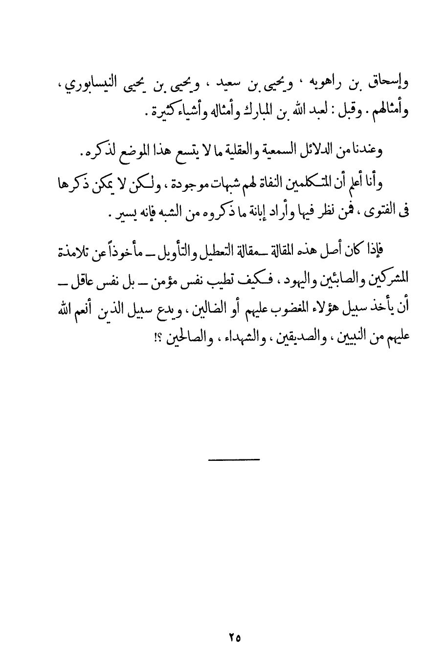 وَإِسْحَاقَ بْنِ رَاهَوَيْه وَيَحْيَى بْنِ سَعِيدٍ وَيَحْيَى بْنِ يَحْيَى النَّيْسَابُورِيِّ وَأَمْثَالِهِمْ. وَقَبْلُ: لِعَبْدِ اللَّهِ بْنِ الْمُبَارَكِ وَأَمْثَالِهِ وَأَشْيَاءُ كَثِيرَةٌ. وَعِنْدَنَا مِنْ الدَّلَائِلِ السَّمْعِيَّةِ وَالْعَقْلِيَّةِ مَا لَا يَتَّسِعُ هَذَا الْمَوْضِعُ لِذِكْرِهِ. وَأَنَا أَعْلَمُ أَنَّ الْمُتَكَلِّمِينَ الْنُّفَاةِ لَهُمْ شُبُهَاتٌ مَوْجُودَةٌ وَلَكِنْ لَا يُمْكِنُ ذِكْرُهَا فِي الْفَتْوَى فَمَنْ نَظَرَ فِيهَا وَأَرَادَ إبَانَةَ مَا ذَكَرُوهُ مِنْ الشُّبَهِ فَإِنَّهُ يَسِيرٌ. فَإِذَا كَانَ أَصْلُ هَذِهِ الْمَقَالَةِ - مَقَالَةِ التَّعْطِيلِ وَالتَّأْوِيلِ - مَأْخُوذًا عَنْ تَلَامِذَةِ الْمُشْرِكِينَ وَالصَّابِئِينَ وَالْيَهُودِ فَكَيْفَ تَطِيبُ نَفْسُ مُؤْمِنٍ - بَلْ نَفْسُ عَاقِلٍ - أَنْ يَأْخُذَ سَبِيلَ هَؤُلَاءِ الْمَغْضُوبِ عَلَيْهِمْ أَوْ الضَّالِّينَ وَيَدَعَ سَبِيلَ الَّذِينَ أَنْعَمَ اللَّهُ عَلَيْهِمْ مِنْ النَّبِيِّينَ وَالصِّدِّيقِينَ وَالشُّهَدَاءِ وَالصَّالِحِينَ.