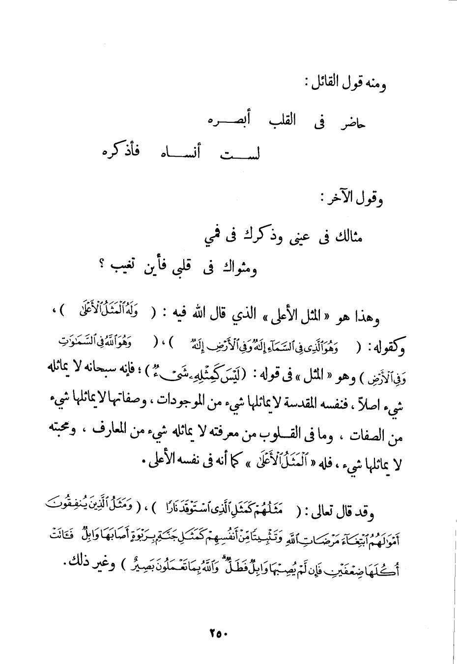 وَهَذَا هُوَ " الْمَثَلُ الْأَعْلَى " الَّذِي قَالَ اللَّهُ فِيهِ: {وَلَهُ الْمَثَلُ الْأَعْلَى} وَكَقَوْلِهِ: {وَهُوَ الَّذِي فِي السَّمَاءِ إلَهٌ وَفِي الْأَرْضِ إلَهٌ} {وَهُوَ اللَّهُ فِي السَّمَاوَاتِ وَفِي الْأَرْضِ} وَهُوَ " الْمَثَلُ " فِي قَوْلِهِ: {لَيْسَ كَمِثْلِهِ شَيْءٌ} فَإِنَّهُ سُبْحَانَهُ لَا يُمَاثِلُهُ شَيْءٌ أَصْلًا فَنَفْسُهُ الْمُقَدَّسَةُ لَا يُمَاثِلُهَا شَيْءٌ مِنْ الْمَوْجُودَاتِ وَصِفَاتُهَا لَا يُمَاثِلُهَا شَيْءٌ مِنْ الصِّفَاتِ وَمَا فِي الْقُلُوبِ مِنْ مَعْرِفَتِهِ لَا يُمَاثِلُهُ شَيْءٌ مِنْ الْمَعَارِفِ وَمَحَبَّتُهُ لَا يُمَاثِلُهَا شَيْءٌ فَلَهُ " الْمَثَلُ الْأَعْلَى " كَمَا أَنَّهُ فِي نَفْسِهِ الْأَعْلَى. وَقَدْ قَالَ تَعَالَى: {مَثَلُهُمْ كَمَثَلِ الَّذِي اسْتَوْقَدَ نَارًا} {وَمَثَلُ الَّذِينَ يُنْفِقُونَ أَمْوَالَهُمُ ابْتِغَاءَ مَرْضَاةِ اللَّهِ وَتَثْبِيتًا مِنْ أَنْفُسِهِمْ كَمَثَلِ جَنَّةٍ بِرَبْوَةٍ أَصَابَهَا وَابِلٌ فَآتَتْ أُكُلَهَا ضِعْفَيْنِ فَإِنْ لَمْ يُصِبْهَا وَابِلٌ فَطَلٌّ وَاللَّهُ بِمَا تَعْمَلُونَ بَصِيرٌ} وَغَيْرُ ذَلِكَ.
