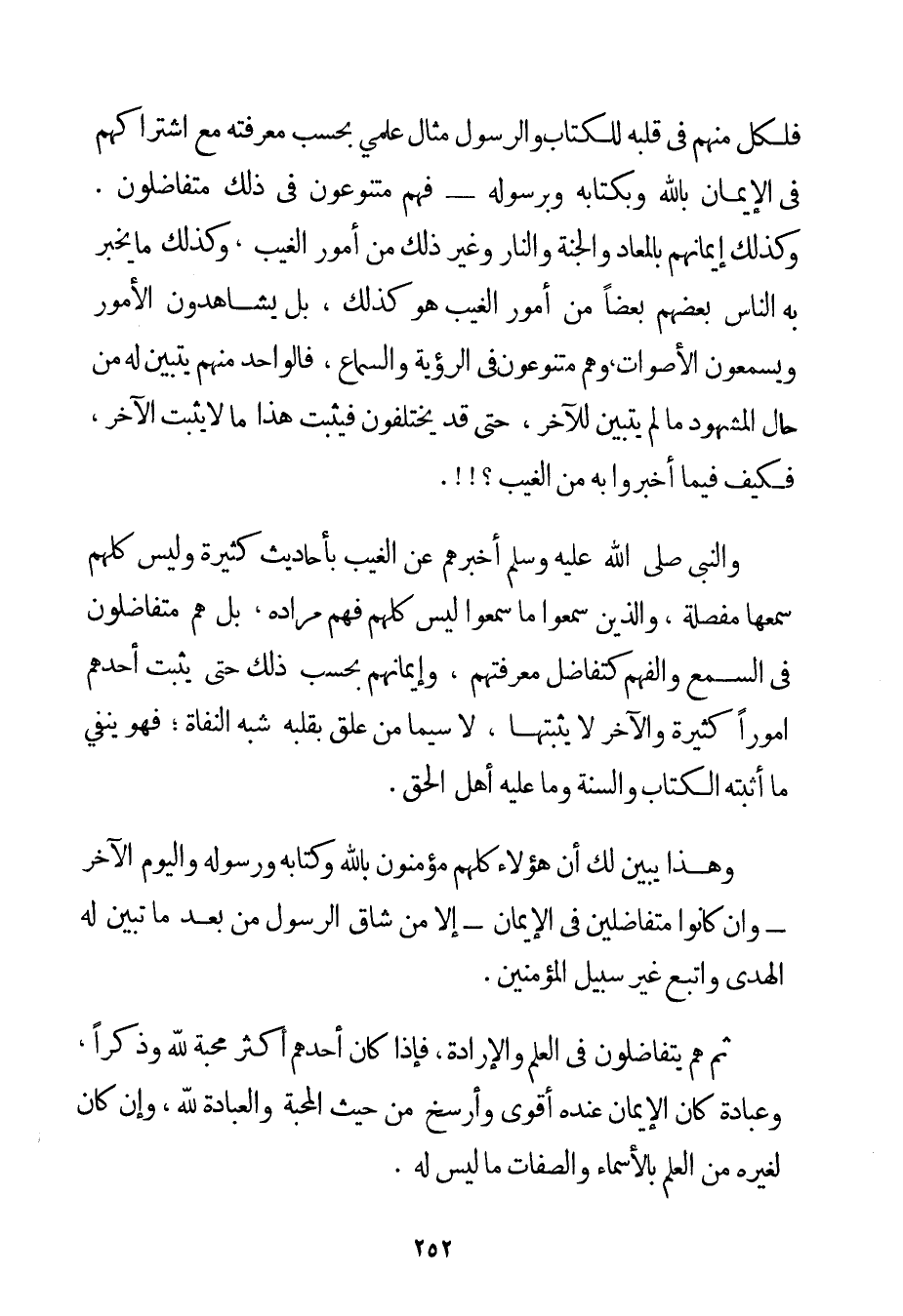 فَلِكُلِّ مِنْهُمْ فِي قَلْبِهِ لِلْكِتَابِ وَالرَّسُولِ مِثَالٌ عِلْمِيٌّ بِحَسَبِ مَعْرِفَتِهِ مَعَ اشْتِرَاكِهِمْ فِي الْإِيمَانِ بِاَللَّهِ وَبِكِتَابِهِ وَبِرَسُولِهِ - فَهُمْ مُتَنَوِّعُونَ فِي ذَلِكَ مُتَفَاضِلُونَ. وَكَذَلِكَ إيمَانُهُمْ بِالْمَعَادِ وَالْجَنَّةِ وَالنَّارِ وَغَيْرِ ذَلِكَ مِنْ أُمُورِ الْغَيْبِ وَكَذَلِكَ مَا يُخْبِرُ بِهِ النَّاسُ بَعْضُهُمْ بَعْضًا مِنْ أُمُورِ الْغَيْبِ هُوَ كَذَلِكَ بَلْ يُشَاهِدُونَ الْأُمُورَ وَيَسْمَعُونَ الْأَصْوَاتَ وَهُمْ مُتَنَوِّعُونَ فِي الرُّؤْيَةِ وَالسَّمَاعِ فَالْوَاحِدُ مِنْهُمْ يَتَبَيَّنُ لَهُ مَنْ حَالِ الْمَشْهُودِ مَا لَمْ يَتَبَيَّنْ لِلْآخَرِ حَتَّى قَدْ يَخْتَلِفُونَ فَيُثْبِتُ هَذَا مَا لَا يُثْبِتُ الْآخَرُ فَكَيْفَ فِيمَا أُخْبِرُوا بِهِ مِنْ الْغَيْبِ. وَالنَّبِيُّ صَلَّى اللَّهُ عَلَيْهِ وَسَلَّمَ أَخْبَرَهُمْ عَنْ الْغَيْبِ بِأَحَادِيثَ كَثِيرَةٍ وَلَيْسَ كُلُّهُمْ سَمِعَهَا مُفَصَّلَةً وَاَلَّذِينَ سَمِعُوا مَا سَمِعُوا لَيْسَ كُلُّهُمْ فَهِمَ مُرَادَهُ بَلْ هُمْ مُتَفَاضِلُونَ فِي السَّمْعِ وَالْفَهْمِ كَتَفَاضُلِ مَعْرِفَتِهِمْ وَإِيمَانِهِمْ بِحَسَبِ ذَلِكَ حَتَّى يُثْبِتَ أَحَدُهُمْ أُمُورًا كَثِيرَةً وَالْآخَرُ لَا يُثْبِتُهَا لَا سِيَّمَا مَنْ عَلِقَ بِقَلْبِهِ شُبَهُ الْنُّفَاةِ؛ فَهُوَ يَنْفِي مَا أَثْبَتَهُ الْكِتَابُ وَالسُّنَّةُ وَمَا عَلَيْهِ أَهْلُ الْحَقِّ. وَهَذَا يُبَيِّنُ لَك أَنَّ هَؤُلَاءِ كُلَّهُمْ مُؤْمِنُونَ بِاَللَّهِ وَكِتَابِهِ وَرَسُولِهِ وَالْيَوْمِ الْآخِرِ - وَإِنْ كَانُوا مُتَفَاضِلِينَ فِي الْإِيمَانِ - إلَّا مَنْ شَاقَّ الرَّسُولَ مِنْ بَعْدِ مَا تَبَيَّنَ لَهُ الْهُدَى وَاتَّبَعَ غَيْرَ سَبِيلِ الْمُؤْمِنِينَ. ثُمَّ هُمْ يَتَفَاضَلُونَ فِي الْعِلْمِ وَالْإِرَادَةِ فَإِذَا كَانَ أَحَدُهُمْ أَكْثَرَ مَحَبَّةً لِلَّهِ وَذِكْرًا وَعِبَادَةً كَانَ الْإِيمَانُ عِنْدَهُ أَقْوَى وَأَرْسَخَ مِنْ حَيْثُ الْمَحَبَّةُ وَالْعِبَادَةُ لِلَّهِ وَإِنْ كَانَ لِغَيْرِهِ مِنْ الْعِلْمِ بِالْأَسْمَاءِ وَالصِّفَاتِ مَا لَيْسَ لَهُ.