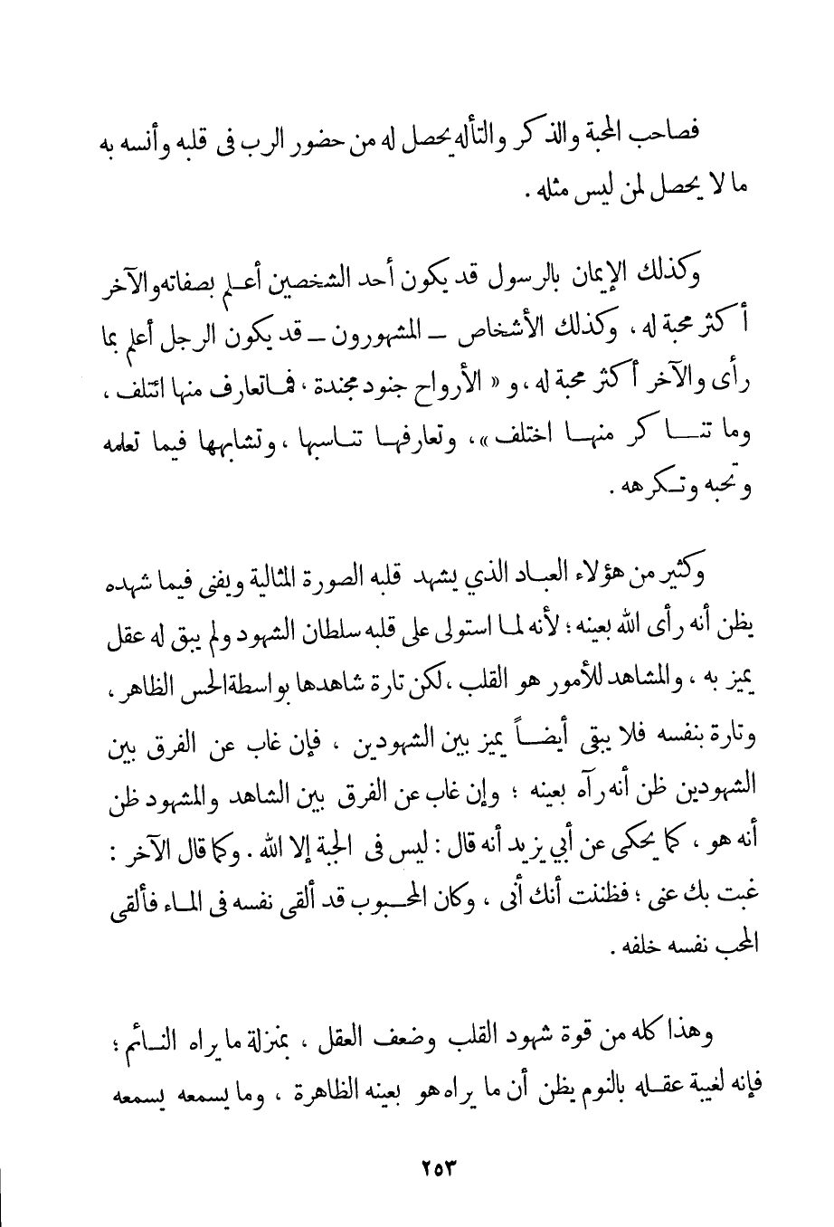 فَصَاحِبُ الْمَحَبَّةِ وَالذِّكْرِ وَالتَّأَلُّهِ يَحْصُلُ لَهُ مِنْ حُضُورِ الرَّبِّ فِي قَلْبِهِ وَأُنْسِهِ بِهِ مَا لَا يَحْصُلُ لِمَنْ لَيْسَ مِثْلَهُ. وَكَذَلِكَ الْإِيمَانُ بِالرَّسُولِ قَدْ يَكُونُ أَحَدُ الشَّخْصَيْنِ أَعْلَمَ بِصِفَاتِهِ وَالْآخَرُ أَكْثَرَ مَحَبَّةً لَهُ وَكَذَلِكَ الْأَشْخَاصُ - الْمَشْهُورُونَ - قَدْ يَكُونُ الرَّجُلُ أَعْلَمَ بِمَا رَأَى وَالْآخَرُ أَكْثَرَ مَحَبَّةً لَهُ وَ {الْأَرْوَاحُ جُنُودٌ مُجَنَّدَةٌ فَمَا تَعَارَفَ مِنْهَا ائْتَلَفَ وَمَا تَنَاكَرَ مِنْهَا اخْتَلَفَ} وَتَعَارُفُهَا تَنَاسُبُهَا وَتَشَابُهُهَا فِيمَا تَعْلَمُهُ وَتُحِبُّهُ وَتَكْرَهُهُ. وَكَثِيرٌ مِنْ هَؤُلَاءِ الْعِبَادِ الَّذِي يَشْهَدُ قَلْبُهُ الصُّورَةَ الْمِثَالِيَّةَ وَيَفْنَى فِيمَا شَهِدَهُ يَظُنُّ أَنَّهُ رَأَى اللَّهَ بِعَيْنِهِ؛ لِأَنَّهُ لَمَّا اسْتَوْلَى عَلَى قَلْبِهِ سُلْطَانُ الشُّهُودِ وَلَمْ يَبْقَ لَهُ عَقْلٌ يُمَيِّزُ بِهِ وَالْمُشَاهِدُ لِلْأُمُورِ هُوَ الْقَلْبُ لَكِنْ تَارَةً شَاهَدَهَا بِوَاسِطَةِ الْحِسِّ الظَّاهِرِ وَتَارَةً بِنَفْسِهِ فَلَا يَبْقَى أَيْضًا يُمَيِّزُ بَيْنَ الشهودين فَإِنْ غَابَ عَنْ الْفَرْقِ بَيْنَ الشهودين ظَنَّ أَنَّهُ رَآهُ بِعَيْنِهِ؛ وَإِنْ غَابَ عَنْ الْفَرْقِ بَيْنَ الشَّاهِدِ وَالْمَشْهُودِ ظَنَّ أَنَّهُ هُوَ كَمَا يُحْكَى عَنْ أَبِي يَزِيدَ أَنَّهُ قَالَ: لَيْسَ فِي الْجُبَّةِ إلَّا اللَّهُ. وَكَمَا قَالَ الْآخَرُ: غِبْت بِك عَنِّي؛ فَظَنَنْت أَنَّك أَنِّي وَكَانَ الْمَحْبُوبُ قَدْ أَلْقَى نَفْسَهُ فِي الْمَاءِ فَأَلْقَى الْمُحِبُّ نَفْسَهُ خَلْفَهُ. وَهَذَا كُلُّهُ مِنْ قُوَّةِ شُهُودِ الْقَلْبِ وَضَعْفِ الْعَقْلِ بِمَنْزِلَةِ مَا يَرَاهُ النَّائِمُ؛ فَإِنَّهُ لِغَيْبَةِ عَقْلِهِ بِالنَّوْمِ يَظُنُّ أَنَّ مَا يَرَاهُ هُوَ بِعَيْنِهِ الظَّاهِرَةِ وَمَا يَسْمَعُهُ يَسْمَعُهُ