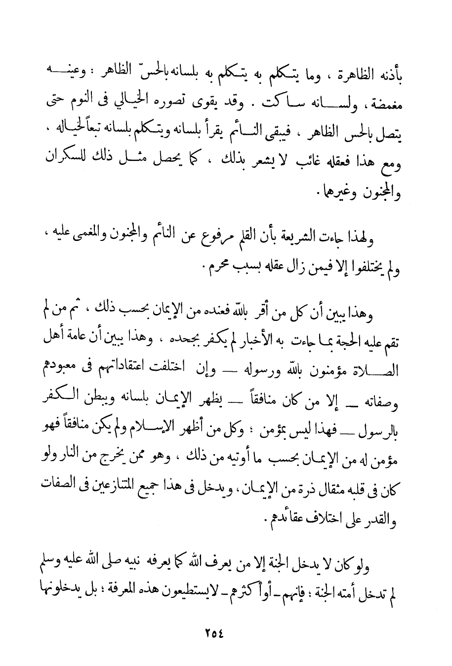 بِأُذُنِهِ الظَّاهِرَةِ وَمَا يَتَكَلَّمُ بِهِ يَتَكَلَّمُ بِهِ بِلِسَانِهِ بِالْحِسِّ الظَّاهِرِ؛ وَعَيْنُهُ مُغْمَضَةٌ وَلِسَانُهُ سَاكِتٌ. وَقَدْ يَقْوَى تَصَوُّرُهُ الْخَيَالِيُّ فِي النَّوْمِ حَتَّى يَتَّصِلَ بِالْحِسِّ الظَّاهِرِ فَيَبْقَى النَّائِمُ يَقْرَأُ بِلِسَانِهِ وَيَتَكَلَّمُ بِلِسَانِهِ تَبَعًا لِخَيَالِهِ وَمَعَ هَذَا فَعَقْلُهُ غَائِبٌ لَا يَشْعُرُ بِذَلِكَ كَمَا يَحْصُلُ مِثْلُ ذَلِكَ لِلسَّكْرَانِ وَالْمَجْنُونِ وَغَيْرِهِمَا. وَلِهَذَا جَاءَتْ الشَّرِيعَةُ بِأَنَّ الْقَلَمَ مَرْفُوعٌ عَنْ النَّائِمِ وَالْمَجْنُونِ وَالْمُغْمَى عَلَيْهِ وَلَمْ يَخْتَلِفُوا إلَّا فِيمَنْ زَالَ عَقْلُهُ بِسَبَبِ مُحَرَّمٍ. وَهَذَا يُبَيِّنُ أَنَّ كُلَّ مَنْ أَقَرَّ بِاَللَّهِ فَعِنْدَهُ مِنْ الْإِيمَانِ بِحَسَبِ ذَلِكَ ثُمَّ مَنْ لَمْ تَقُمْ عَلَيْهِ الْحُجَّةُ بِمَا جَاءَتْ بِهِ الْأَخْبَارُ لَمْ يَكْفُرْ بِجَحْدِهِ وَهَذَا يُبَيِّنُ أَنَّ عَامَّةَ أَهْلِ الصَّلَاةِ مُؤْمِنُونَ بِاَللَّهِ وَرَسُولِهِ - وَإِنْ اخْتَلَفَتْ اعْتِقَادَاتُهُمْ فِي مَعْبُودِهِمْ وَصِفَاتِهِ - إلَّا مَنْ كَانَ مُنَافِقًا - يُظْهِرُ الْإِيمَانَ بِلِسَانِهِ وَيُبْطِنُ الْكُفْرَ بِالرَّسُولِ - فَهَذَا لَيْسَ بِمُؤْمِنِ؛ وَكُلُّ مَنْ أَظْهَرَ الْإِسْلَامَ وَلَمْ يَكُنْ مُنَافِقًا فَهُوَ مُؤْمِنٌ لَهُ مِنْ الْإِيمَانِ بِحَسَبِ مَا أوتيه مِنْ ذَلِكَ وَهُوَ مِمَّنْ يَخْرُجُ مِنْ النَّارِ وَلَوْ كَانَ فِي قَلْبِهِ مِثْقَالُ ذَرَّةٍ مِنْ الْإِيمَانِ وَيَدْخُلُ فِي هَذَا جَمِيعُ الْمُتَنَازِعِينَ فِي الصِّفَاتِ وَالْقَدَرِ عَلَى اخْتِلَافِ عَقَائِدِهِمْ. وَلَوْ كَانَ لَا يَدْخُلُ الْجَنَّةَ إلَّا مَنْ يَعْرِفُ اللَّهَ كَمَا يَعْرِفُهُ نَبِيُّهُ صَلَّى اللَّهُ عَلَيْهِ وَسَلَّمَ لَمْ تَدْخُلْ أُمَّتُهُ الْجَنَّةَ؛ فَإِنَّهُمْ - أَوْ أَكْثَرُهُمْ - لَا يَسْتَطِيعُونَ هَذِهِ الْمَعْرِفَةَ؛ بَلْ يَدْخُلُونَهَا