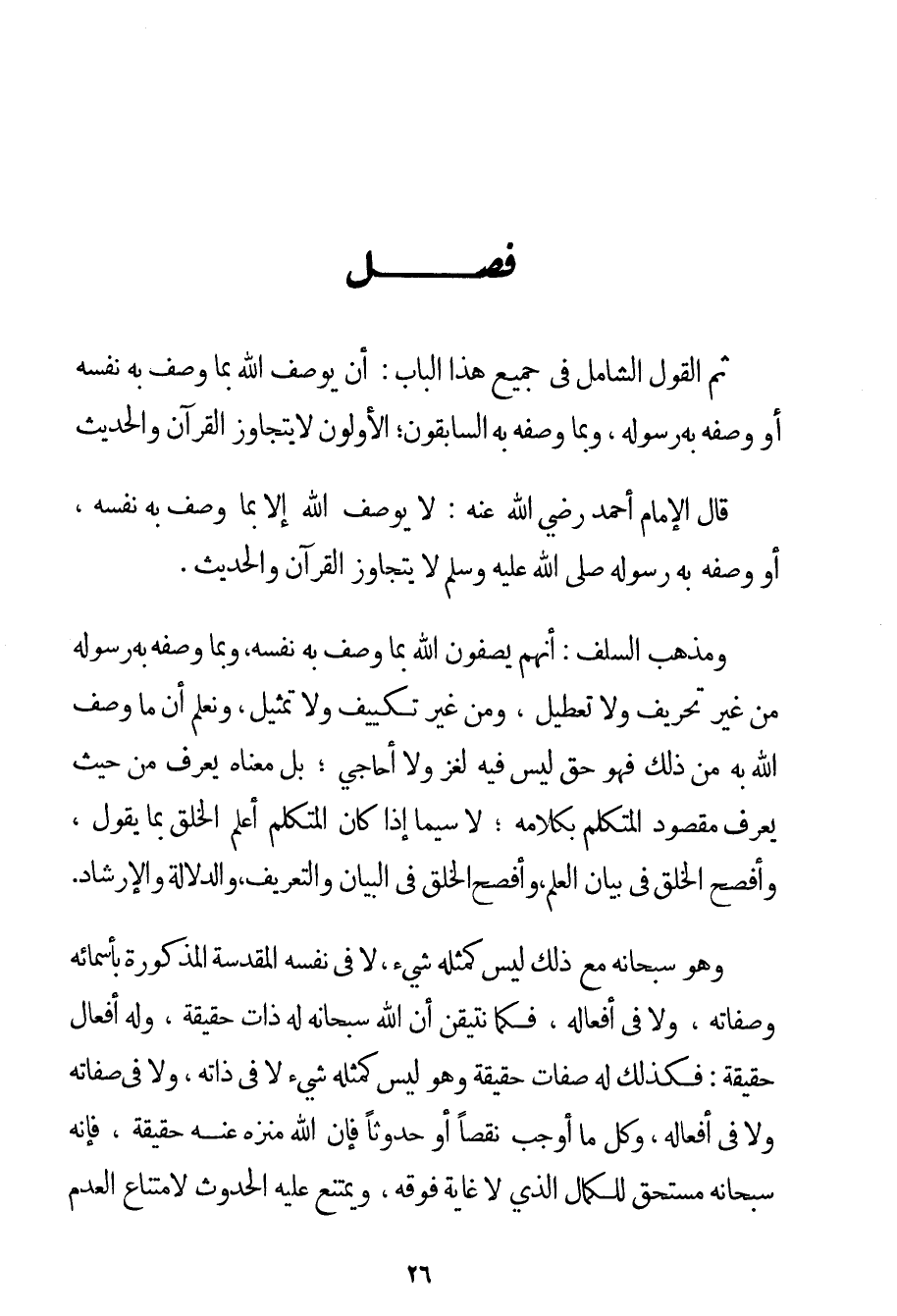 ثُمَّ الْقَوْلُ الشَّامِلُ فِي جَمِيعِ هَذَا الْبَابِ: أَنْ يُوصَفَ اللَّهُ بِمَا وَصَفَ بِهِ نَفْسَهُ أَوْ وَصَفَهُ بِهِ رَسُولُهُ وَبِمَا وَصَفَهُ بِهِ السَّابِقُونَ؛ الْأَوَّلُونَ لَا يَتَجَاوَزُ الْقُرْآنَ وَالْحَدِيثَ قَالَ الْإِمَامُ أَحْمَد رَضِيَ اللَّهُ عَنْهُ لَا يُوصَفُ اللَّهُ إلَّا بِمَا وَصَفَ بِهِ نَفْسَهُ أَوْ وَصَفَهُ بِهِ رَسُولُهُ صَلَّى اللَّهُ عَلَيْهِ وَسَلَّمَ لَا يَتَجَاوَزُ الْقُرْآنَ وَالْحَدِيثَ. وَمَذْهَبُ السَّلَفِ: أَنَّهُمْ يَصِفُونَ اللَّهَ بِمَا وَصَفَ بِهِ نَفْسَهُ وَبِمَا وَصَفَهُ بِهِ رَسُولُهُ مِنْ غَيْرِ تَحْرِيفٍ وَلَا تَعْطِيلٍ وَمِنْ غَيْرِ تَكْيِيفٍ وَلَا تَمْثِيلٍ وَنَعْلَمُ أَنَّ مَا وُصِفَ اللَّهُ بِهِ مِنْ ذَلِكَ فَهُوَ حَقٌّ لَيْسَ فِيهِ لُغْزٌ وَلَا أَحَاجِيٌّ؛ بَلْ مَعْنَاهُ يُعْرَفُ مِنْ حَيْثُ يُعْرَفُ مَقْصُودُ الْمُتَكَلِّمِ بِكَلَامِهِ؛ لَا سِيَّمَا إذَا كَانَ الْمُتَكَلِّمُ أَعْلَمَ الْخَلْقِ بِمَا يَقُولُ وَأَفْصَحَ الْخَلْقِ فِي بَيَانِ الْعِلْمِ وَأَفْصَحَ الْخَلْقِ فِي الْبَيَانِ وَالتَّعْرِيفِ وَالدَّلَالَةِ وَالْإِرْشَادِ. وَهُوَ سُبْحَانَهُ مَعَ ذَلِكَ لَيْسَ كَمِثْلِهِ شَيْءٌ لَا فِي نَفْسِهِ الْمُقَدَّسَةِ الْمَذْكُورَةِ بِأَسْمَائِهِ وَصِفَاتِهِ وَلَا فِي أَفْعَالِهِ فَكَمَا نَتَيَقَّنُ أَنَّ اللَّهَ سُبْحَانَهُ لَهُ ذَاتٌ حَقِيقَةً وَلَهُ أَفْعَالٌ حَقِيقَةً: فَكَذَلِكَ لَهُ صِفَاتٌ حَقِيقَةً وَهُوَ لَيْسَ كَمِثْلِهِ شَيْءٌ لَا فِي ذَاتِهِ وَلَا فِي صِفَاتِهِ وَلَا فِي أَفْعَالِهِ وَكُلُّ مَا أَوْجَبَ نَقْصًا أَوْ حُدُوثًا فَإِنَّ اللَّهَ مُنَزَّهٌ عَنْهُ حَقِيقَةً فَإِنَّهُ سُبْحَانَهُ مُسْتَحِقٌّ لِلْكَمَالِ الَّذِي لَا غَايَةَ فَوْقَهُ وَيَمْتَنِعُ عَلَيْهِ الْحُدُوثُ لِامْتِنَاعِ الْعَدَمِ