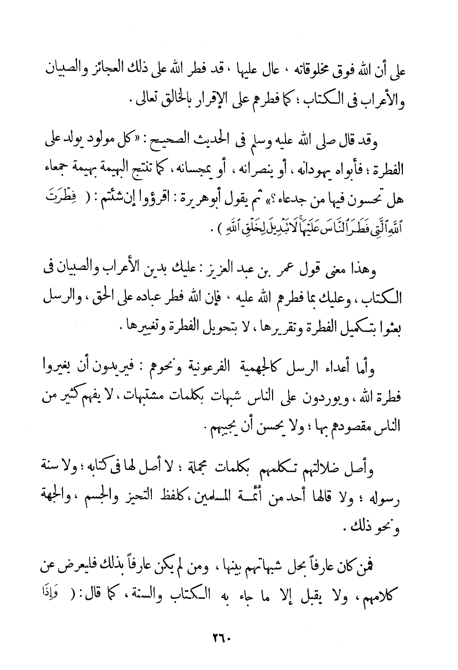 عَلَى أَنَّ اللَّهَ فَوْقَ مَخْلُوقَاتِهِ عَالٍ عَلَيْهَا قَدْ فَطَرَ اللَّهُ عَلَى ذَلِكَ الْعَجَائِزَ وَالصِّبْيَانَ وَالْأَعْرَابَ فِي الْكُتَّابِ؛ كَمَا فَطَرَهُمْ عَلَى الْإِقْرَارِ بِالْخَالِقِ تَعَالَى. وَقَدْ قَالَ صَلَّى اللَّهُ عَلَيْهِ وَسَلَّمَ فِي الْحَدِيثِ الصَّحِيحِ: {كُلُّ مَوْلُودٍ يُولَدُ عَلَى الْفِطْرَةِ؛ فَأَبَوَاهُ يُهَوِّدَانِهِ أَوْ يُنَصِّرَانِهِ أَوْ يُمَجِّسَانِهِ كَمَا تُنْتِجُ الْبَهِيمَةُ بَهِيمَةً جَمْعَاءَ هَلْ تُحِسُّونَ فِيهَا مِنْ جَدْعَاءَ؟} ثُمَّ يَقُولُ أَبُو هُرَيْرَةَ: اقْرَءُوا إنْ شِئْتُمْ: {فِطْرَةَ اللَّهِ الَّتِي فَطَرَ النَّاسَ عَلَيْهَا لَا تَبْدِيلَ لِخَلْقِ اللَّهِ} . وَهَذَا مَعْنَى قَوْلِ عُمَرَ بْنِ عَبْدِ الْعَزِيزِ: عَلَيْك بِدِينِ الْأَعْرَابِ وَالصِّبْيَانِ فِي الْكُتَّابِ وَعَلَيْك بِمَا فَطَرَهُمْ اللَّهُ عَلَيْهِ فَإِنَّ اللَّهَ فَطَرَ عِبَادَهُ عَلَى الْحَقِّ وَالرُّسُلُ بُعِثُوا بِتَكْمِيلِ الْفِطْرَةِ وَتَقْرِيرِهَا لَا بِتَحْوِيلِ الْفِطْرَةِ وَتَغْيِيرِهَا. وَأَمَّا أَعْدَاءُ الرُّسُلِ كالْجَهْمِيَّة الْفِرْعَوْنِيَّةِ وَنَحْوِهِمْ: فَيُرِيدُونَ أَنْ يُغَيِّرُوا فِطْرَةَ اللَّهِ وَيُورِدُونَ عَلَى النَّاسِ شُبُهَاتٍ بِكَلِمَاتِ مُشْتَبِهَاتٍ لَا يَفْهَمُ كَثِيرٌ مِنْ النَّاسِ مَقْصُودَهُمْ بِهَا؛ وَلَا يَحْسُنُ أَنْ يُجِيبَهُمْ. وَأَصْلُ ضَلَالَتِهِمْ تَكَلُّمُهُمْ بِكَلِمَاتِ مُجْمَلَةٍ؛ لَا أَصْلَ لَهَا فِي كِتَابِهِ؛ وَلَا سُنَّةِ رَسُولِهِ؛ وَلَا قَالَهَا أَحَدٌ مِنْ أَئِمَّةِ الْمُسْلِمِينَ كَلَفْظِ التَّحَيُّزِ وَالْجِسْمِ وَالْجِهَةِ وَنَحْوِ ذَلِكَ. فَمَنْ كَانَ عَارِفًا بِحَلِّ شُبُهَاتِهِمْ بَيَّنَهَا وَمَنْ لَمْ يَكُنْ عَارِفًا بِذَلِكَ فَلْيُعْرِضْ عَنْ كَلَامِهِمْ وَلَا يَقْبَلْ إلَّا مَا جَاءَ بِهِ الْكِتَابُ وَالسُّنَّةُ كَمَا قَالَ: {وَإِذَا رَأَيْتَ الَّذِينَ