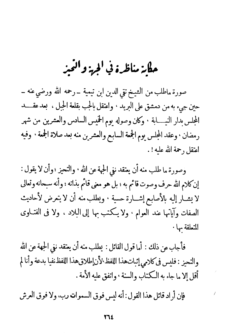 صُورَةُ مَا طُلِبَ مِنْ الشَّيْخِ تَقِيِّ الدِّينِ ابْنِ تَيْمِيَّة - رَحِمَهُ اللَّهُ وَرَضِيَ عَنْهُ - حِينَ جِيءَ بِهِ مِنْ دِمَشْقَ عَلَى الْبَرِيدِ وَاعْتُقِلَ بِالْجُبِّ بِقَلْعَةِ الْجَبَلِ بَعْدَ عَقْدِ الْمَجْلِسِ بِدَارِ النِّيَابَةِ وَكَانَ وُصُولُهُ يَوْمَ الْخَمِيسِ السَّادِسِ وَالْعِشْرِينَ مِنْ شَهْرِ رَمَضَانَ وَعُقِدَ الْمَجْلِسُ يَوْمَ الْجُمُعَةِ السَّابِعِ وَالْعِشْرِينَ مِنْهُ بَعْدَ صَلَاةِ الْجُمُعَةِ وَفِيهِ اُعْتُقِلَ رَحْمَةُ اللَّهِ عَلَيْهِ. وَصُورَةُ مَا طُلِبَ مِنْهُ أَنْ يَعْتَقِدَ نَفْيَ الْجِهَةِ عَنْ اللَّهِ وَالتَّحَيُّزِ؛ وَأَنْ لَا يَقُولَ: إنَّ كَلَامَ اللَّهِ حَرْفٌ وَصَوْتٌ قَائِمٌ بِهِ؛ بَلْ هُوَ مَعْنًى قَائِمٌ بِذَاتِهِ؛ وَأَنَّهُ سُبْحَانَهُ وَتَعَالَى لَا يُشَارُ إلَيْهِ بِالْأَصَابِعِ إشَارَةً حِسِّيَّةً وَيُطْلَبُ مِنْهُ أَنْ لَا يَتَعَرَّضَ لِأَحَادِيثِ الصِّفَاتِ وَآيَاتِهَا عِنْدَ الْعَوَامِّ وَلَا يَكْتُبُ بِهَا إلَى الْبِلَادِ وَلَا فِي الْفَتَاوَى الْمُتَعَلِّقَةِ بِهَا.