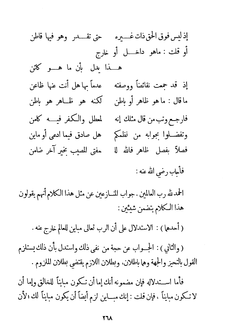 وَالثَّانِي: الْجَوَابُ عَنْ حُجَّةِ مَنْ نَفَى ذَلِكَ وَاسْتَدَلَّ بِأَنَّ ذَلِكَ يَسْتَلْزِمُ الْقَوْلَ بِالتَّحَيُّزِ وَالْجِهَةِ وَهُمَا بَاطِلَانِ وَبُطْلَانُ اللَّازِمِ يَقْتَضِي بُطْلَانَ الْمَلْزُومِ. فَأَمَّا اسْتِدْلَالُهُ فَإِنَّ مَضْمُونَهُ أَنَّك إمَّا أَنْ تَكُونَ مُبَايِنًا لِلْخَالِقِ وَإِمَّا أَنْ لَا تَكُونَ مُبَايِنًا فَإِنْ قُلْت: إنَّك مُبَايِنٌ لَزِمَ أَيْضًا أَنْ يَكُونَ مُبَايِنًا لَك؛ لِأَنَّ